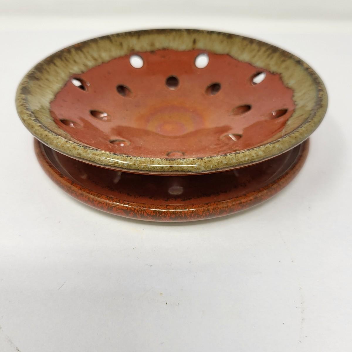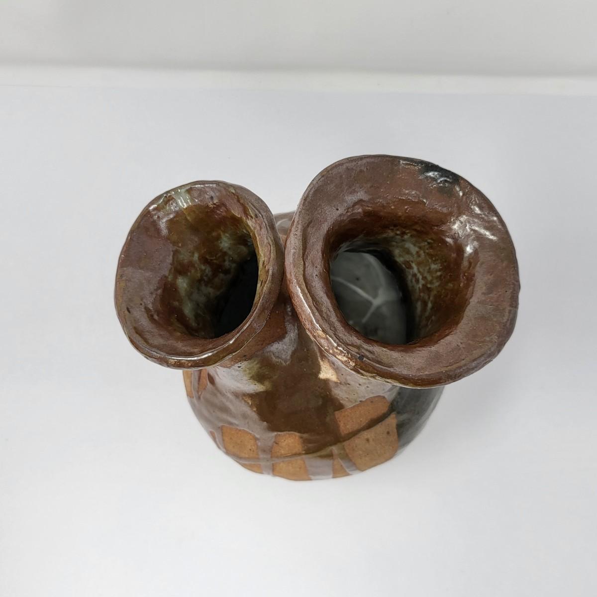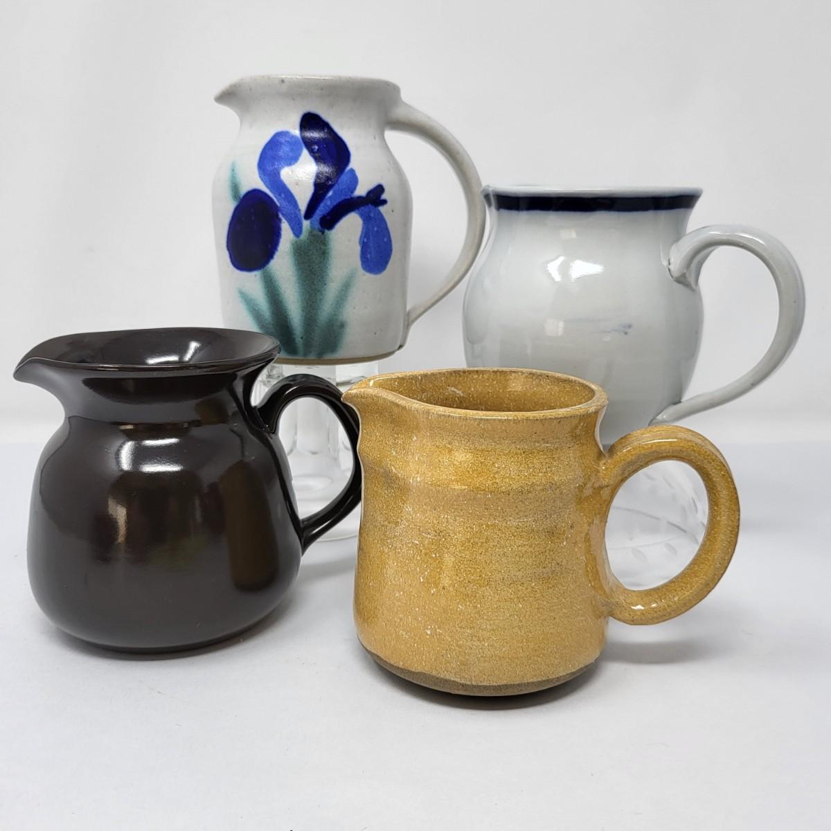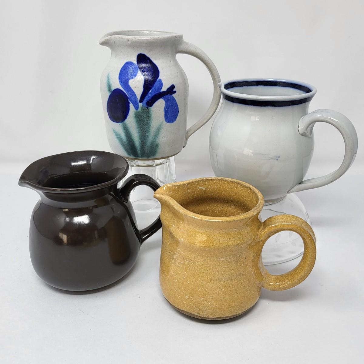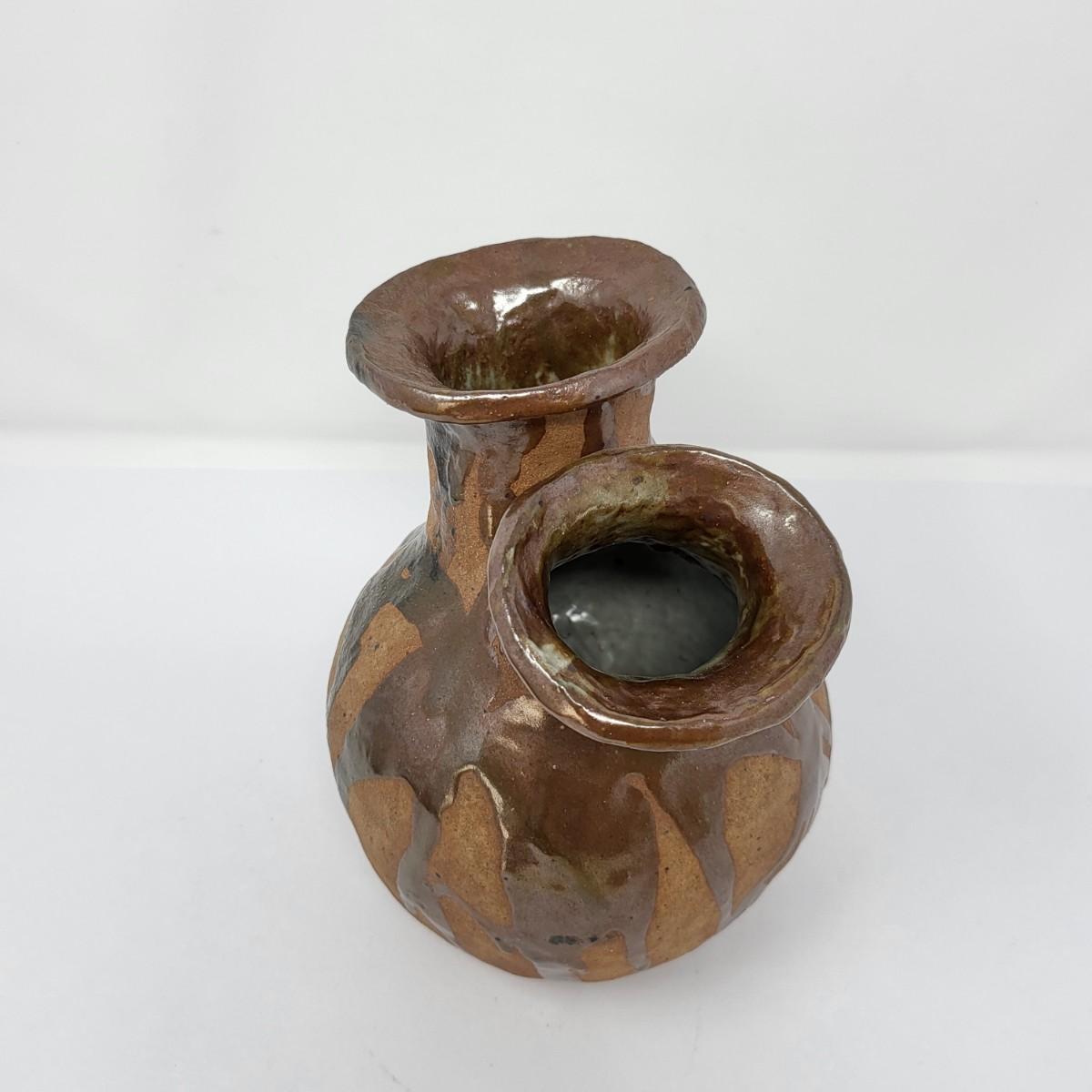 Double vase/jug drip glaze 7" x 6.5". Small round lidded box 2.5" x 1.5". Perforated dish 5.5" diameter. A 6" glazed bowl with heart shape pattern. Four pottery creamer/pitchers ranging in size from 3" tall to 4.75" tall.