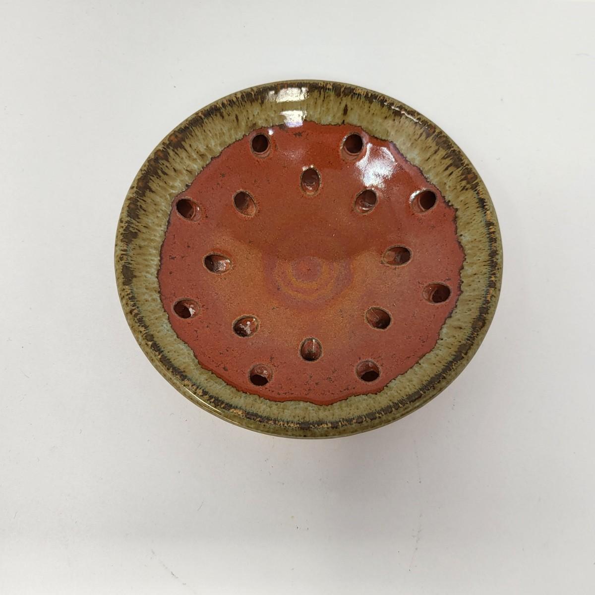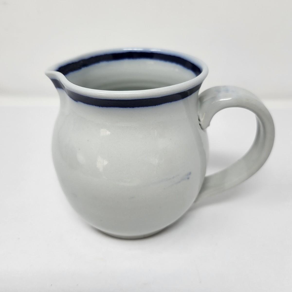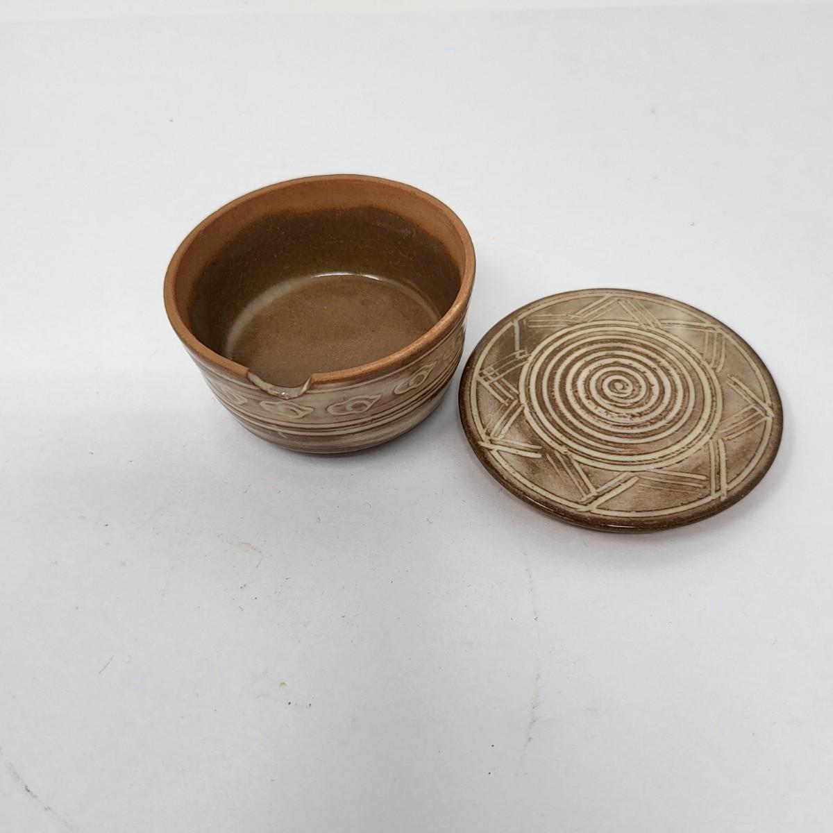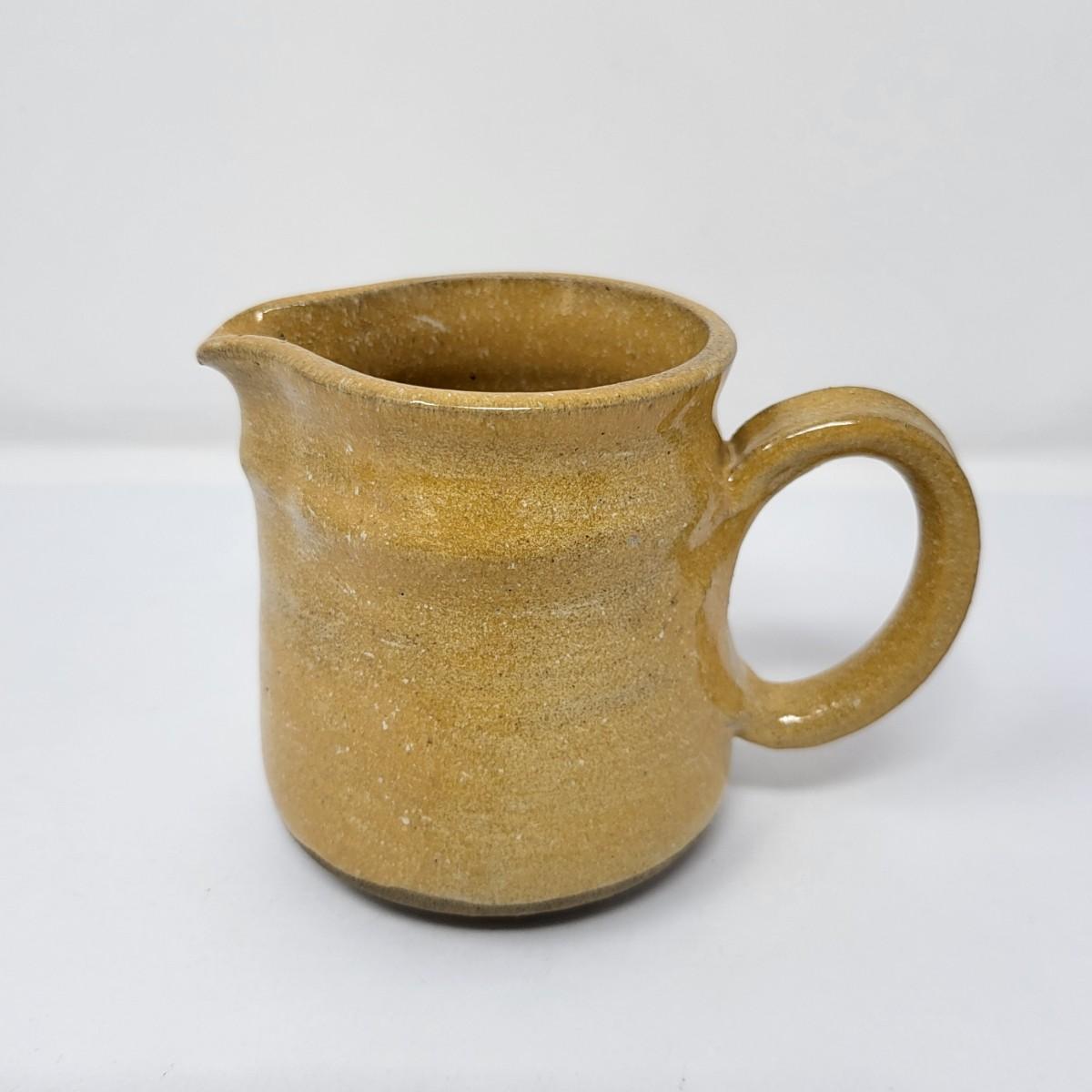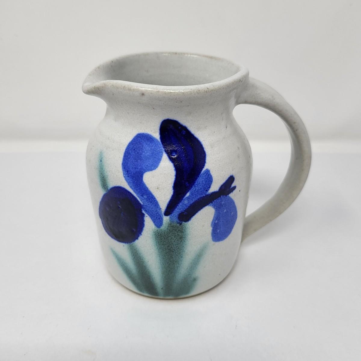 Double vase/jug drip glaze 7" x 6.5". Small round lidded box 2.5" x 1.5". Perforated dish 5.5" diameter. A 6" glazed bowl with heart shape pattern. Four pottery creamer/pitchers ranging in size from 3" tall to 4.75" tall.