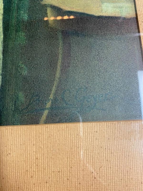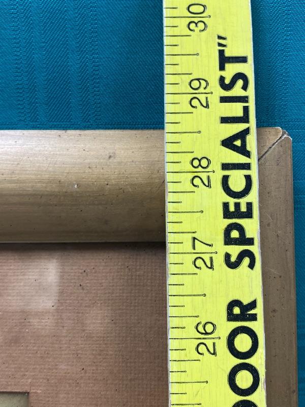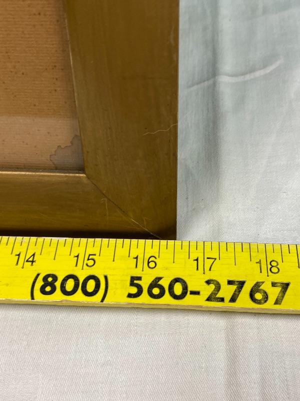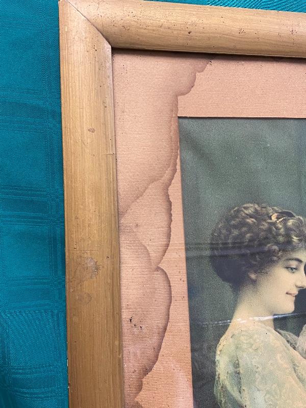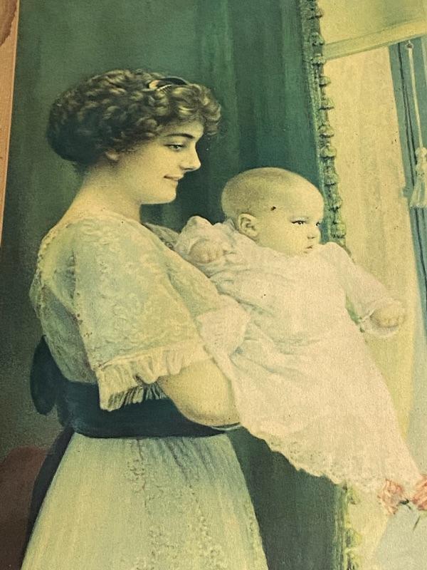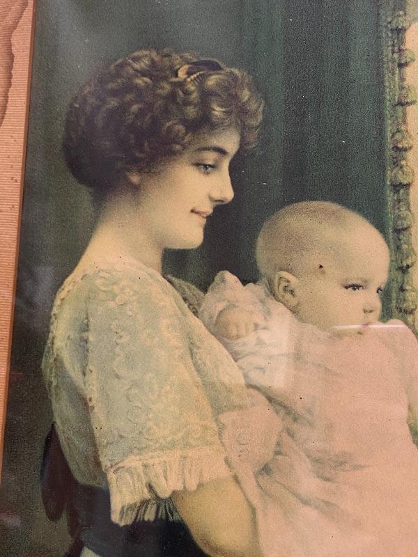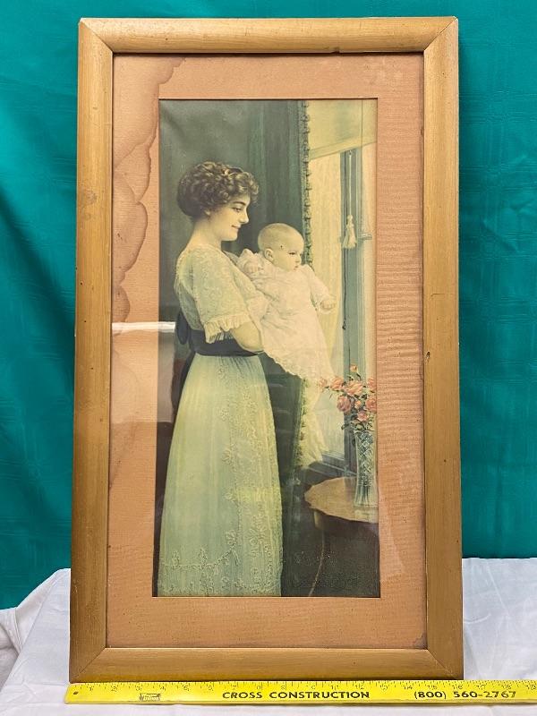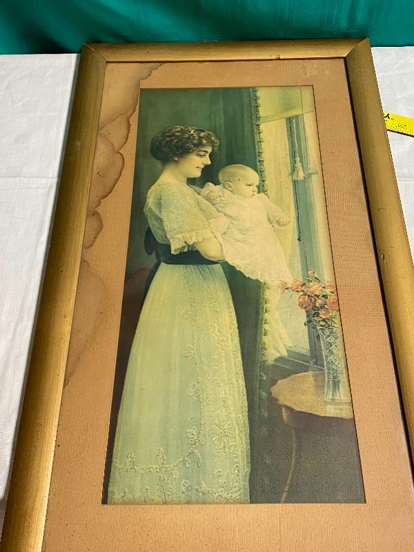 Mother & child art by Dory G. Geyer. Large framed art, measures almost 29"x16.5". There is what appears to be water damage along the edges, Could be re-matted and framed.