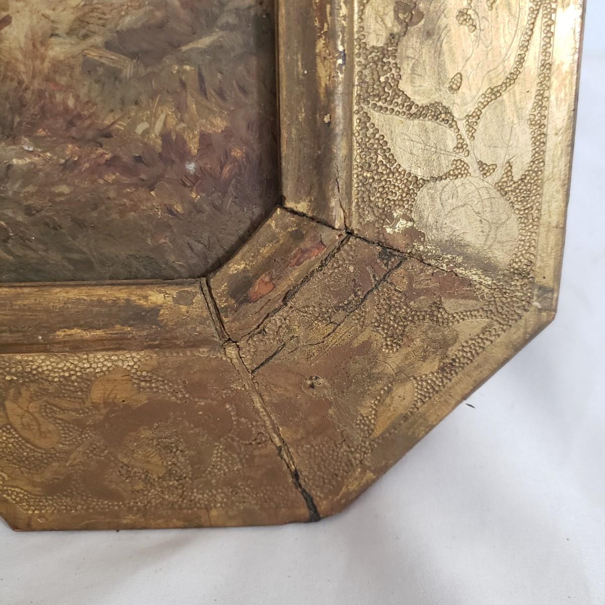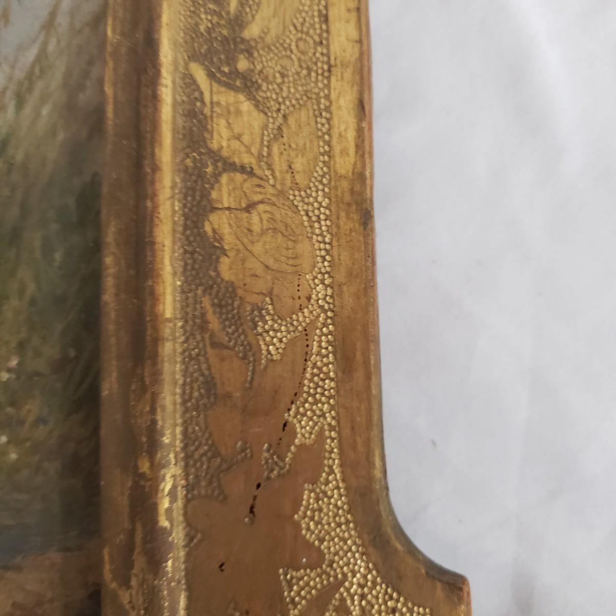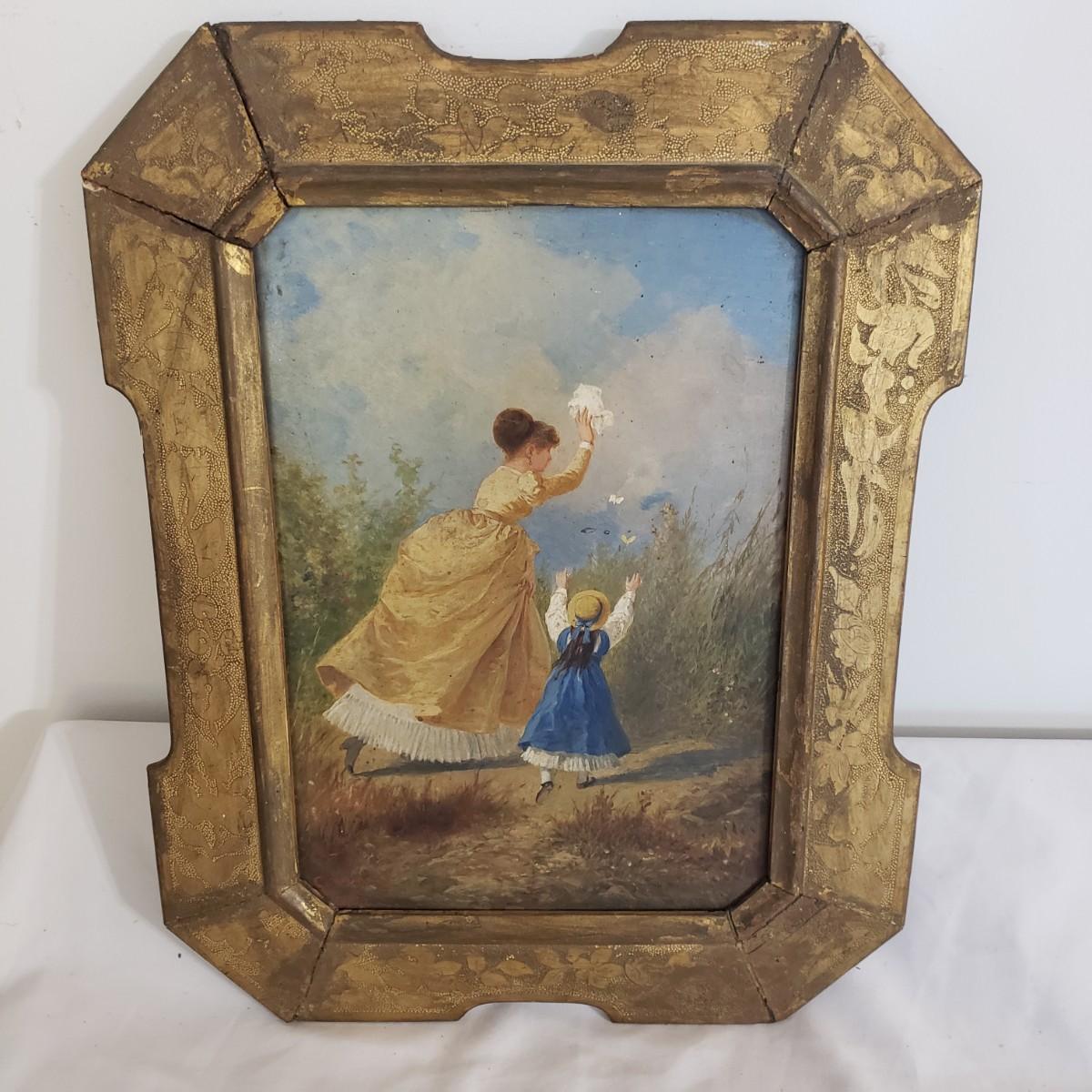 This oil painting features a lady and child chasing butterflies. The corner shows an unknown signature and possible date. The piece is in a wooden frame and is not under glass. Due to its age the frame has some cracks but is still intact. The frame measures 12" x 16"H. Please see photos for details.