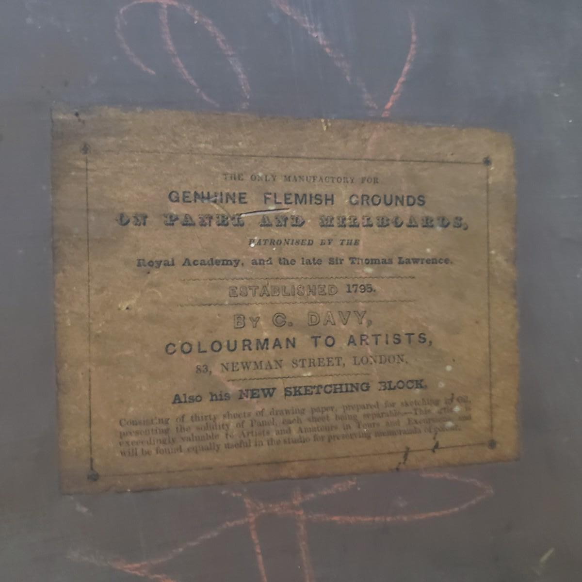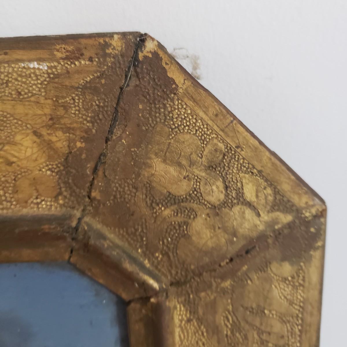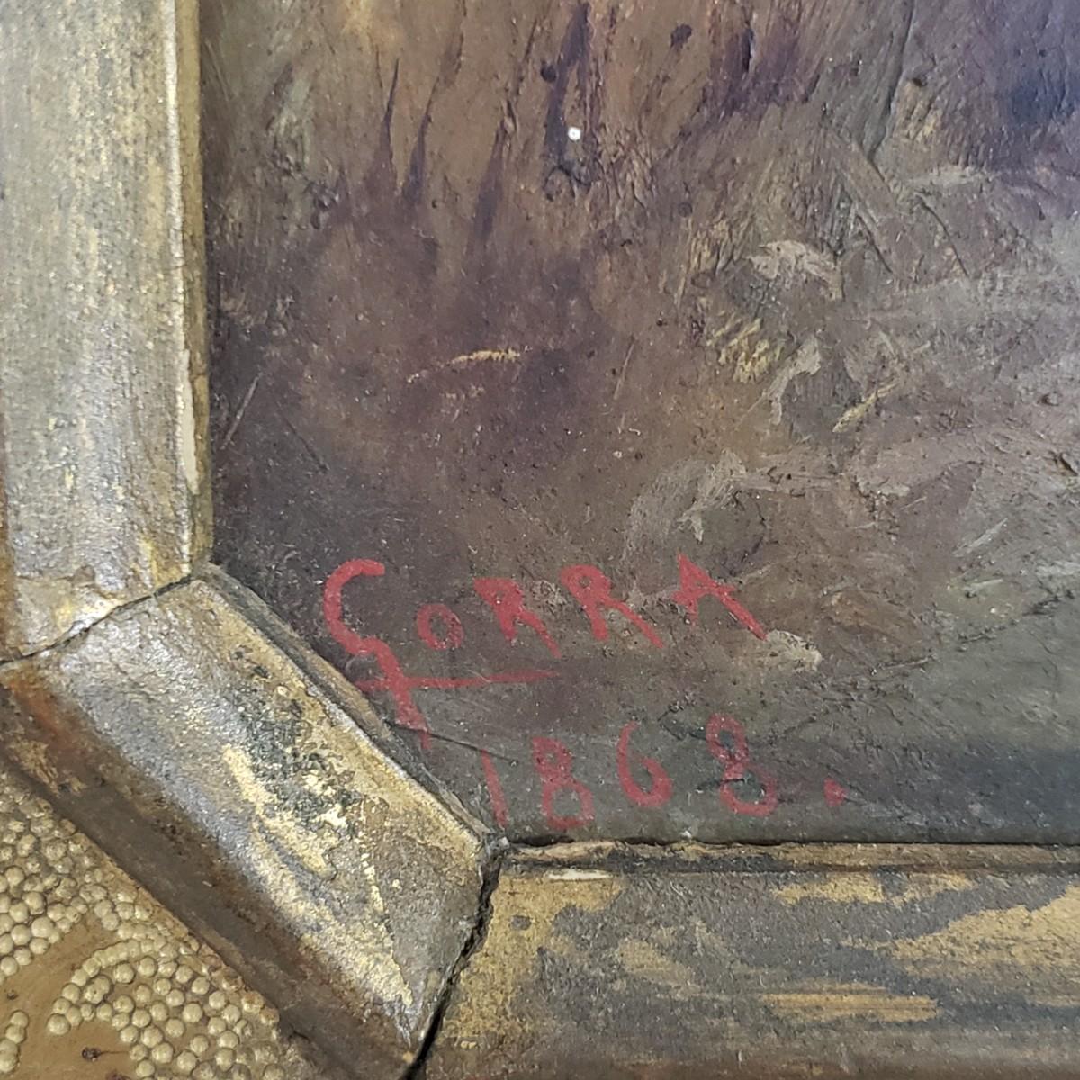 This oil painting features a lady and child chasing butterflies. The corner shows an unknown signature and possible date. The piece is in a wooden frame and is not under glass. Due to its age the frame has some cracks but is still intact. The frame measures 12" x 16"H. Please see photos for details.