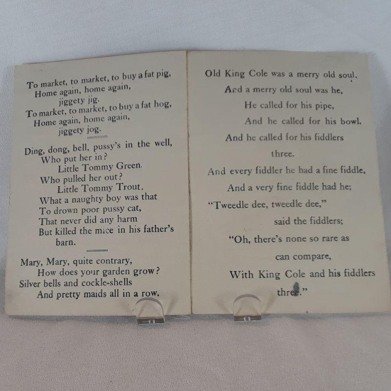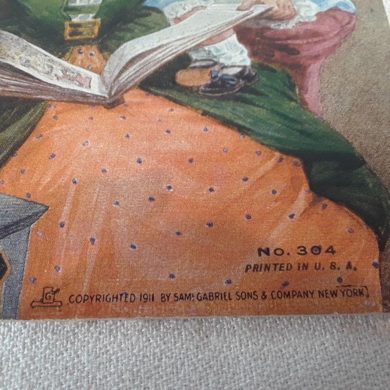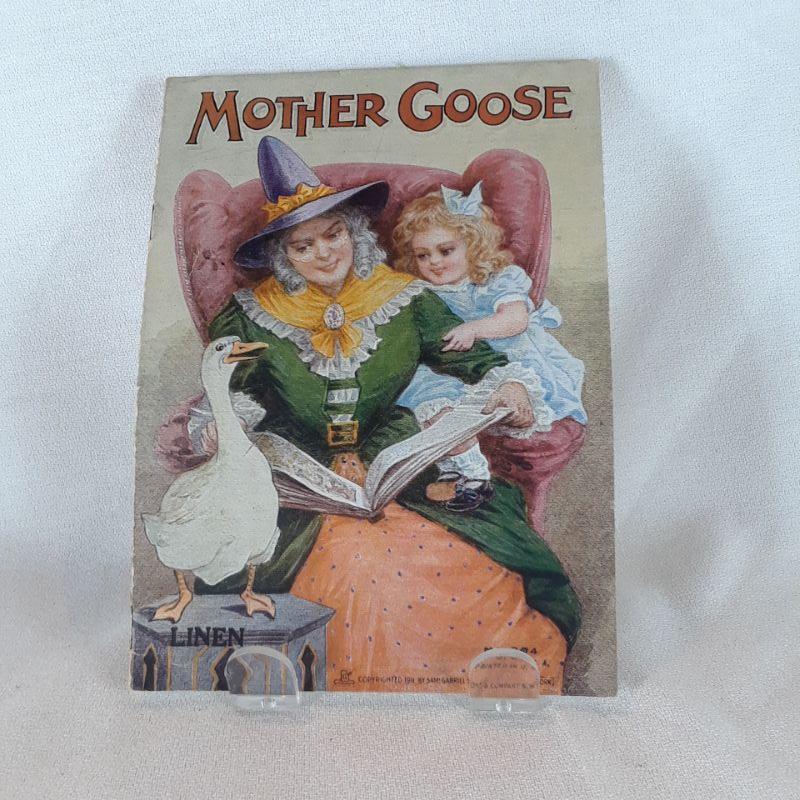 Very nice Mother Goose booklet printed on linen. Marked Linen #304 Printed in USA. Copyrighted 1911 by Sam Gabriel Sons & Company, New York. Six pages in total plus front cover and back cover. In very good condition. Quite a nice and unusual item - framable for hanging in nursery or child's room.