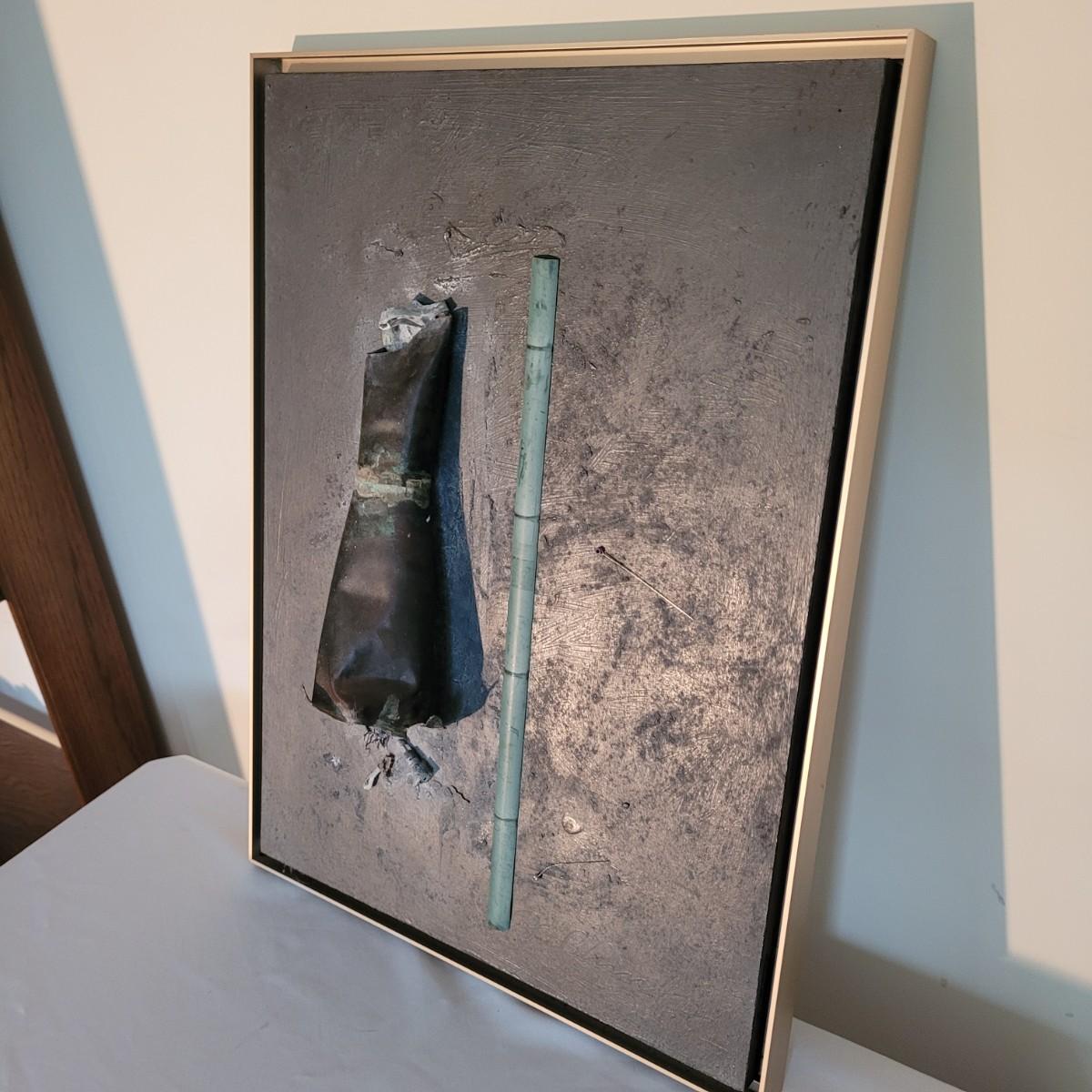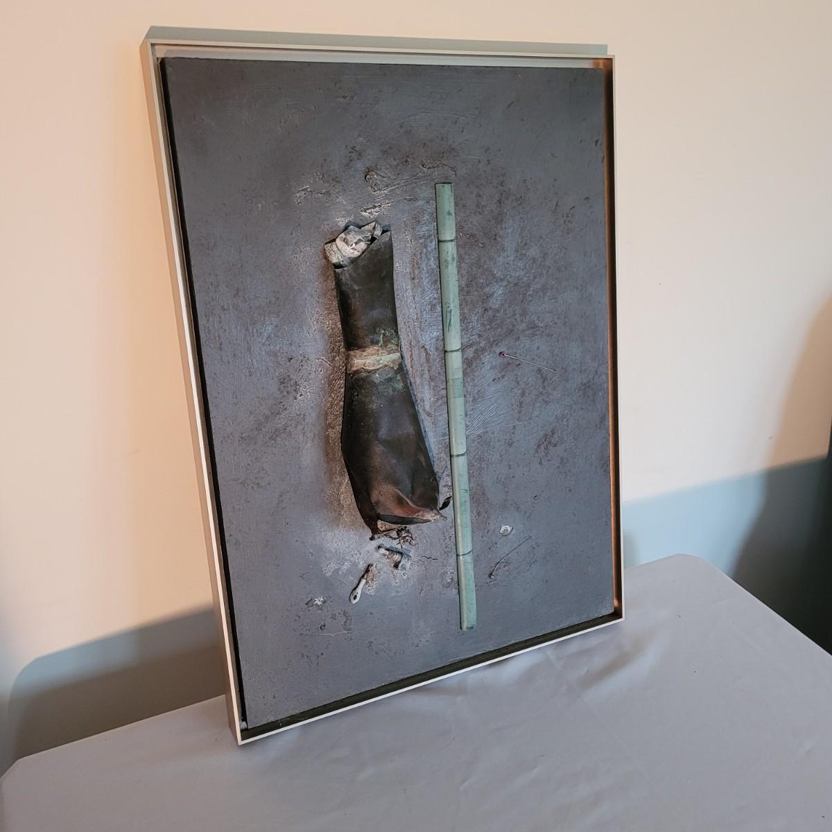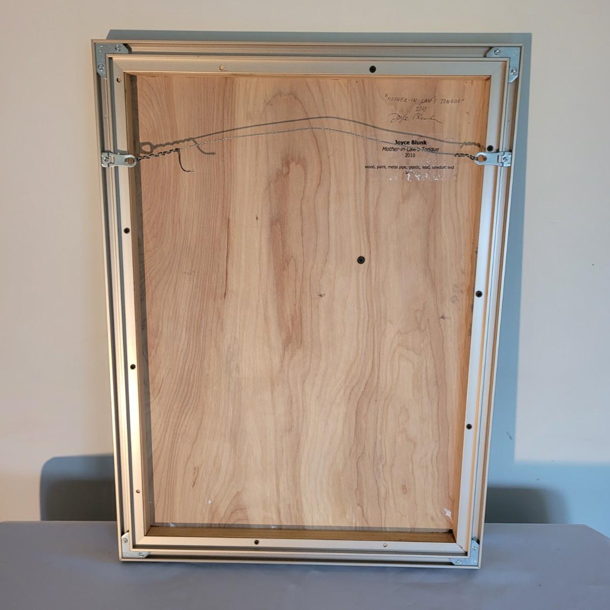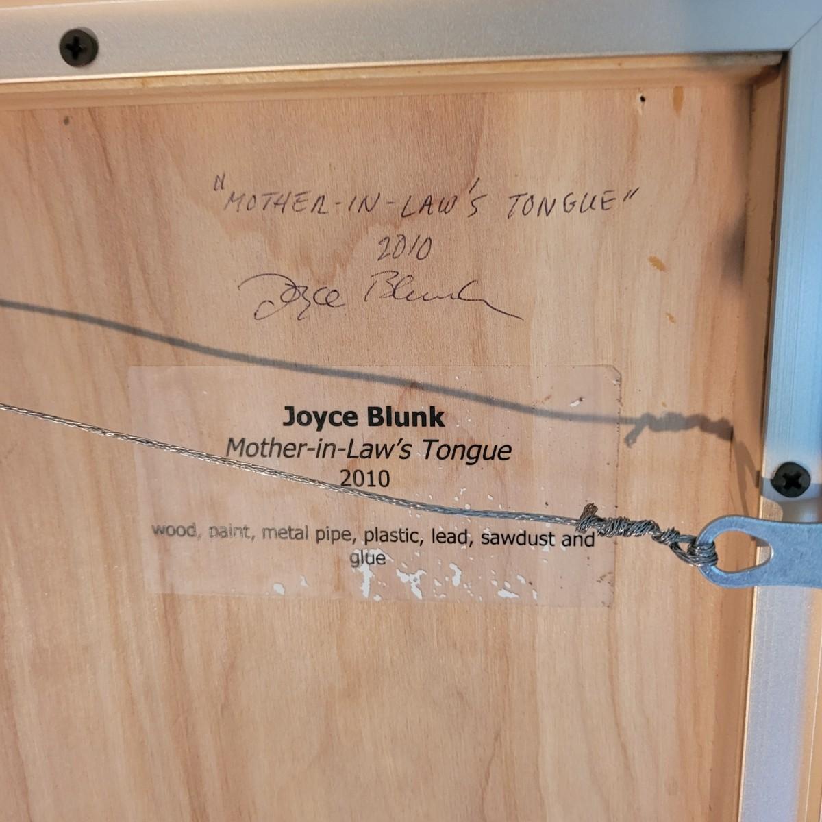 This lot includes a piece of wall art titled "Mother In-laws Tongue" by Asheville, NC local artist Joyce Blunk. This piece is mixed media, consisting of sculpture and painting. The piece is built into a metal and wood frame. It is labeled, signed, and dated by the artist on the backside. The frame measures 17" x 23"H.