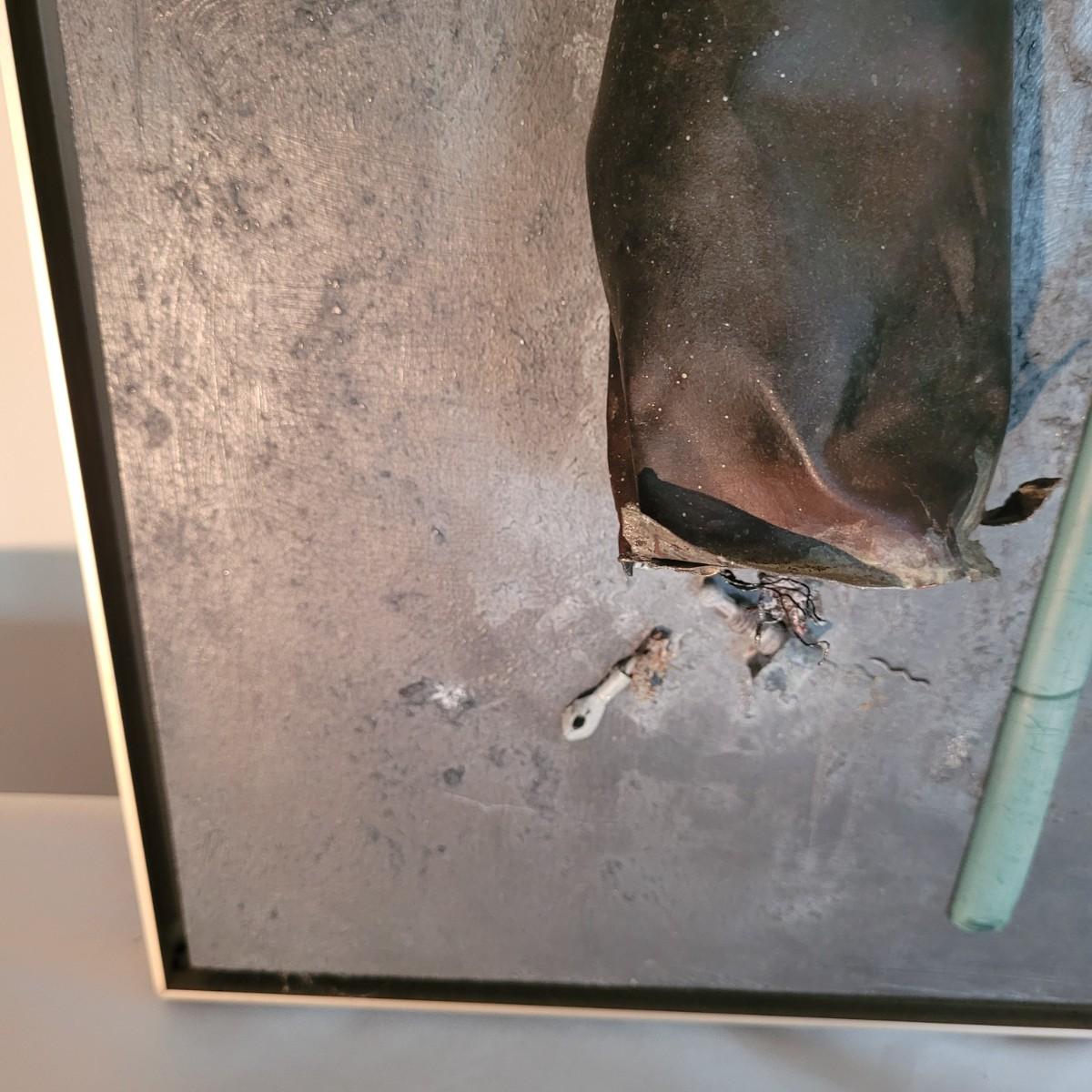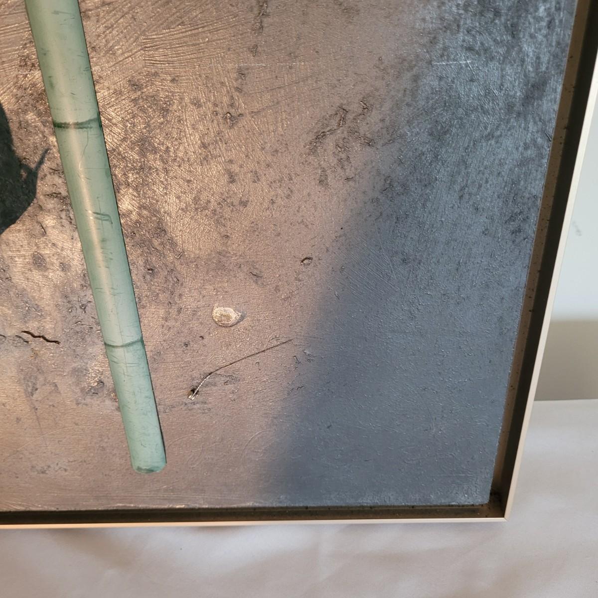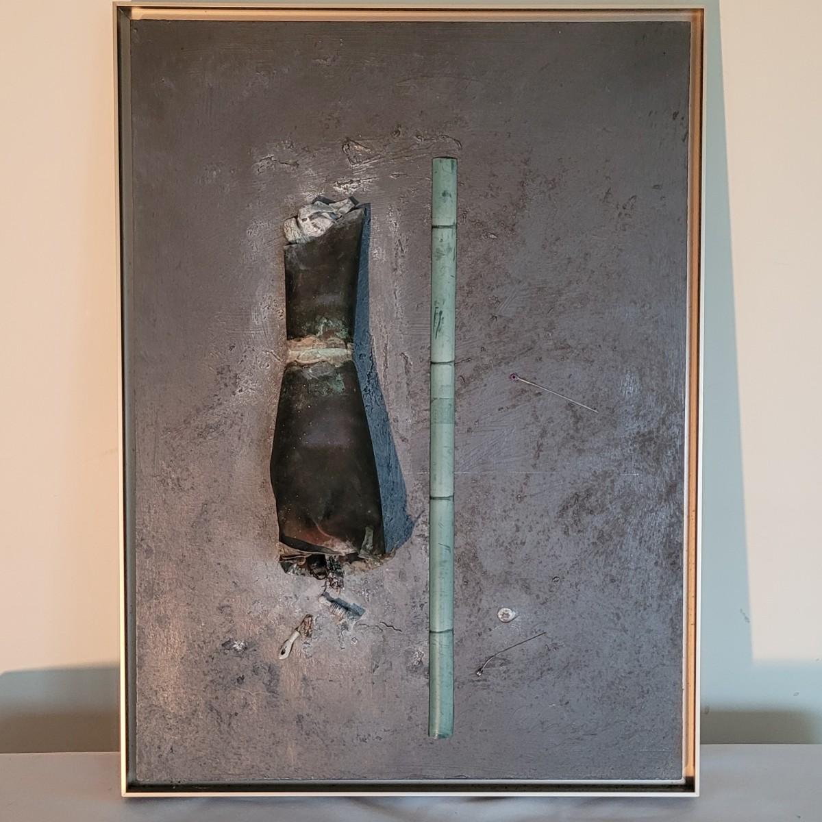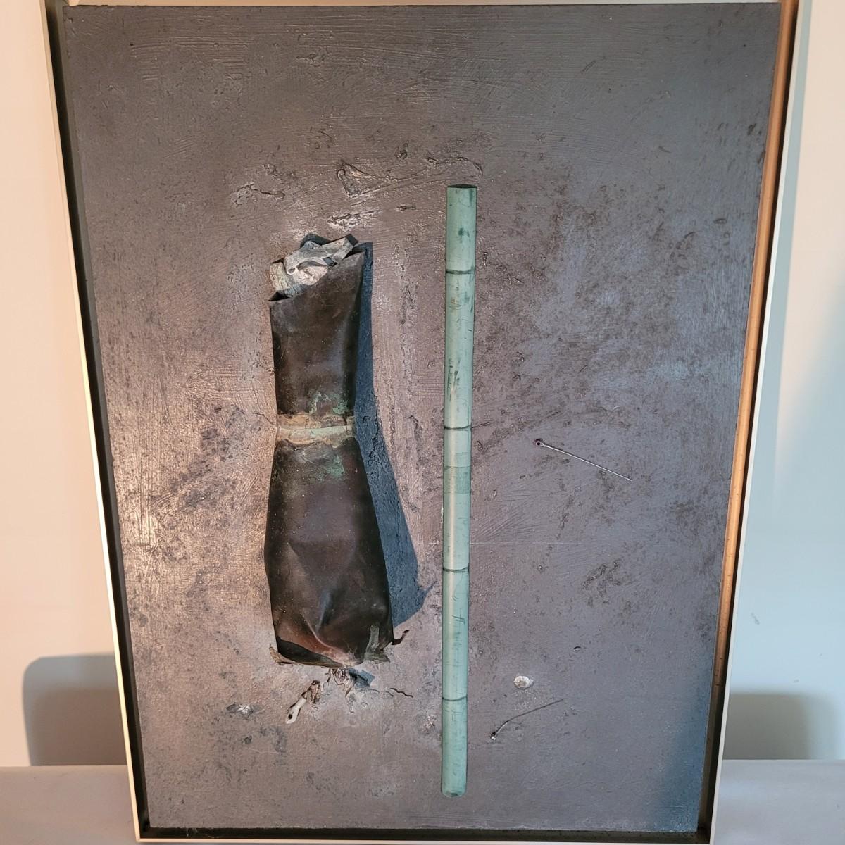 This lot includes a piece of wall art titled "Mother In-laws Tongue" by Asheville, NC local artist Joyce Blunk. This piece is mixed media, consisting of sculpture and painting. The piece is built into a metal and wood frame. It is labeled, signed, and dated by the artist on the backside. The frame measures 17" x 23"H.