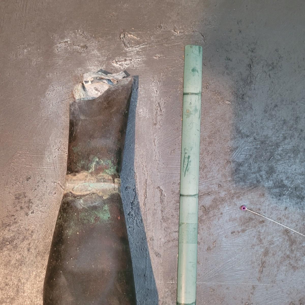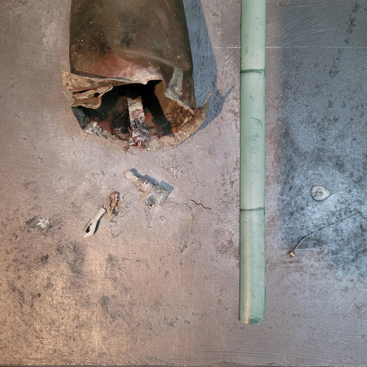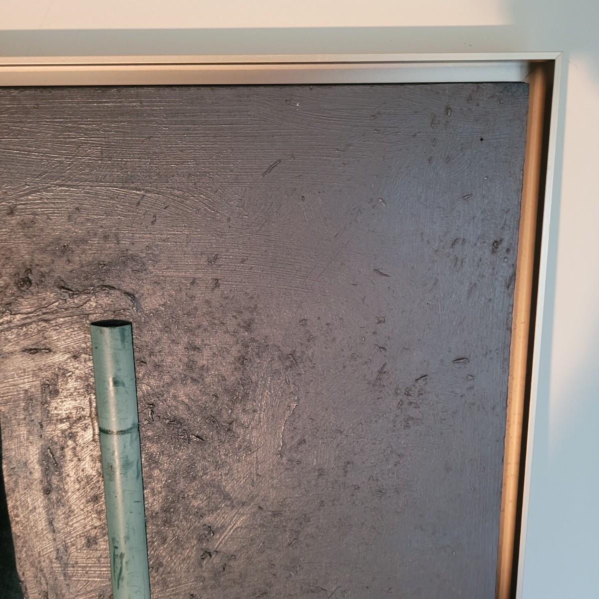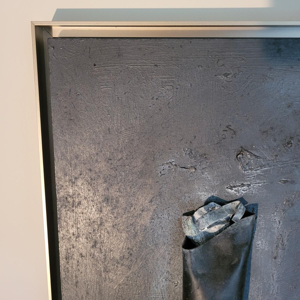 This lot includes a piece of wall art titled "Mother In-laws Tongue" by Asheville, NC local artist Joyce Blunk. This piece is mixed media, consisting of sculpture and painting. The piece is built into a metal and wood frame. It is labeled, signed, and dated by the artist on the backside. The frame measures 17" x 23"H.