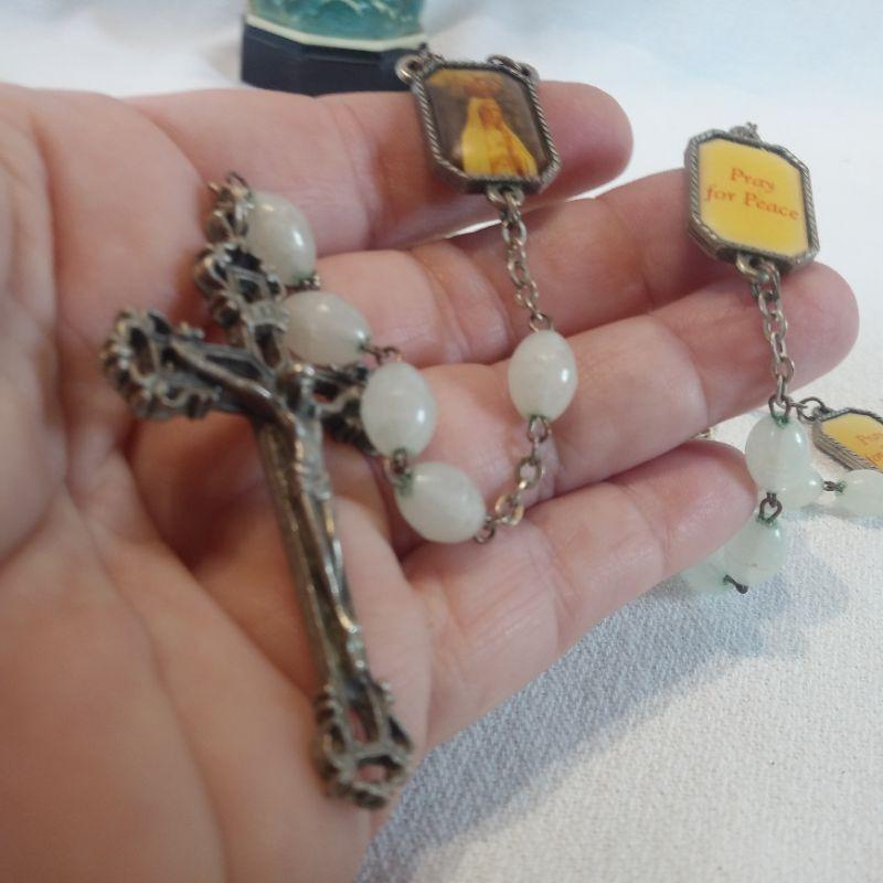 This lot is for a Vintage Mother Mary Statue Rosary Holder & Rosary. Statue is hollow plastic with a removable bottom that can hold one or many rosaries. The rosary in this offering is unique with the reliqious pictures as decade separations. She stands 8 1/4-inches tall.