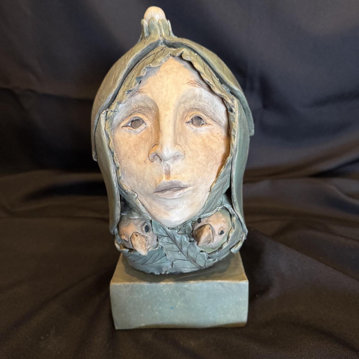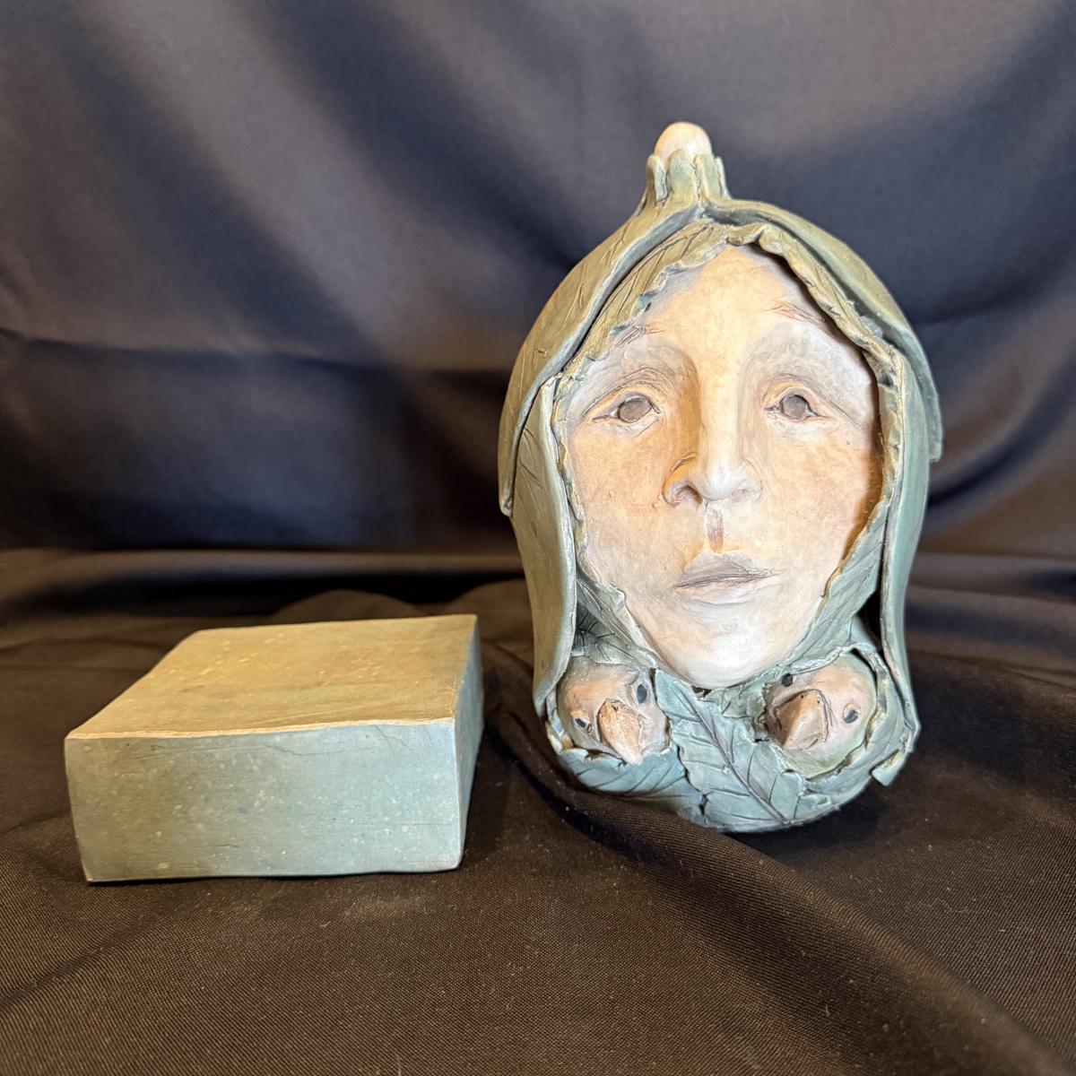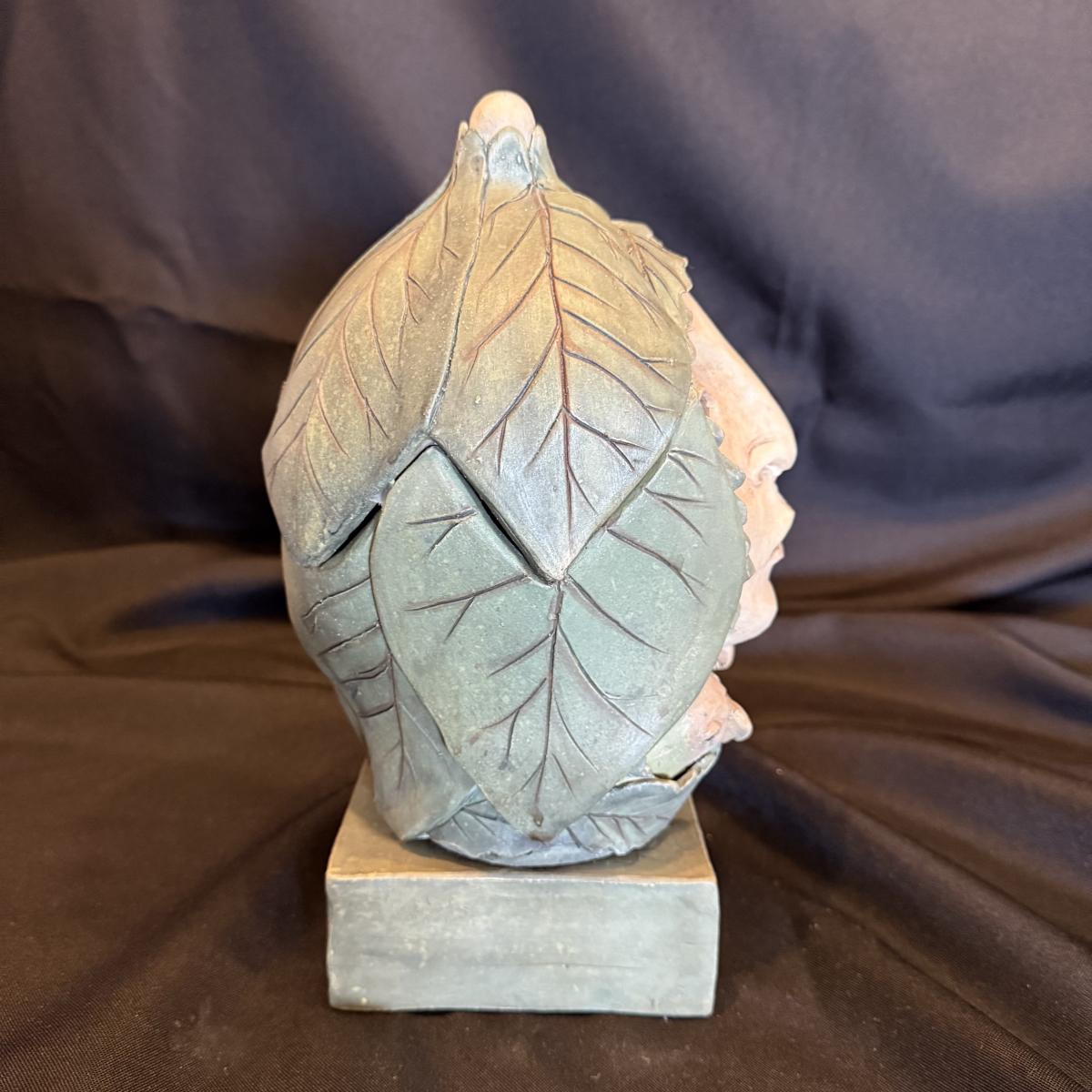 This lot contains a sculpture of a woman’s face with two little birds under leaves. This piece appears to be ceramic and sits on a block base that is separate from the head. All together this piece measures approximately 5” x 6” x 11”H. There does not appear to be an artist signature. Shipping available.