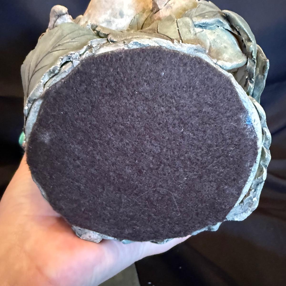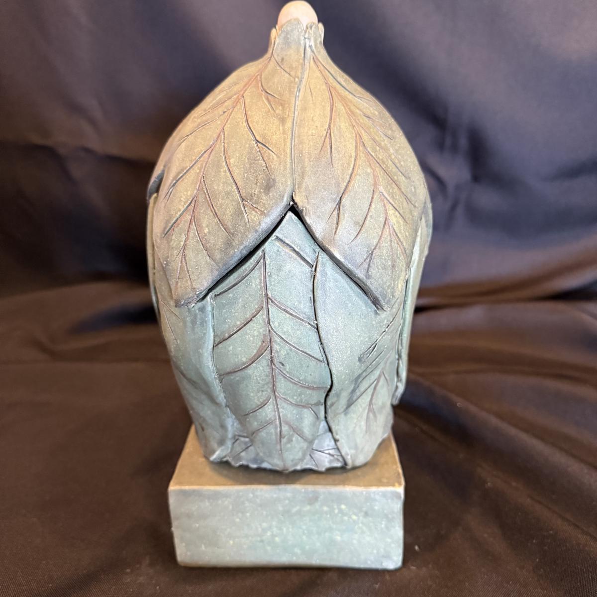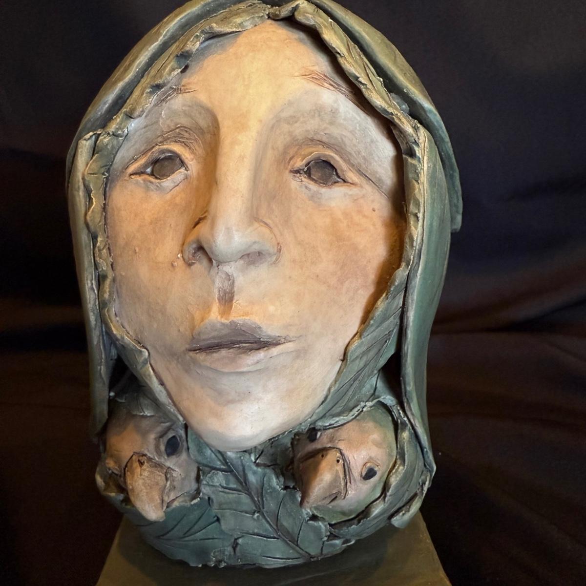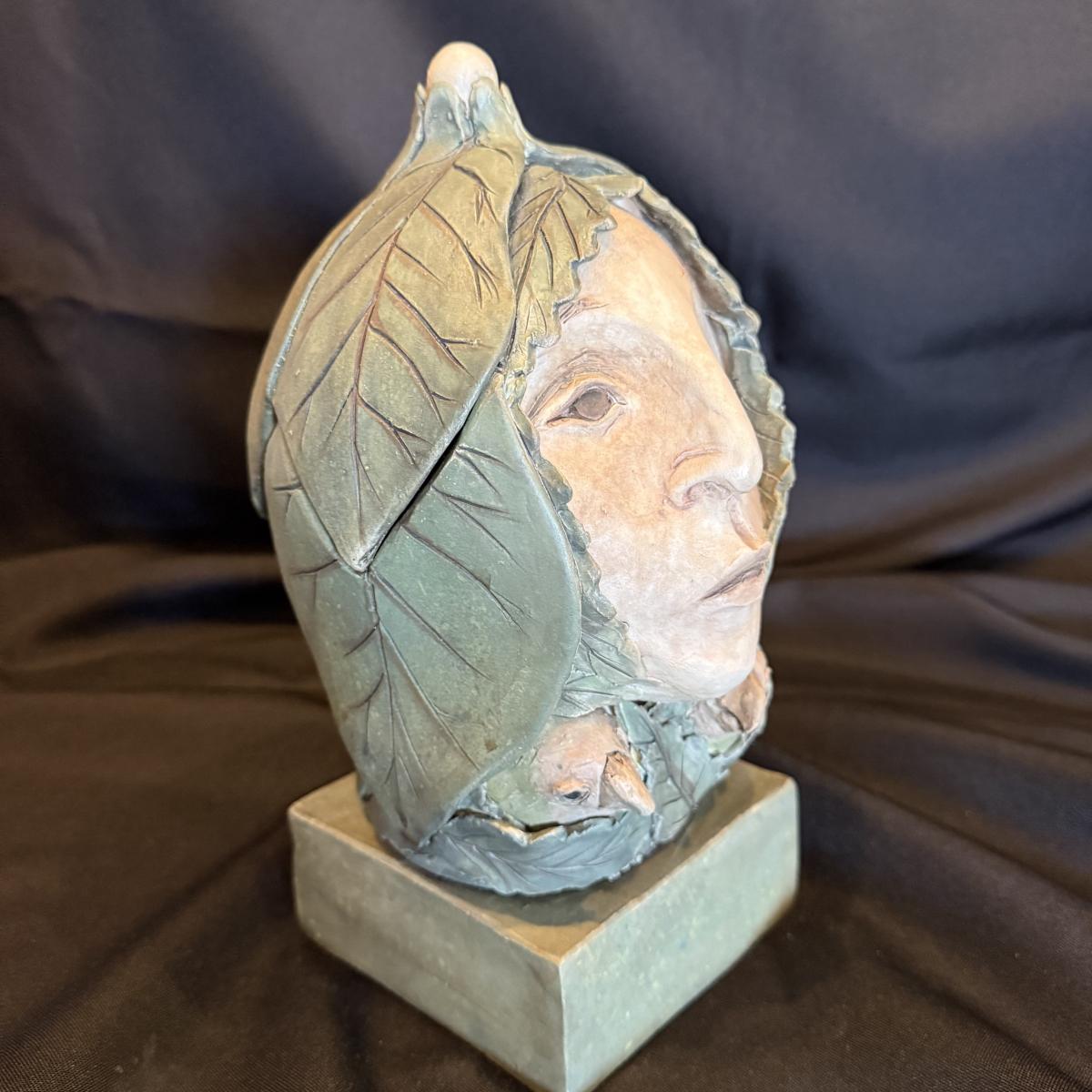 This lot contains a sculpture of a woman’s face with two little birds under leaves. This piece appears to be ceramic and sits on a block base that is separate from the head. All together this piece measures approximately 5” x 6” x 11”H. There does not appear to be an artist signature. Shipping available.