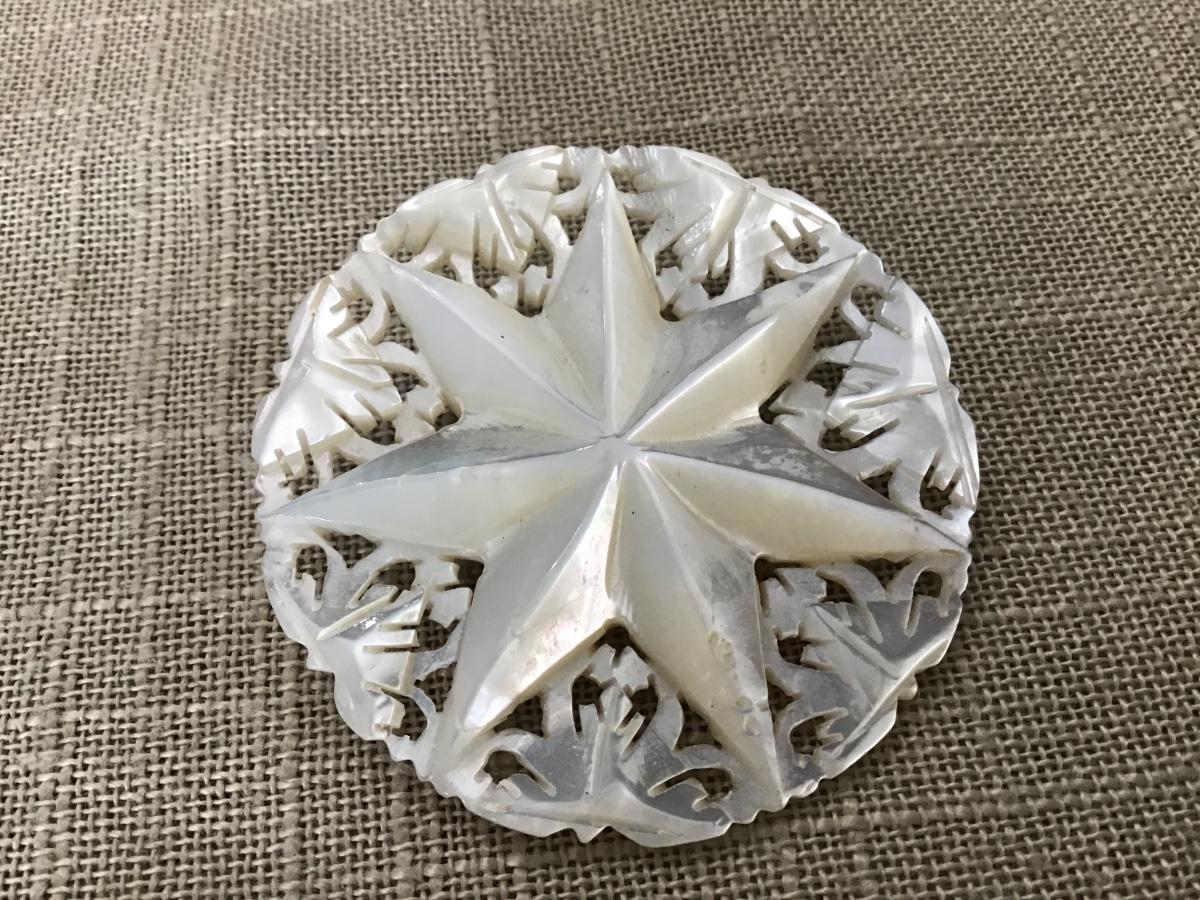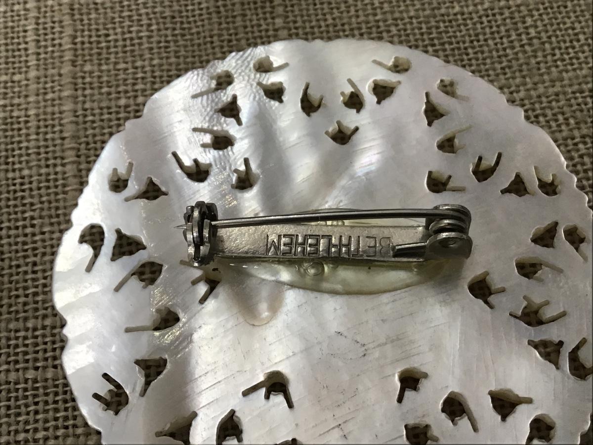 MOTHER OF PEARL PIN BROOCH BETHLEHEM HAND CARVED VINTAGE ROUND BEAUTIFUL
