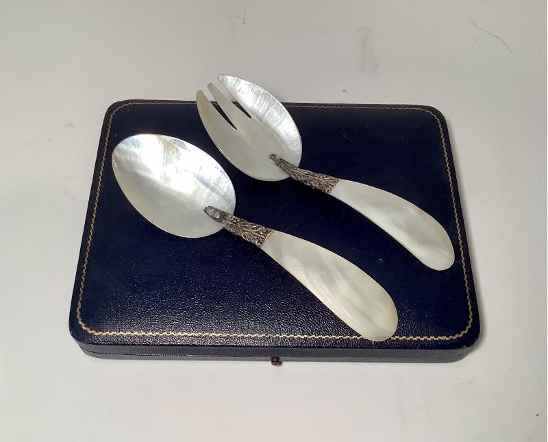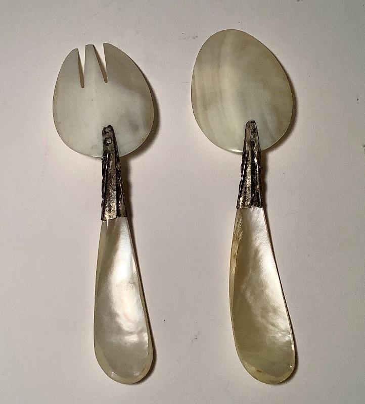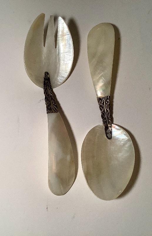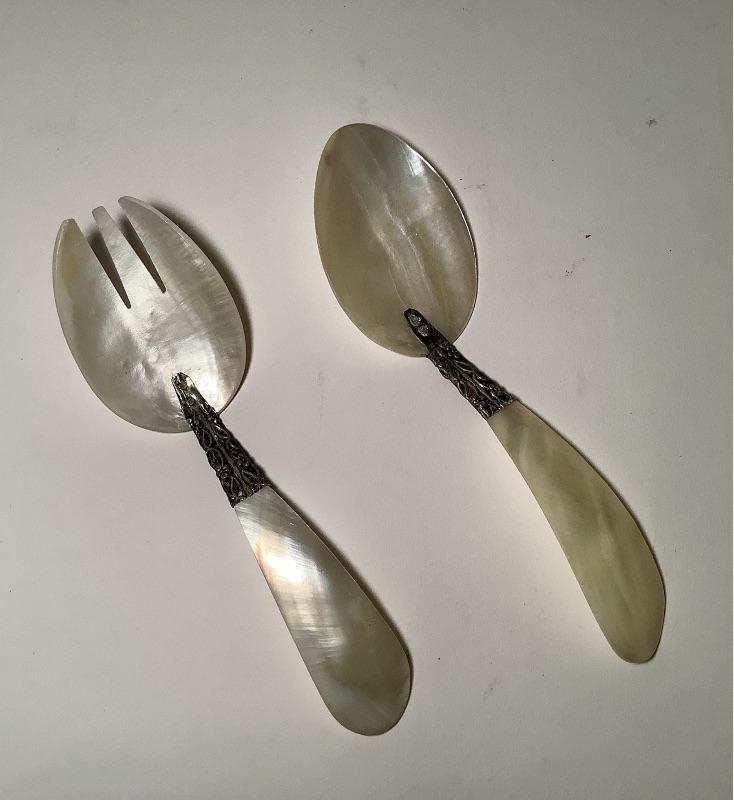 Mother of Pearl Servers - Spoon and Fork pair of servers made of mother of pearl and an antique metal that connects the handles with the fork and the spoon.