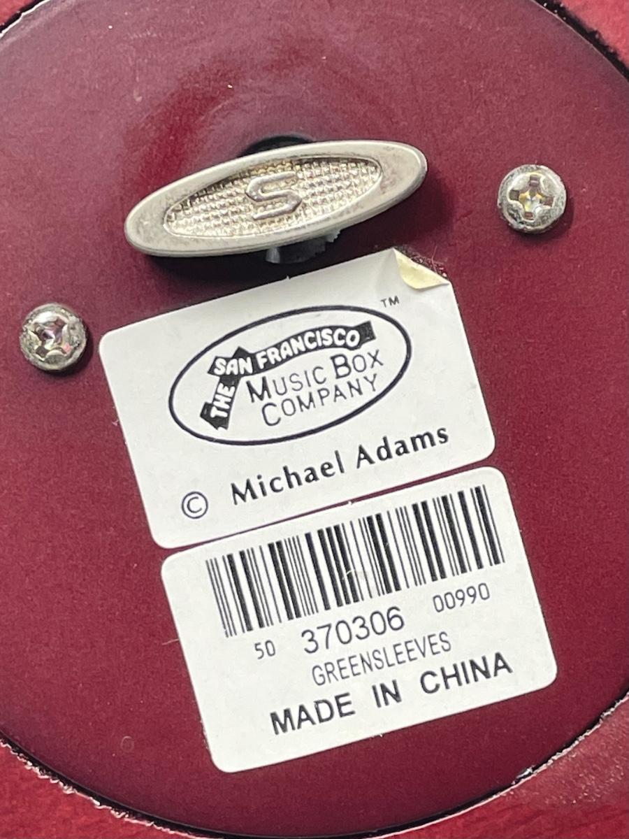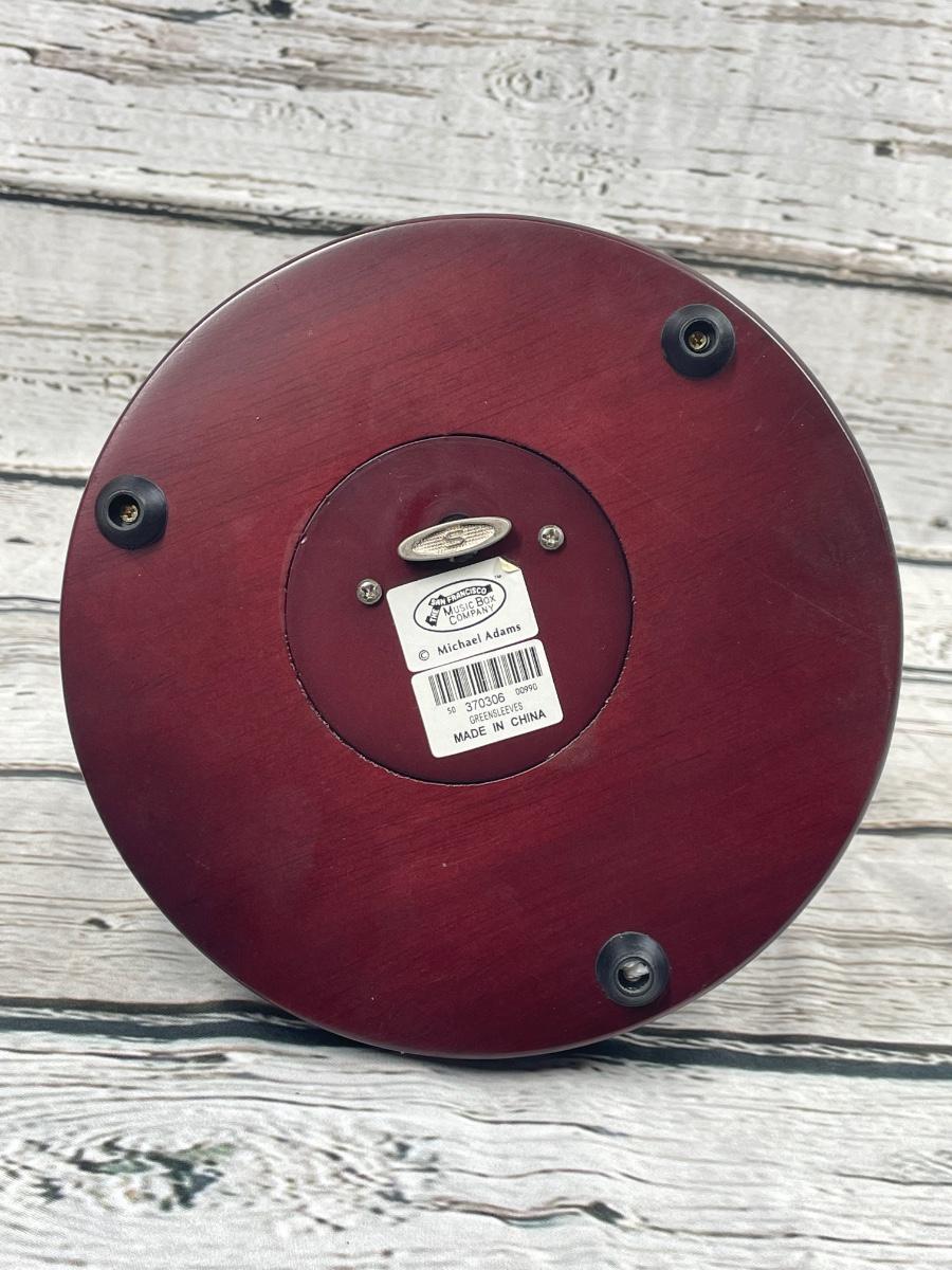 This item is in great condition and has no noticeable damages to it. The music box works just great and plays a soft song. It has felt on the bottom so it doesn’t scratch up any surface it stands on. The music player is approximately 9” tall and was made in China.