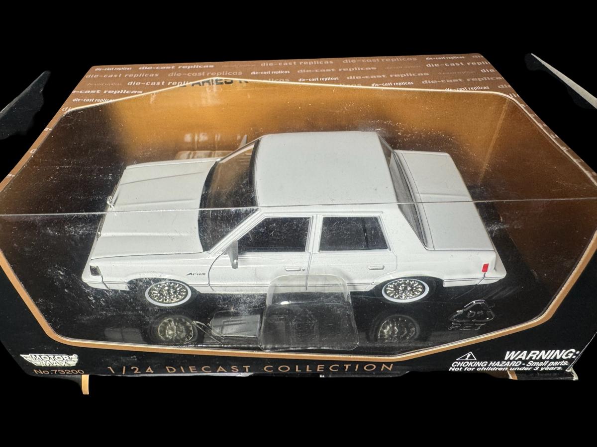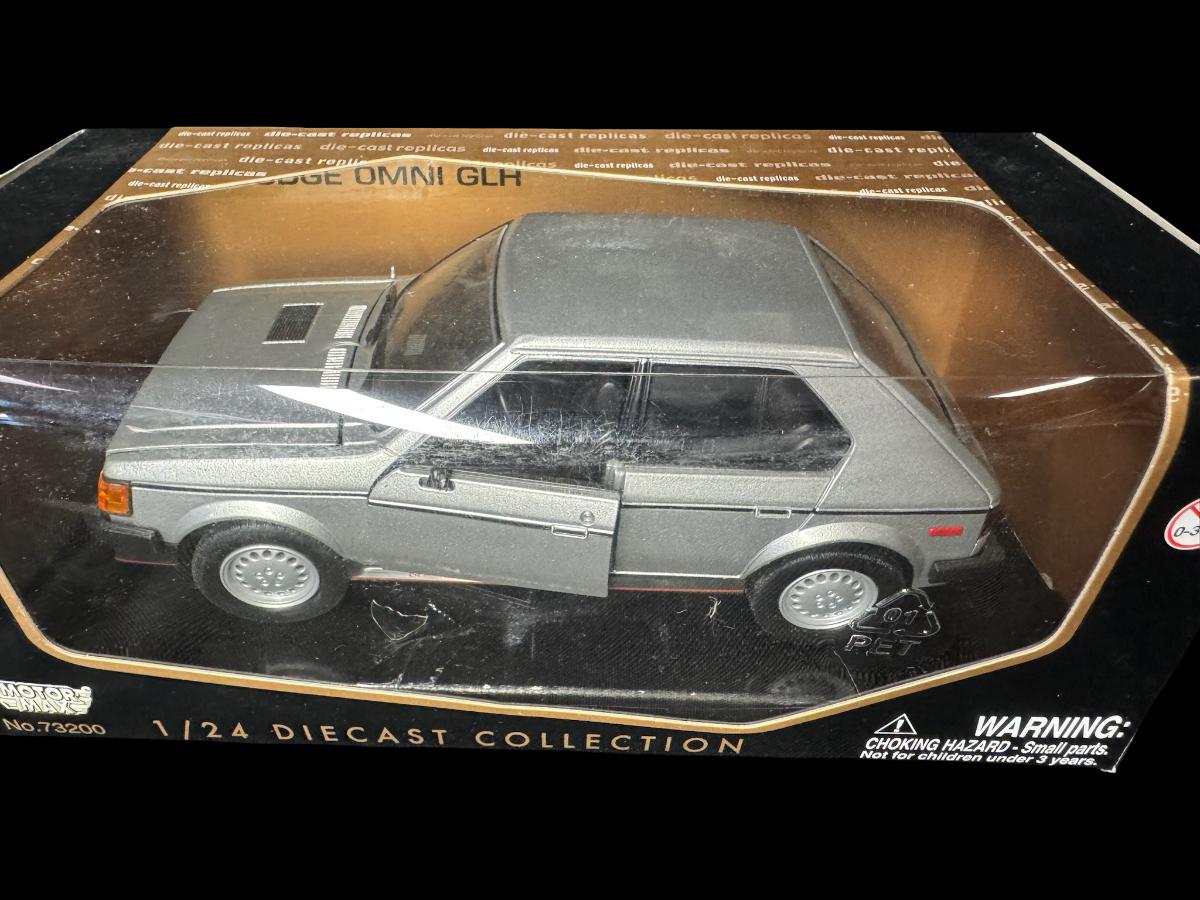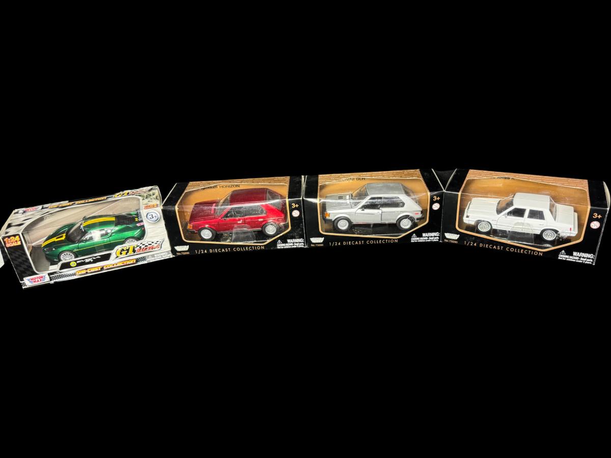 Includes a Lotus Evora GT 4, a 1985 Plymouth Horizon, a 1985 Dodge Omni GLH, and a 1982 Dodge Aries K. Total of four pieces. In the original boxes.