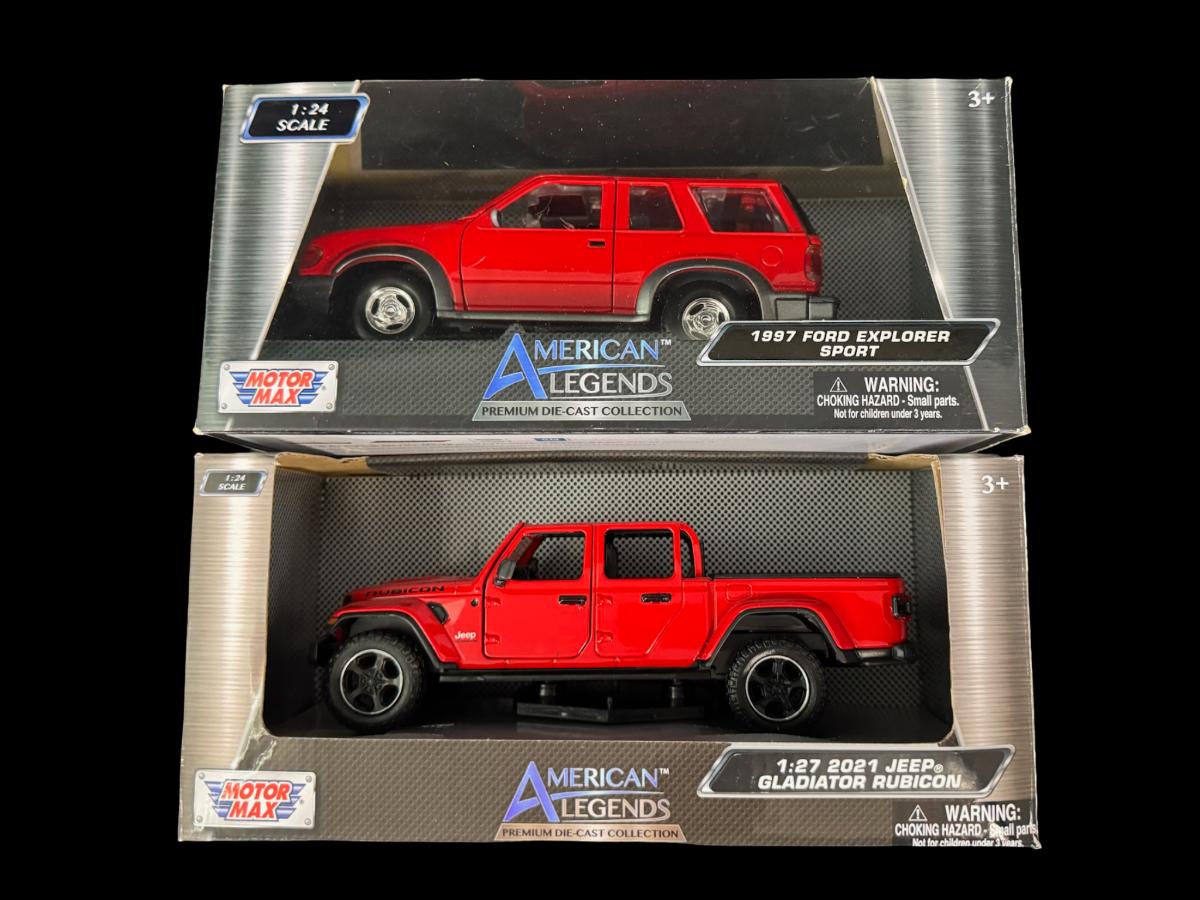 Includes a 1978 Ford Bronco, a 2019 GMC Sierra 1500 SLT Crew Cab, a 1997 Ford Explorer Sport, and a 2021 Jeep Gladiator Rubicon. Total of four pieces. All are in the original boxes. The plastic cover is missing from three of the boxes.