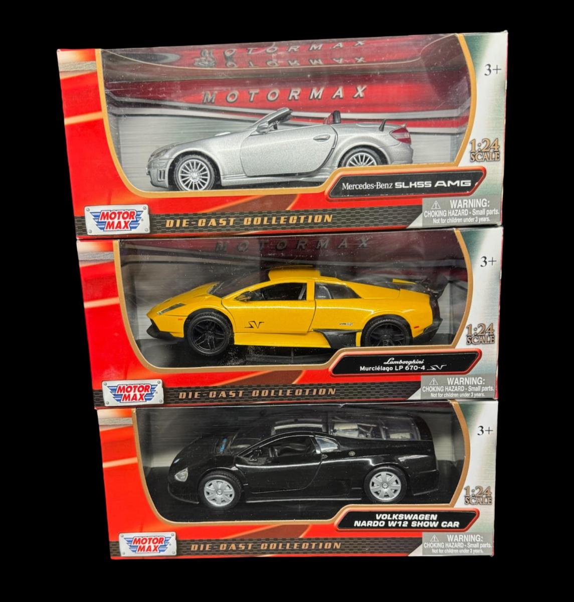 Includes Mercedes-Benz SLK55 AMG, Lamborghini Murcielago LP 670-4, and Volkswagen Nardo W12 Show Car. Total of three pieces, in the original boxes.
