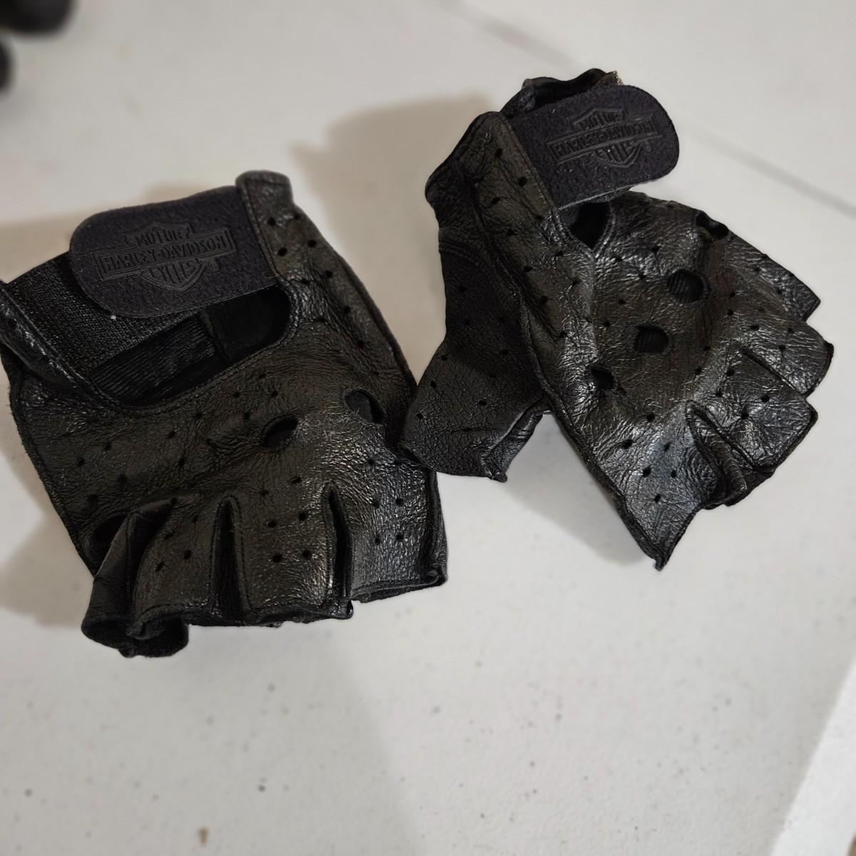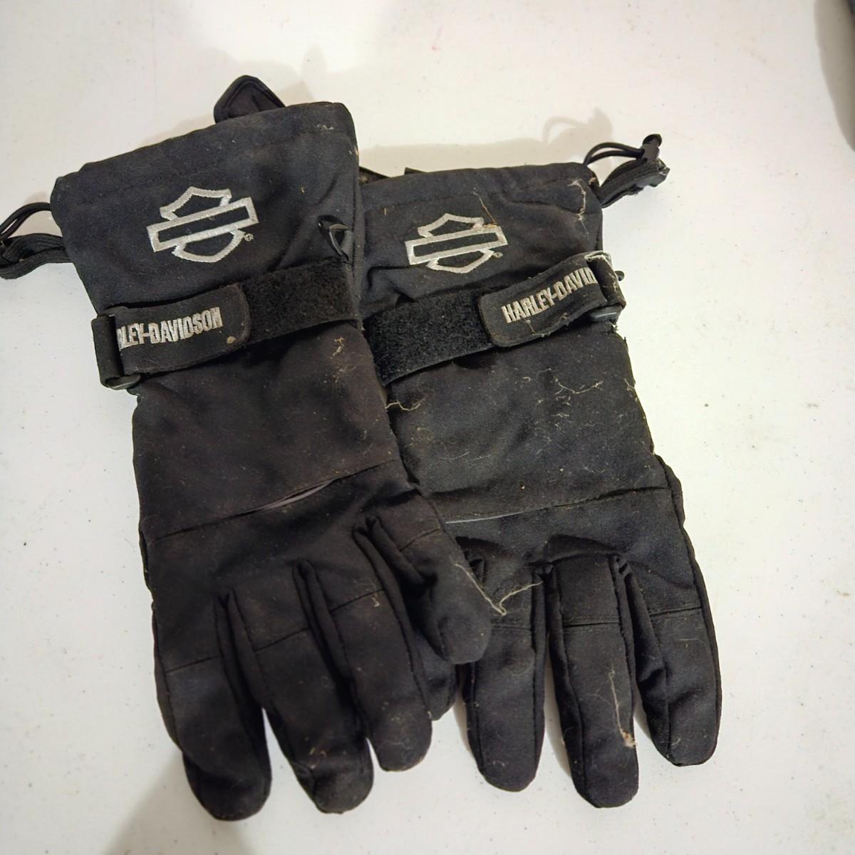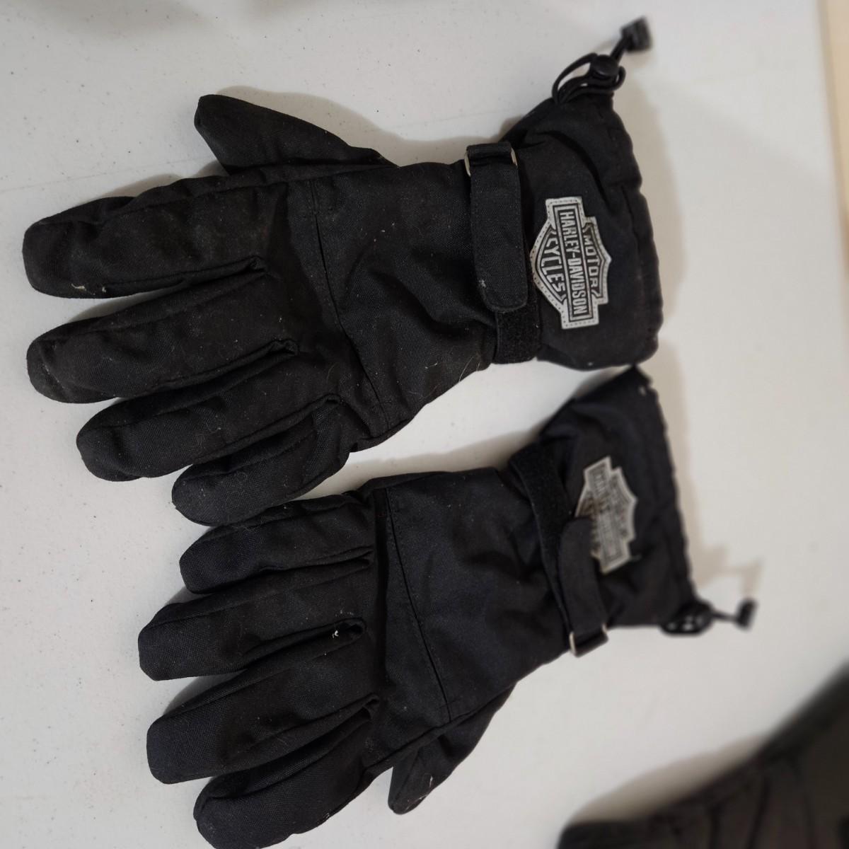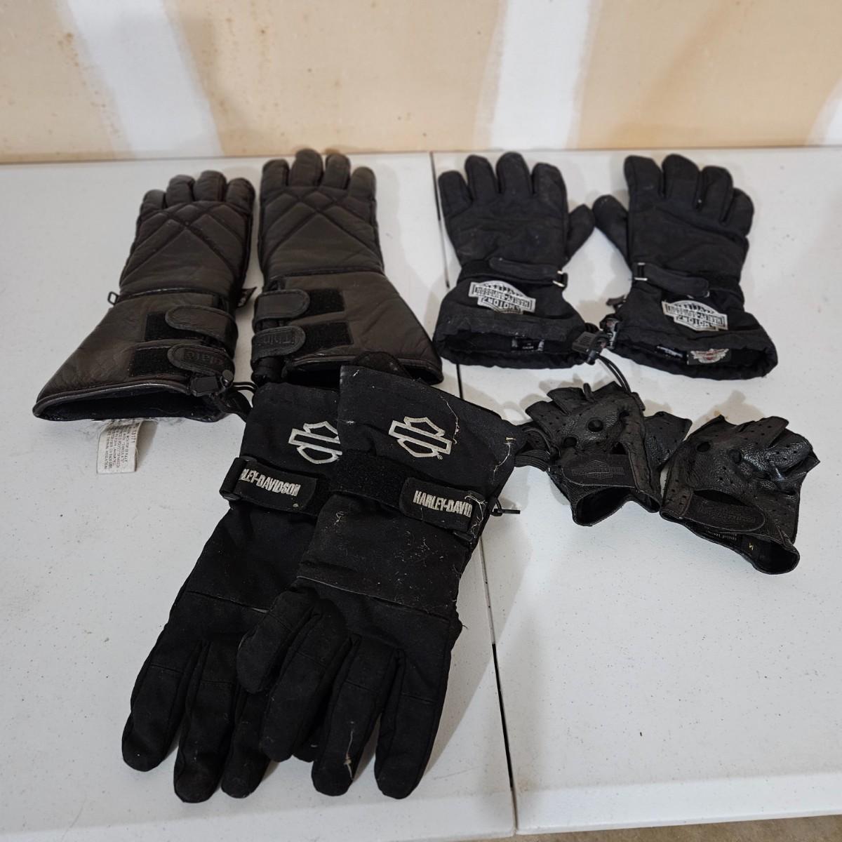 Four pairs of motorcycle gloves that three pairs are Harley Davidson branded and on pair is Olympia. The Olympia and fingerless gloves are leather and the other pair are fabric, cold weather gloves. All are size M and the Olympias are size S. Shipping available