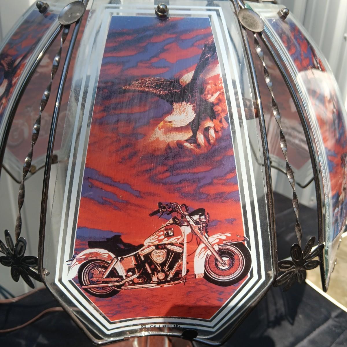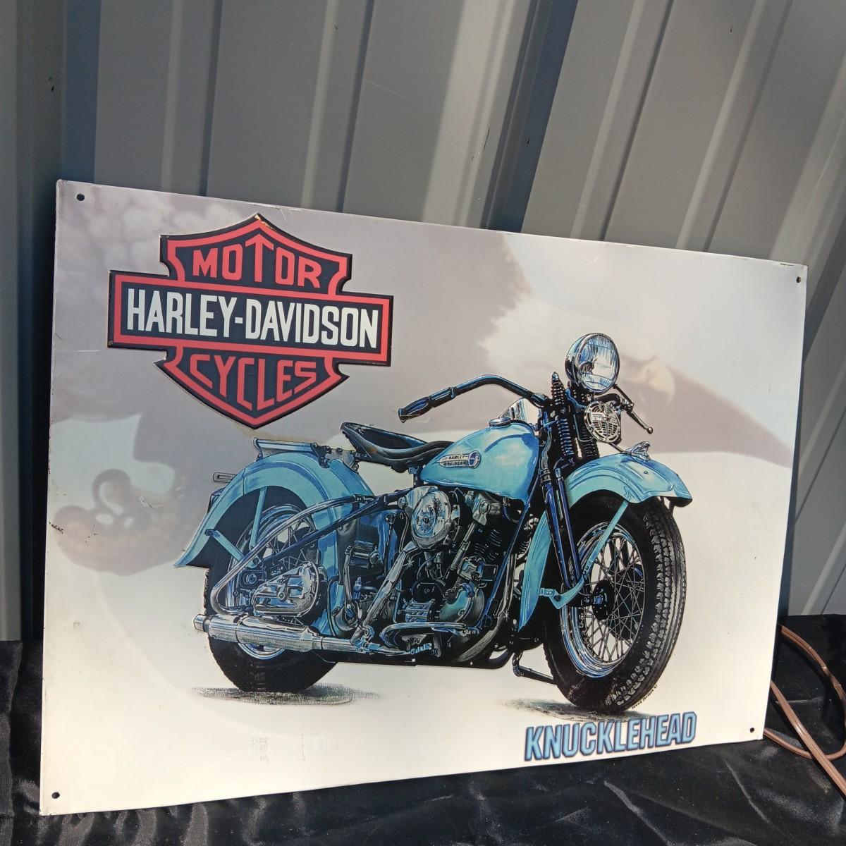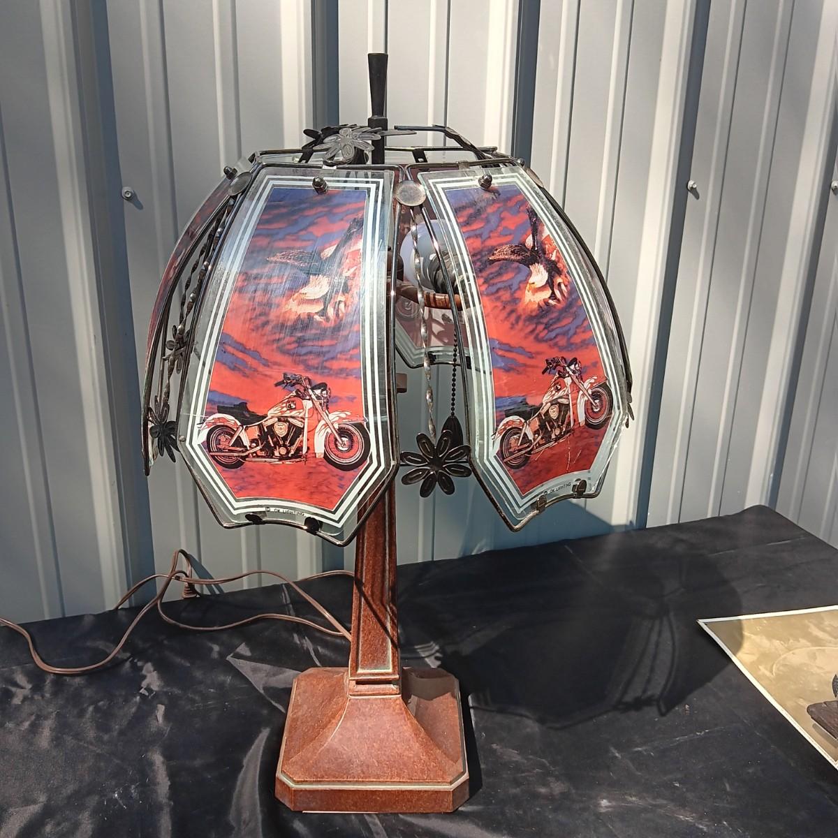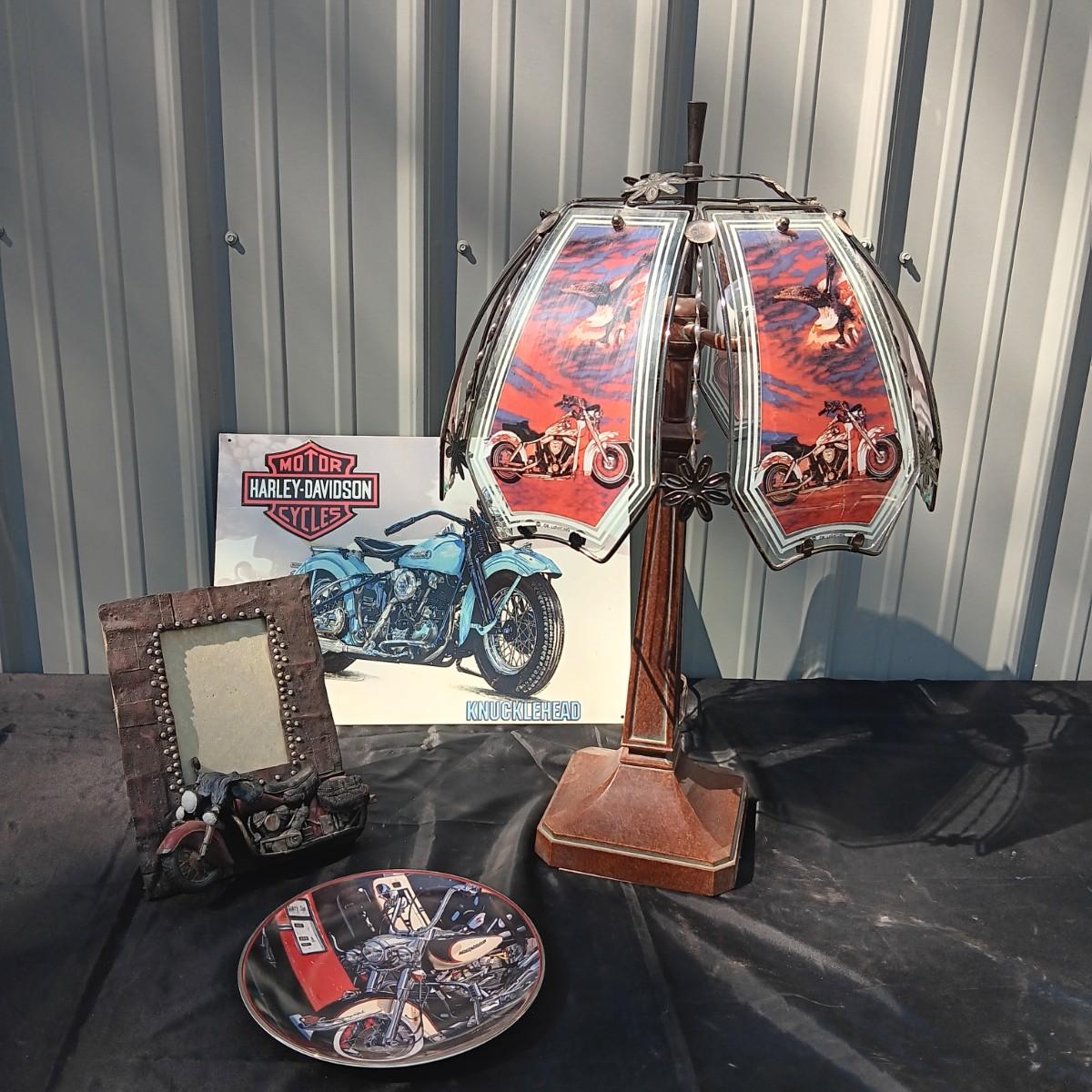 MOTORCYCLE DOUBLE LIGHT GLASS SHADED LAMP, HARLEY DAVIDSON TIN SIGN, PLATE AND FRAME