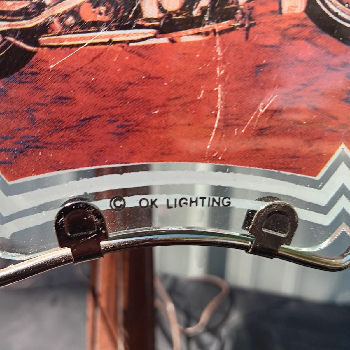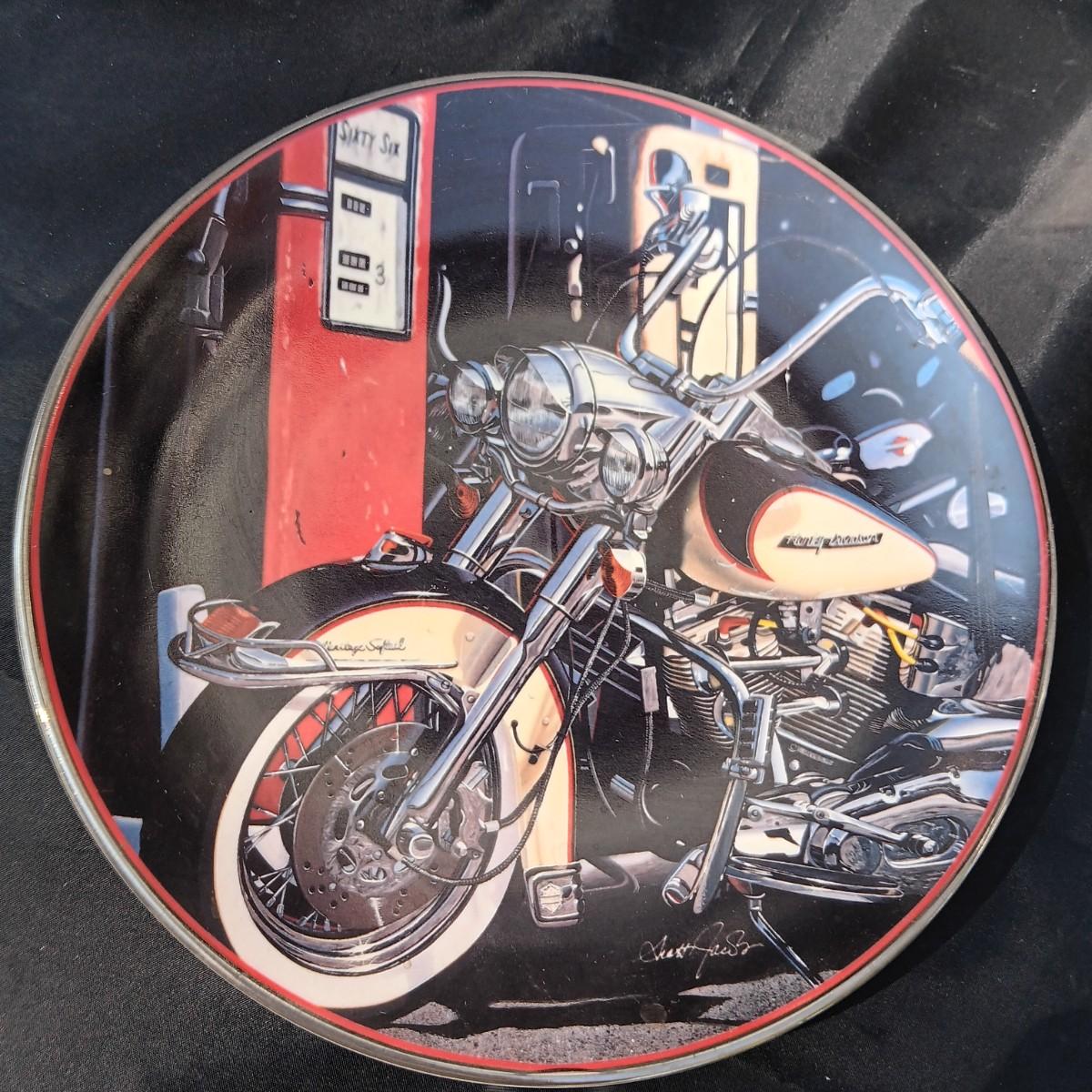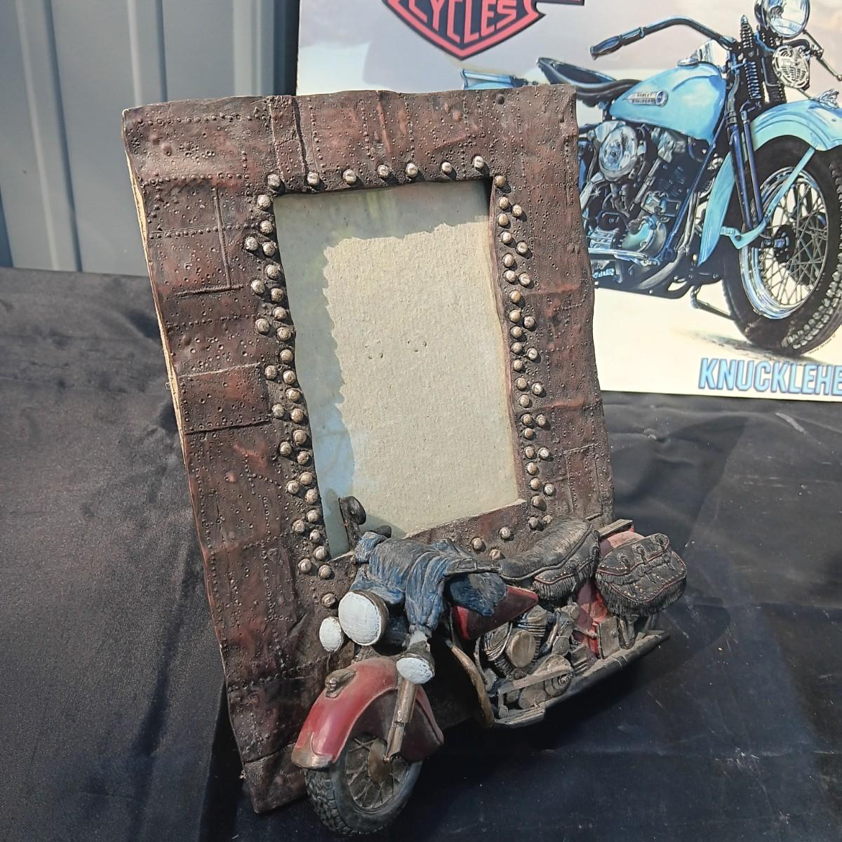 MOTORCYCLE DOUBLE LIGHT GLASS SHADED LAMP, HARLEY DAVIDSON TIN SIGN, PLATE AND FRAME