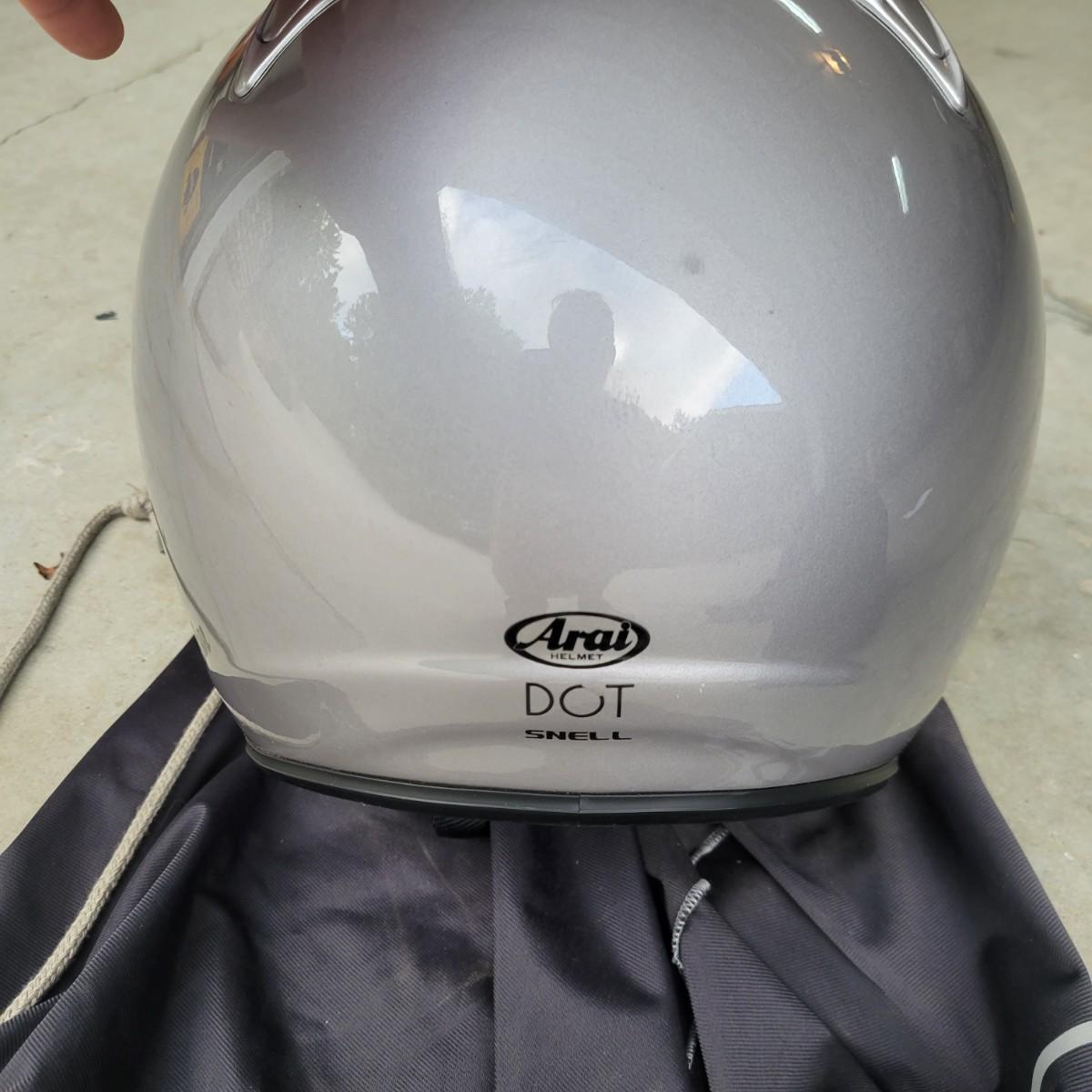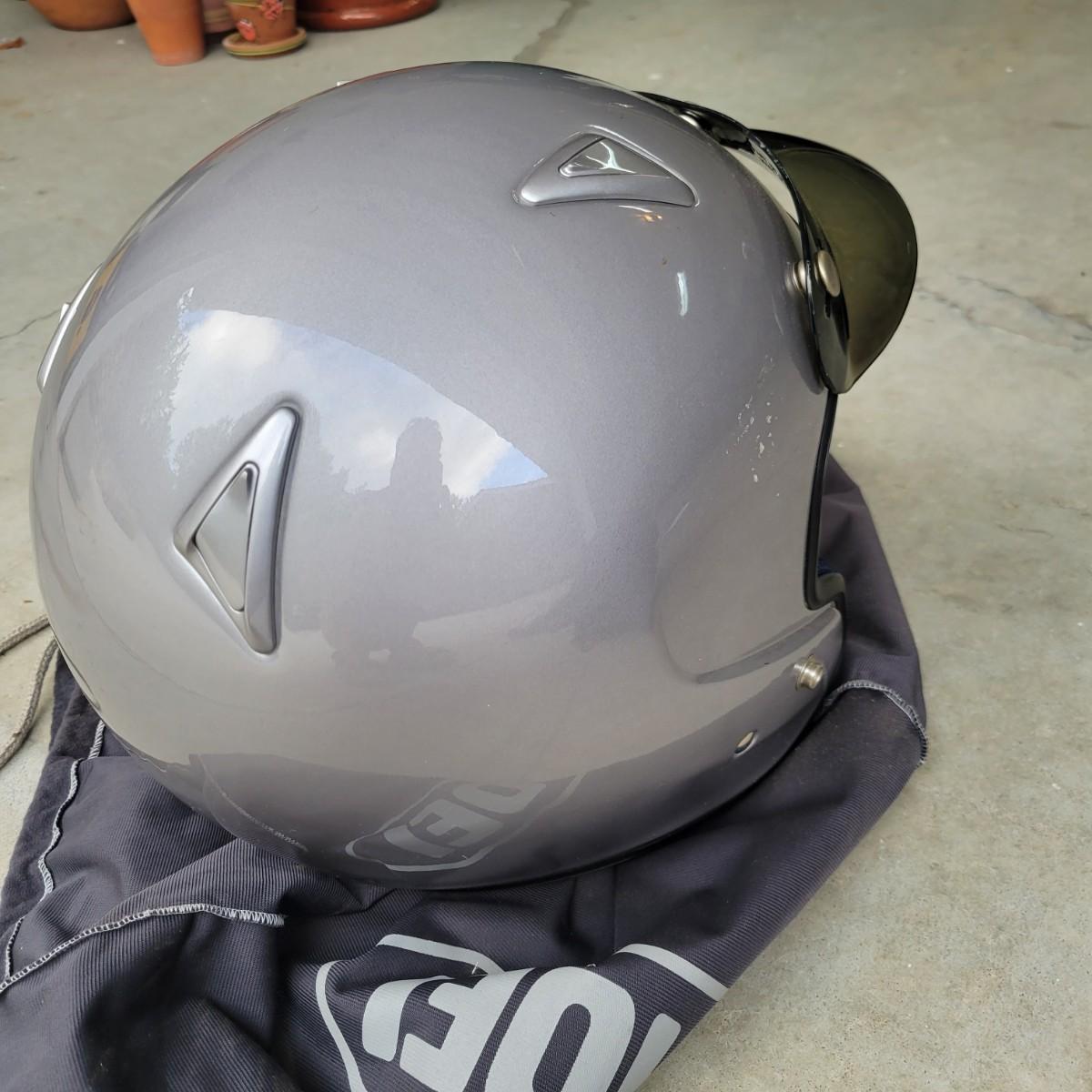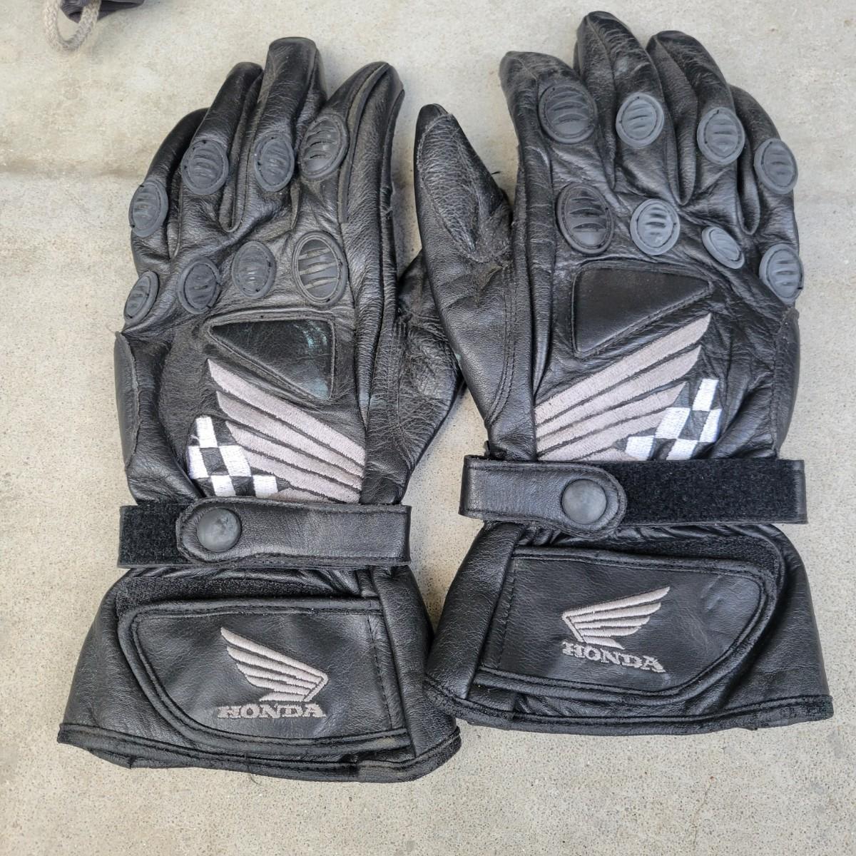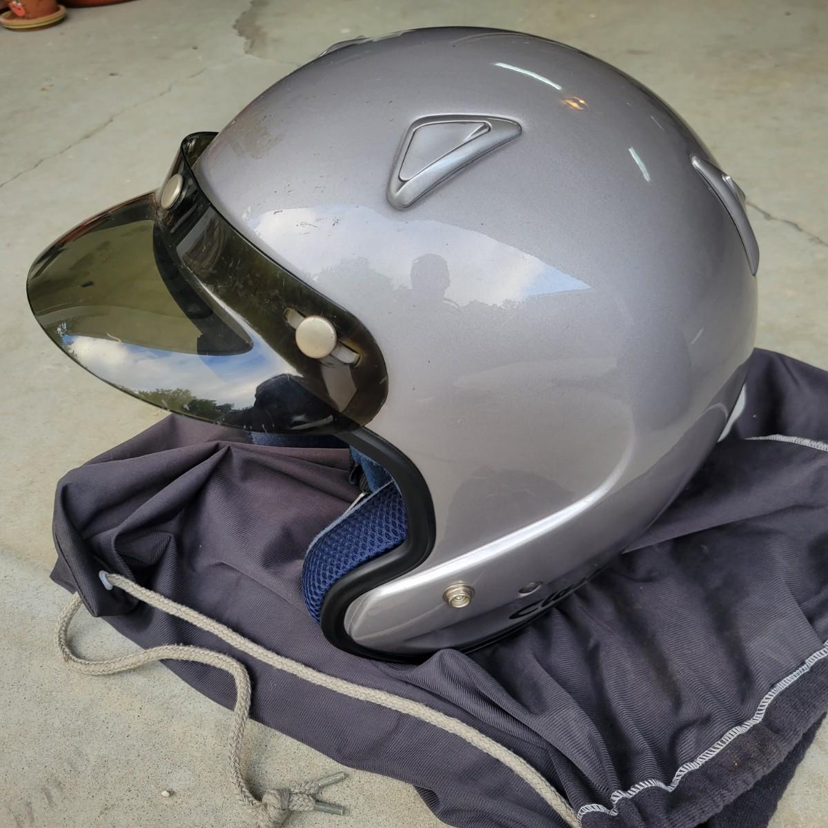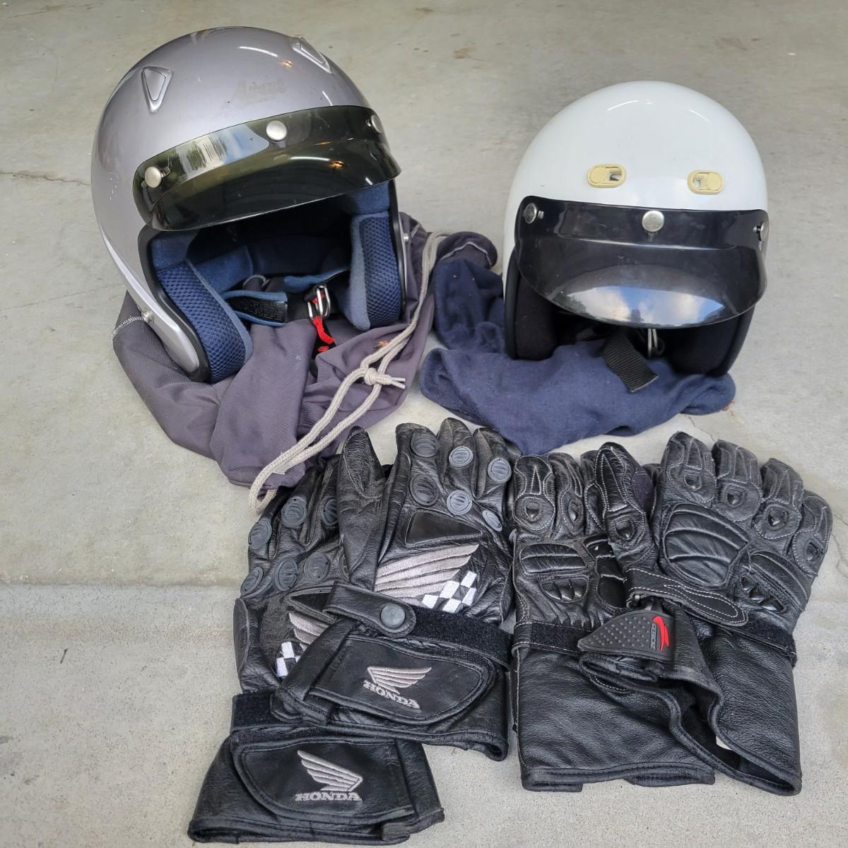 A pair of motorcycle helmets and gloves that show no apparent damage. Included is sz XL Aria Classic helmet with a storage bag and an unbranded helmet that is sz XS and also includes a storage bag. This lot also includes a pair of Honda sz L gloves and a pair of Gericke sz XL gloves. Shipping available