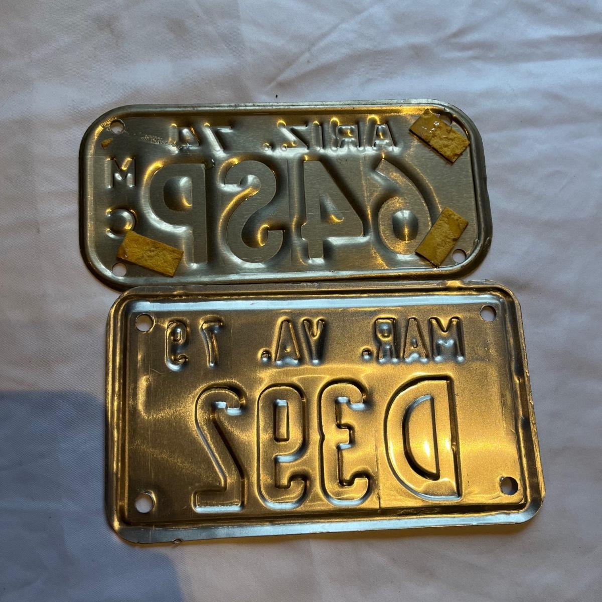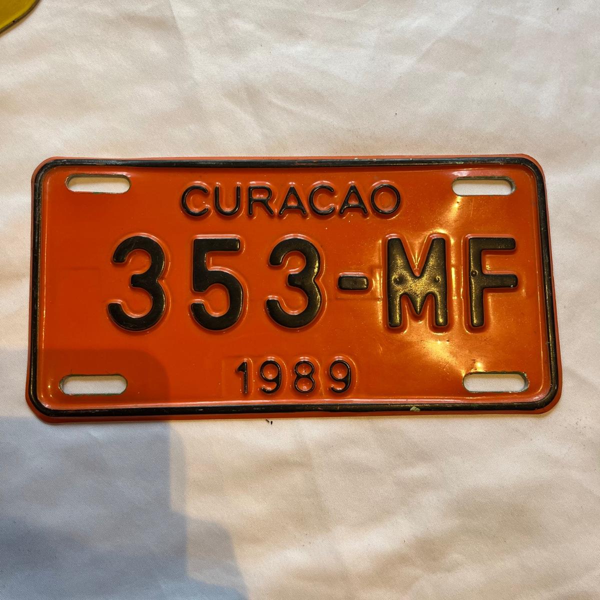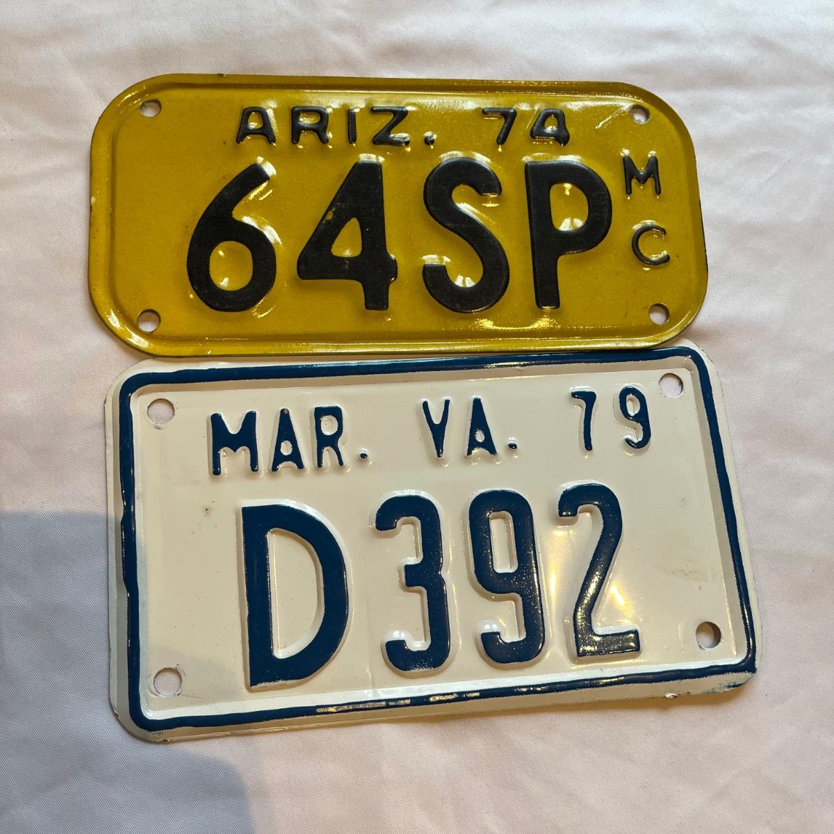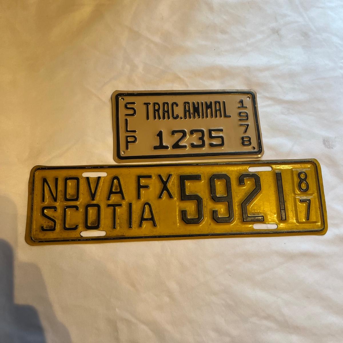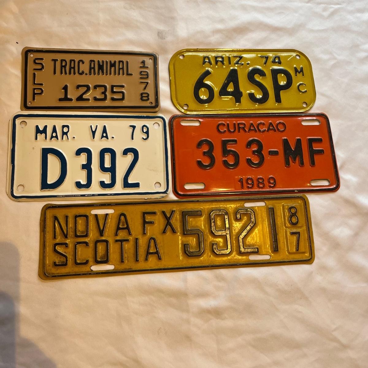 Lot includes a Curacao, Arizona and Virginia motorcycle license plate. Also includes Novia Scotia plate and a Trac Animal plate.