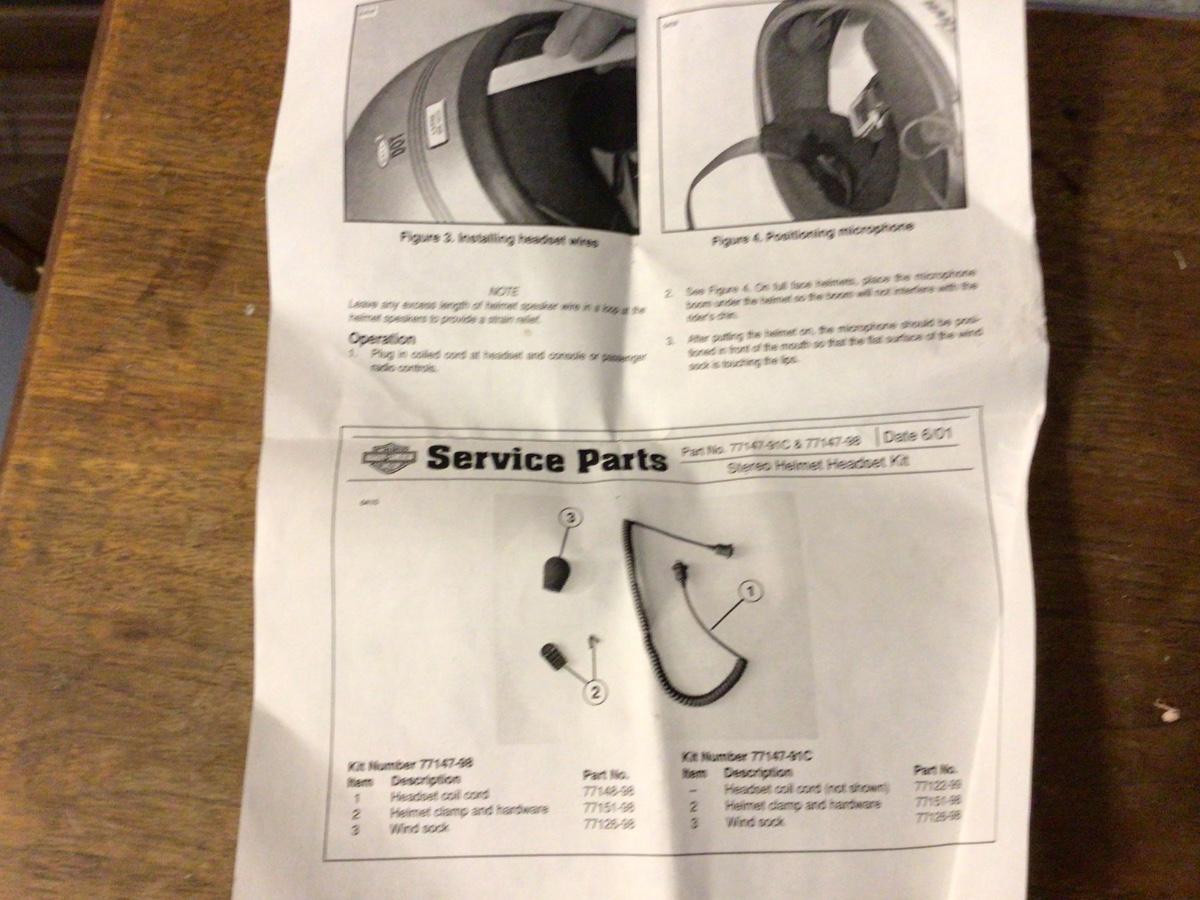 Kiwi Motorcycle or Snowmobile Helmet with clear plastic visor, Skidoo Helmet on visor, white snap on visor, Motorcycle Stero Hemet Headset with mic and instructions, Harley Davidson small bag with zipper.