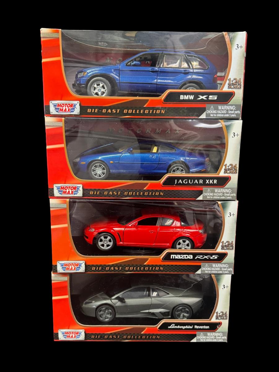 Includes BMW X5, Jaguar XKR, Mazda RX-8, and Lamborghini Reventon. Total of four pieces, in the original boxes.