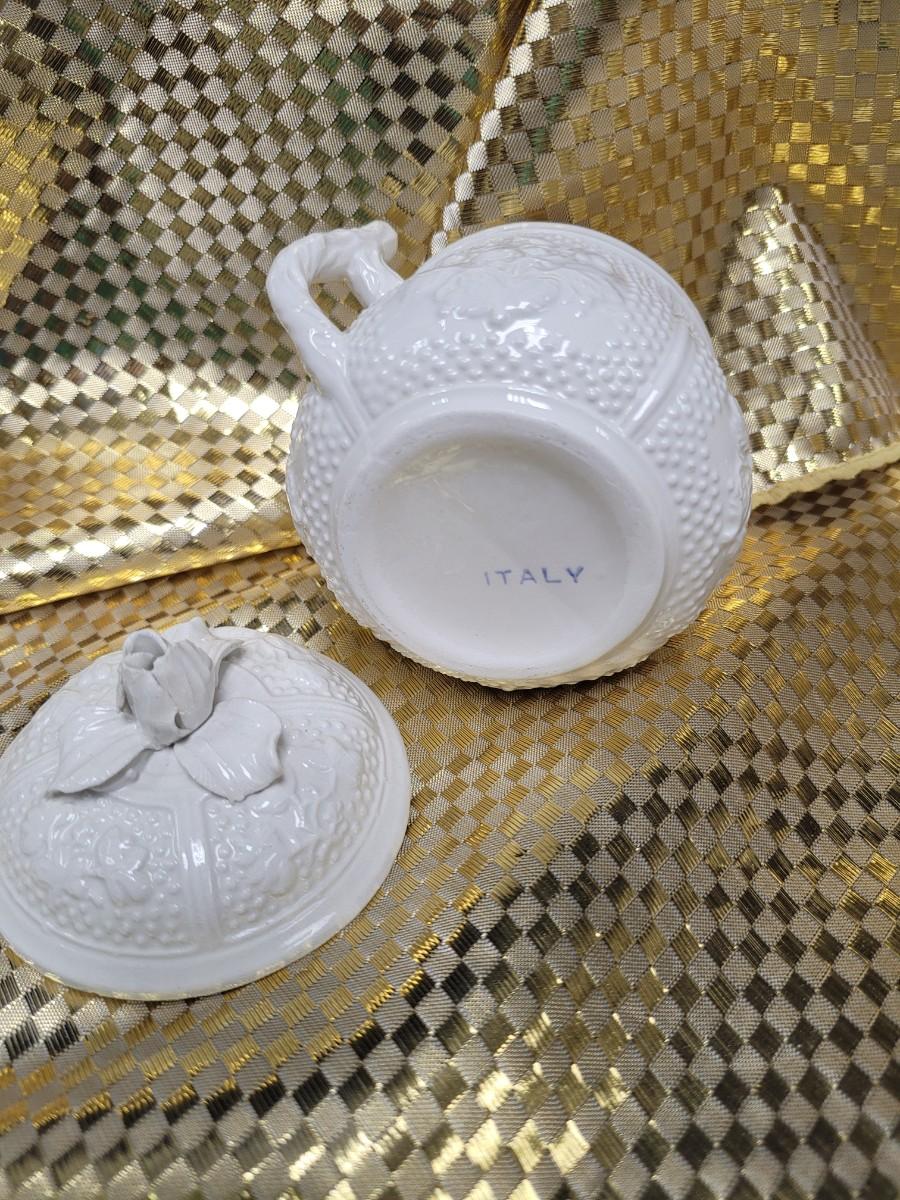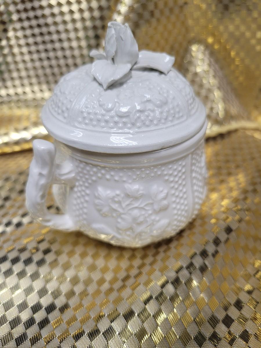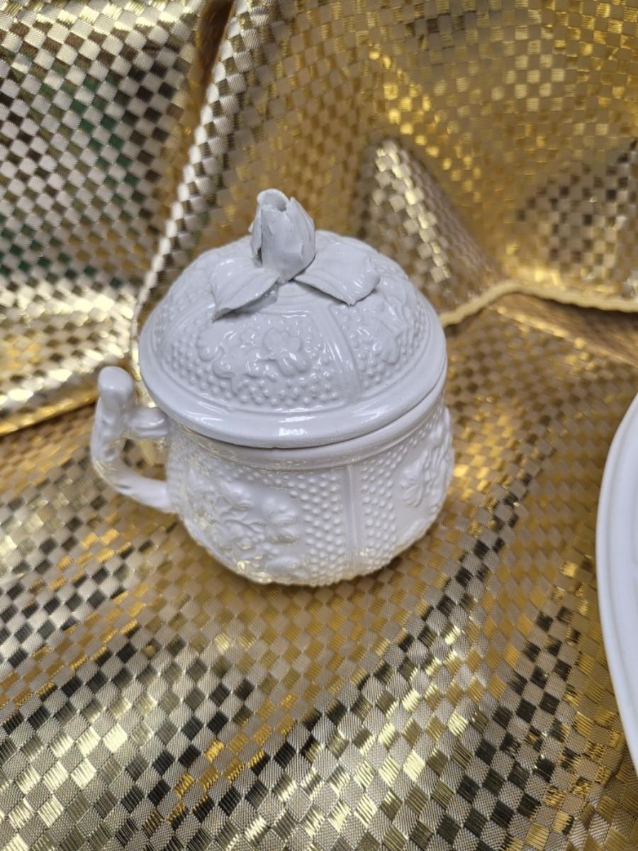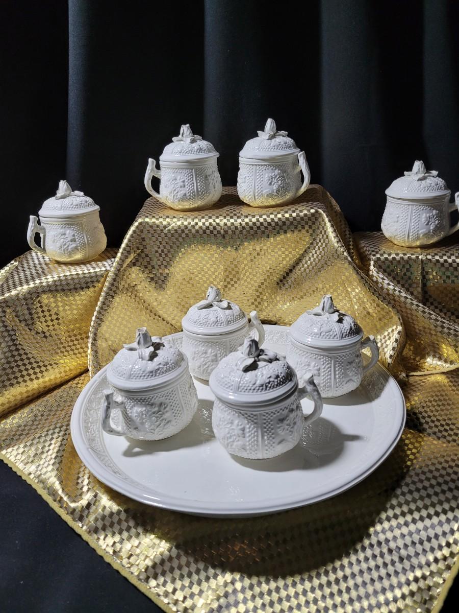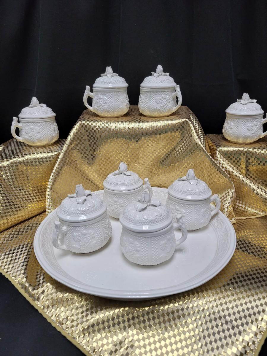 These dessert cups are reproduced from 18th Century designs from the Pont aux Chouz factory These are made of pottery rather than porcelain, with a delicate rosebud and leaf design. Not microwavable or dishwasher safe. Made in Italy. 8 Lidded cups with a serving tray. Research has these listed online at $35+ each.
