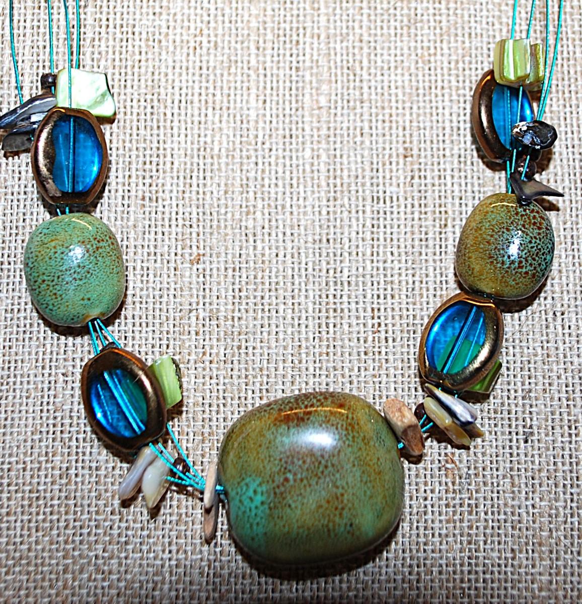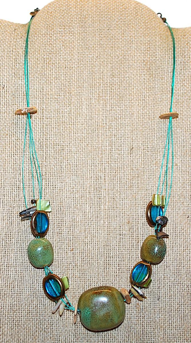 Mottled GREEN "RIVER STONES" NECKLACE with Irregular Shaped Stone Accents on a Semi-Stiff Wired Band & HALLMARK & Lobster Clasp 21" L