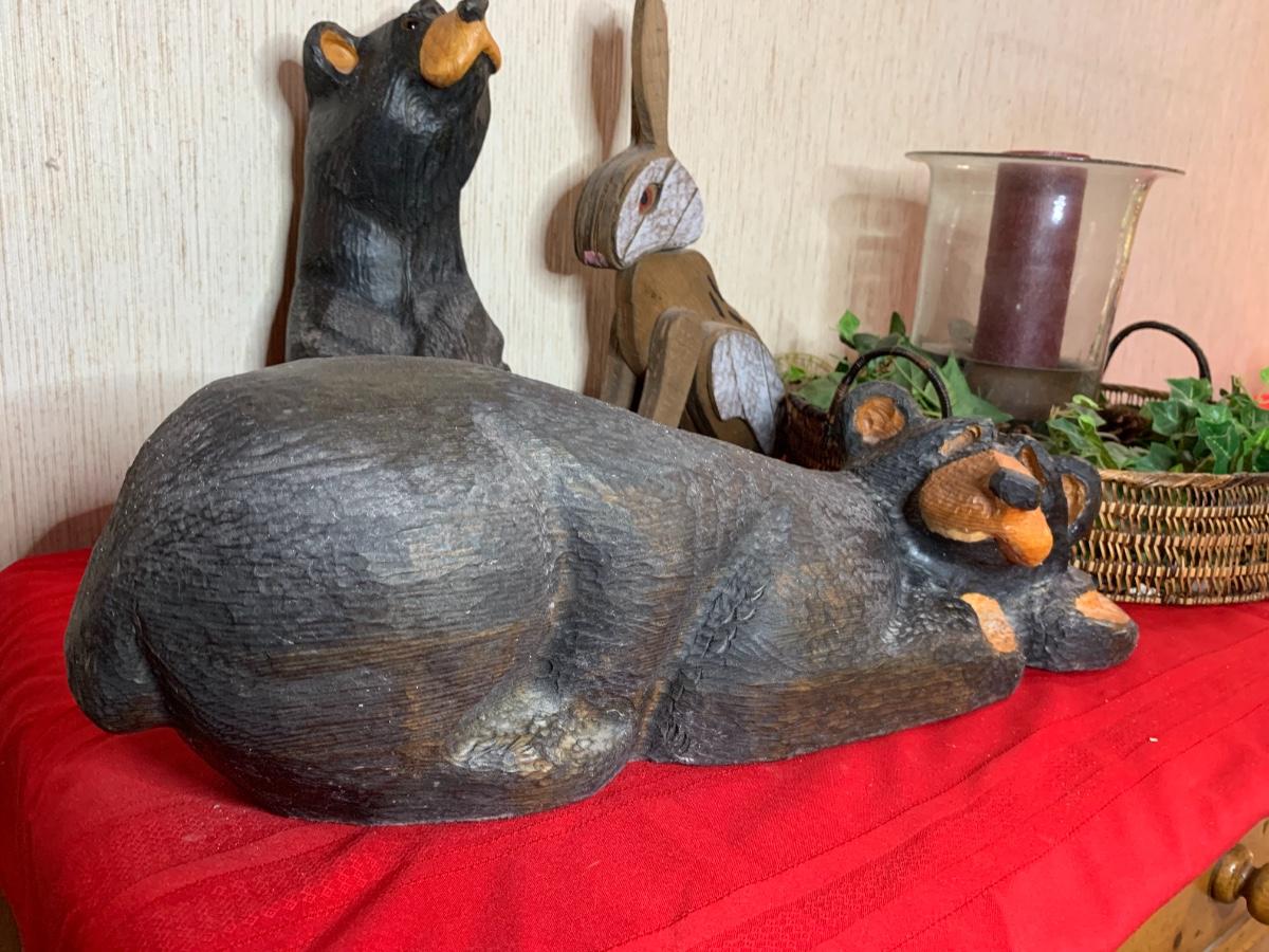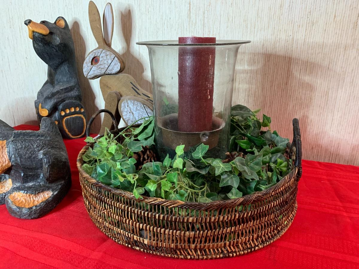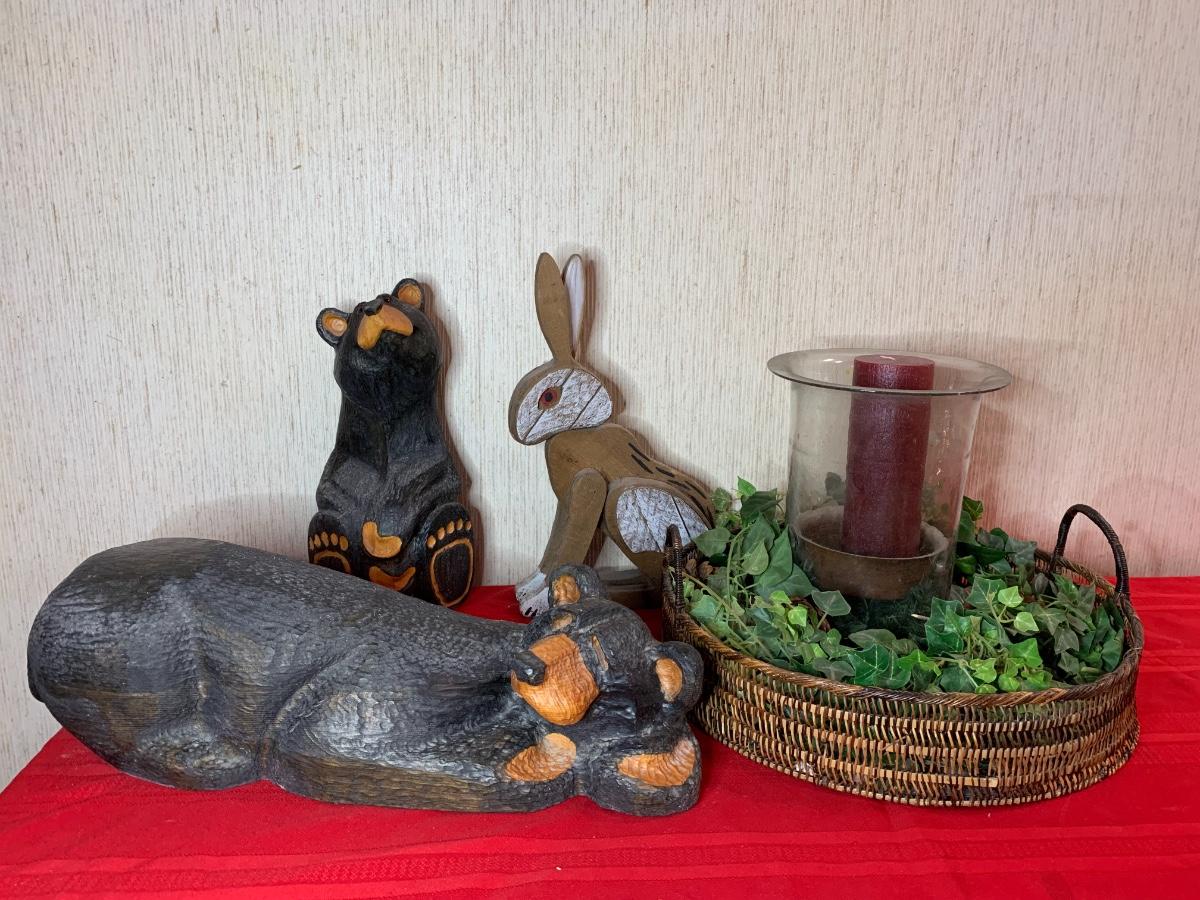 Misc mountain decor including two wooden carved bears, one wooden bunny and one large woven basket with removable candle in the center
