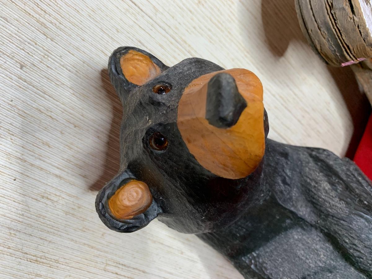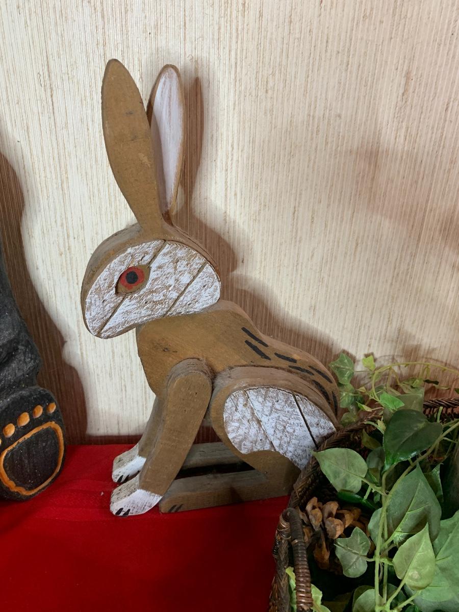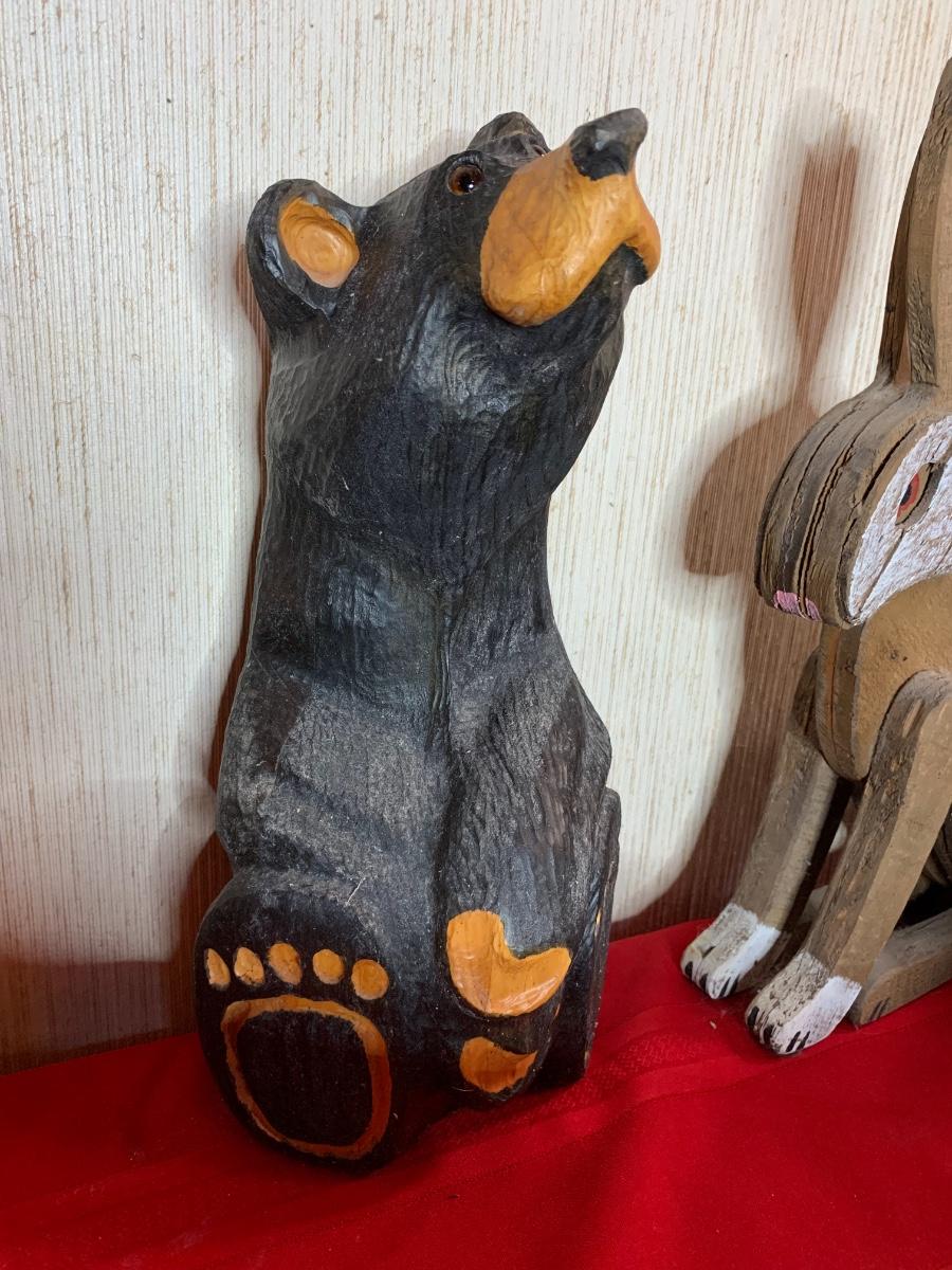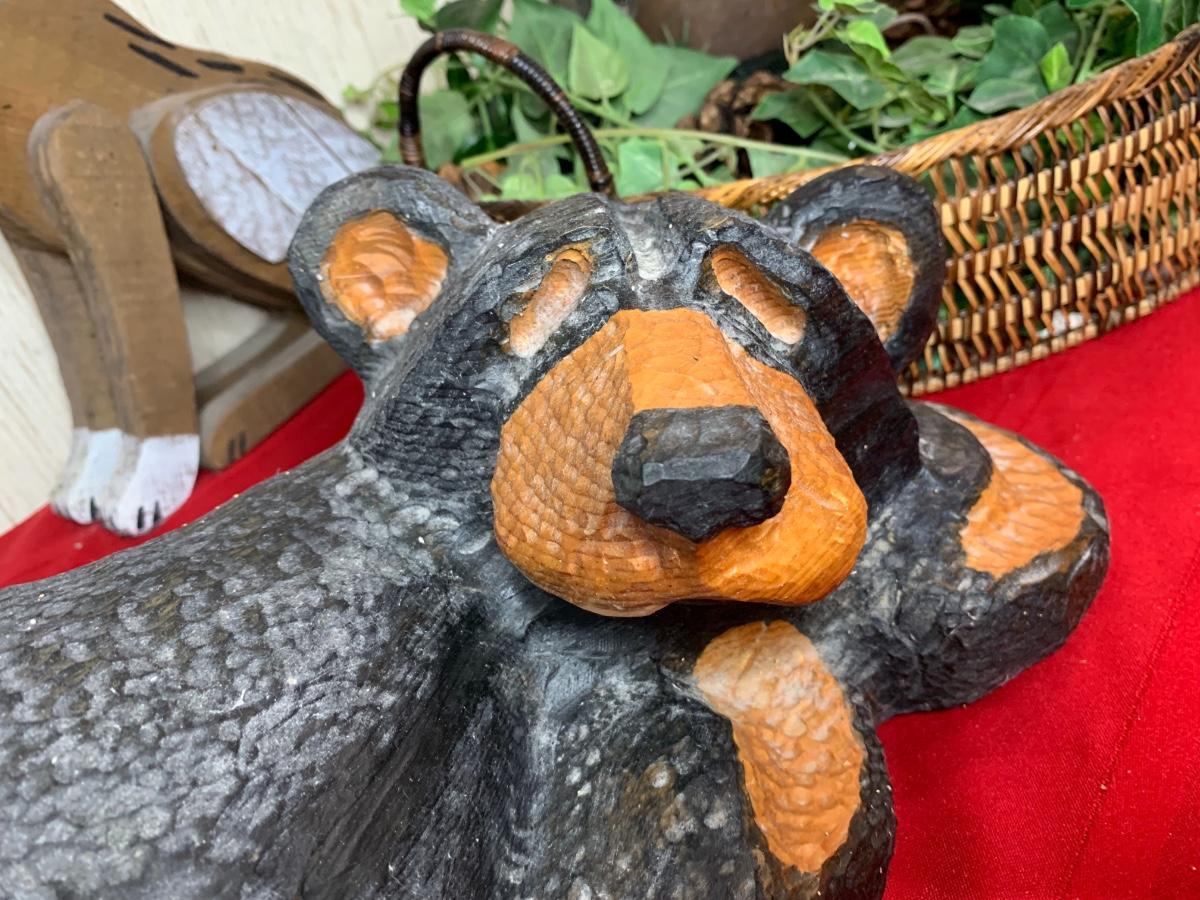 Misc mountain decor including two wooden carved bears, one wooden bunny and one large woven basket with removable candle in the center