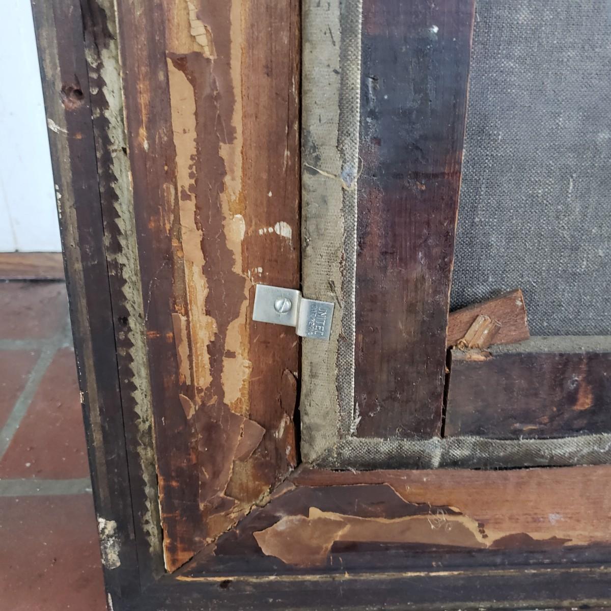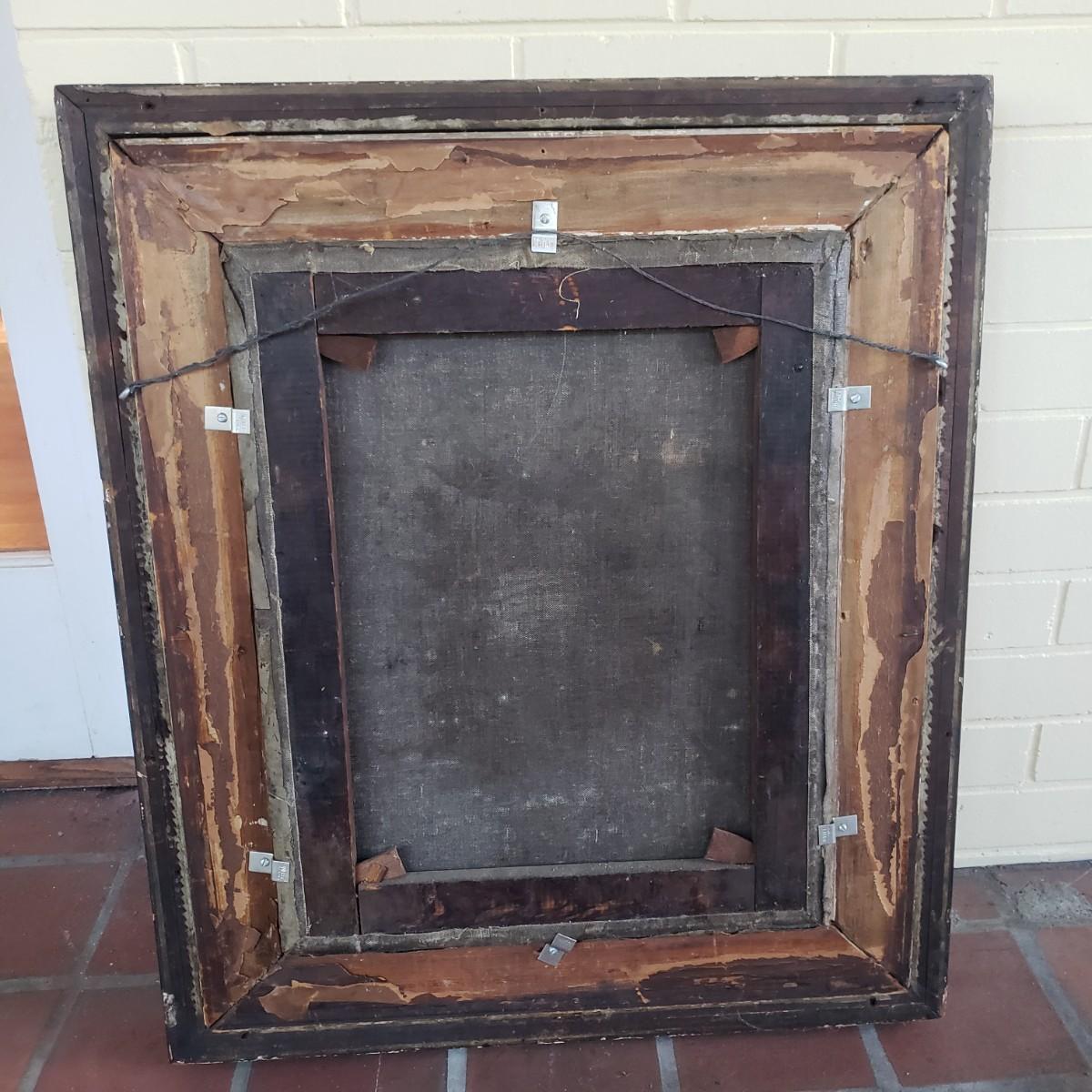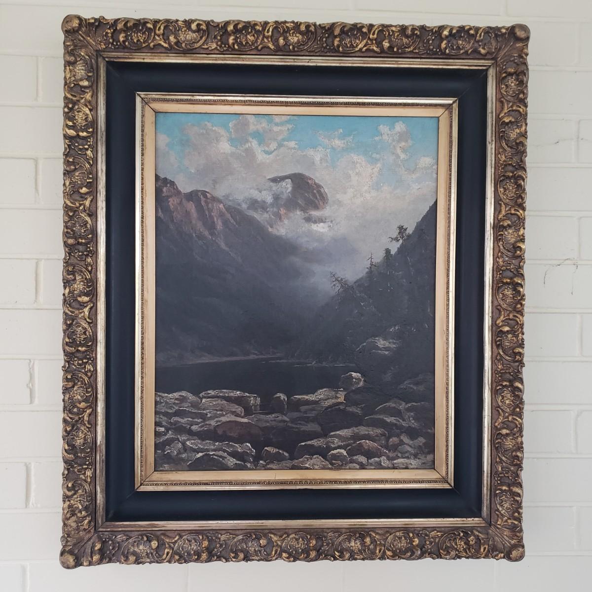 This majestic mountain scene painting is wrapped in a wooden ornate frame using black and golds. The piece is heavy. It appears that there are no markings identifying the artist. The piece measures 24" x 3" x 28". The painting appears to have been restored.