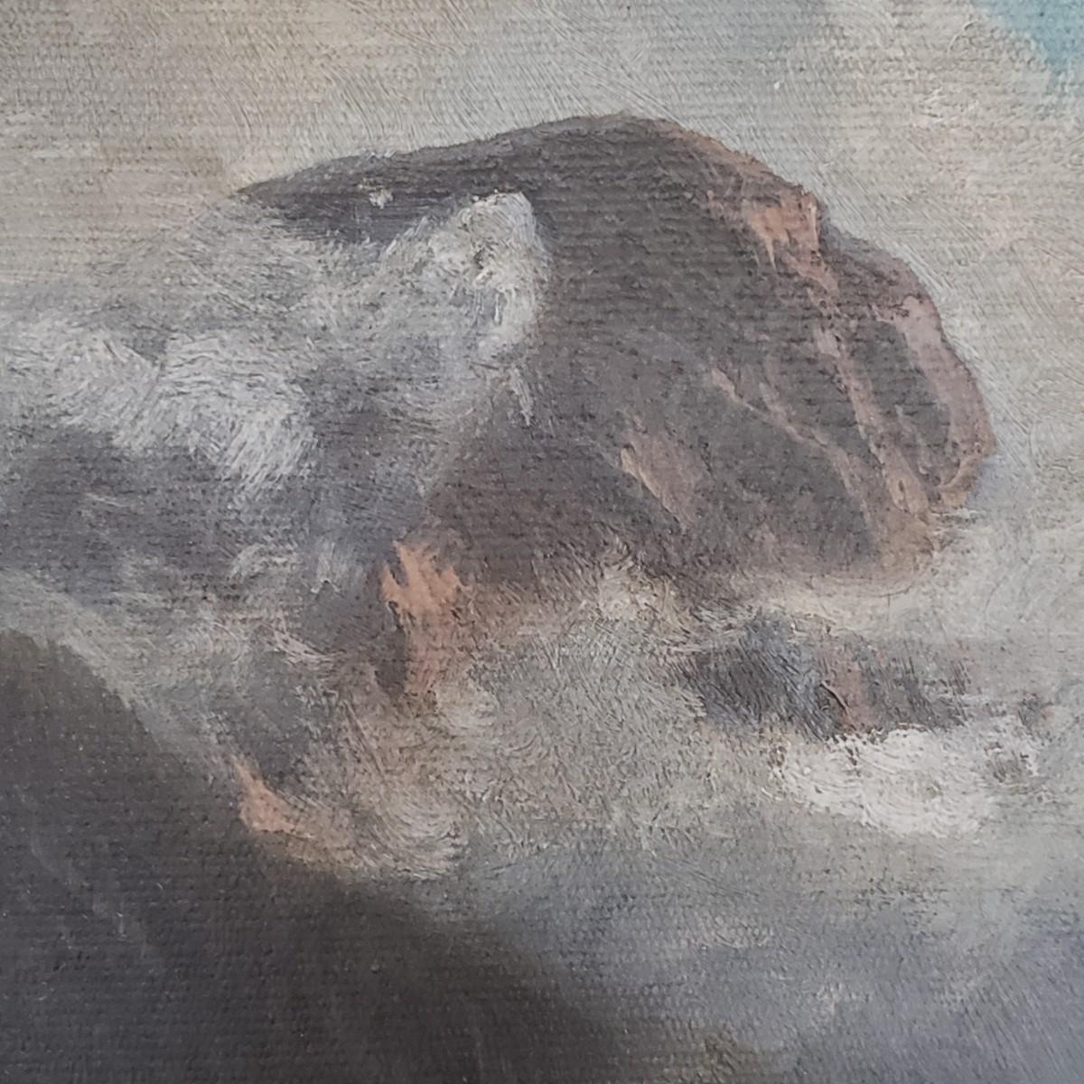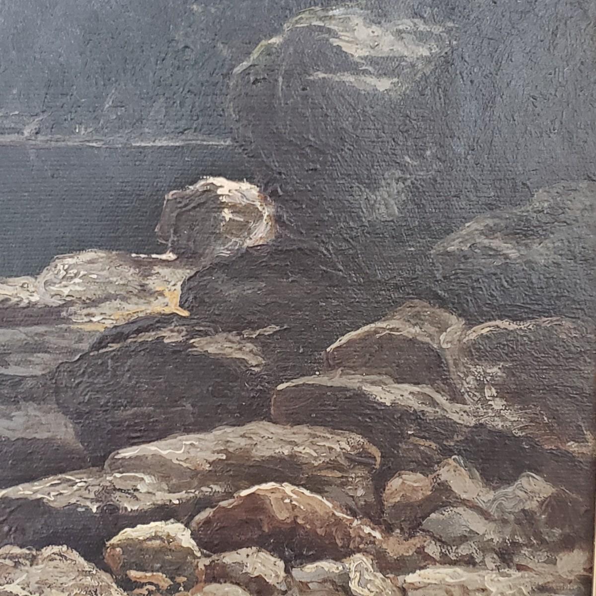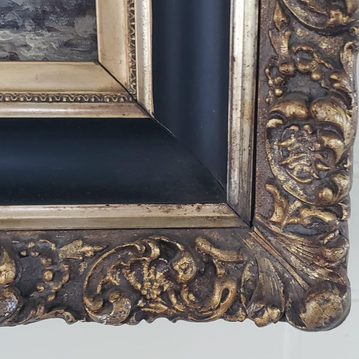 This majestic mountain scene painting is wrapped in a wooden ornate frame using black and golds. The piece is heavy. It appears that there are no markings identifying the artist. The piece measures 24" x 3" x 28". The painting appears to have been restored.