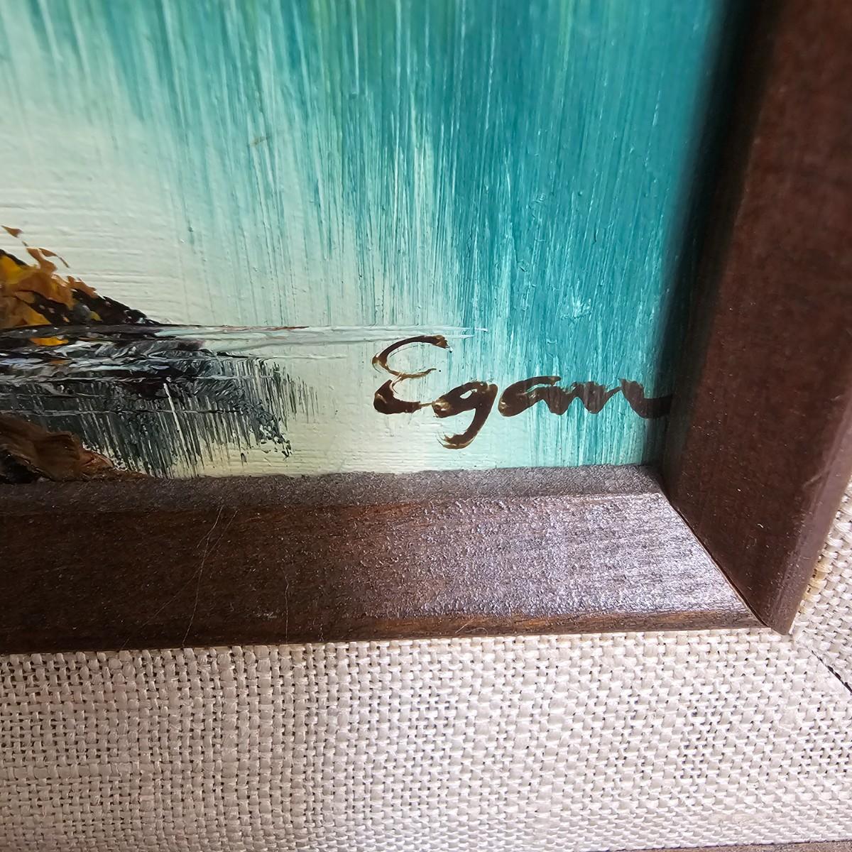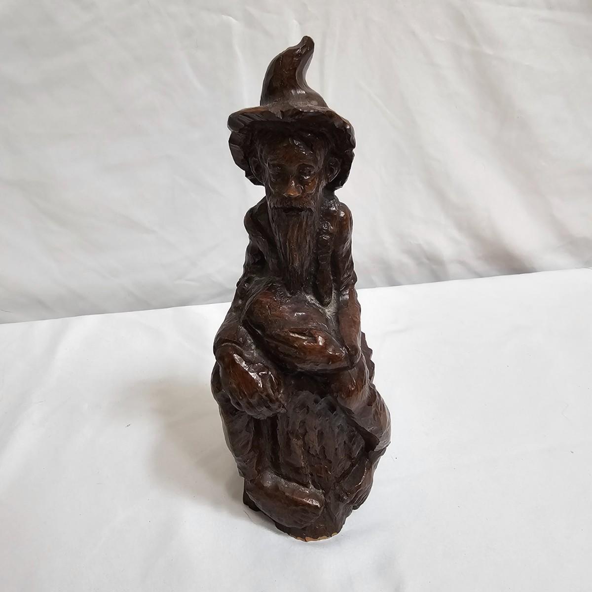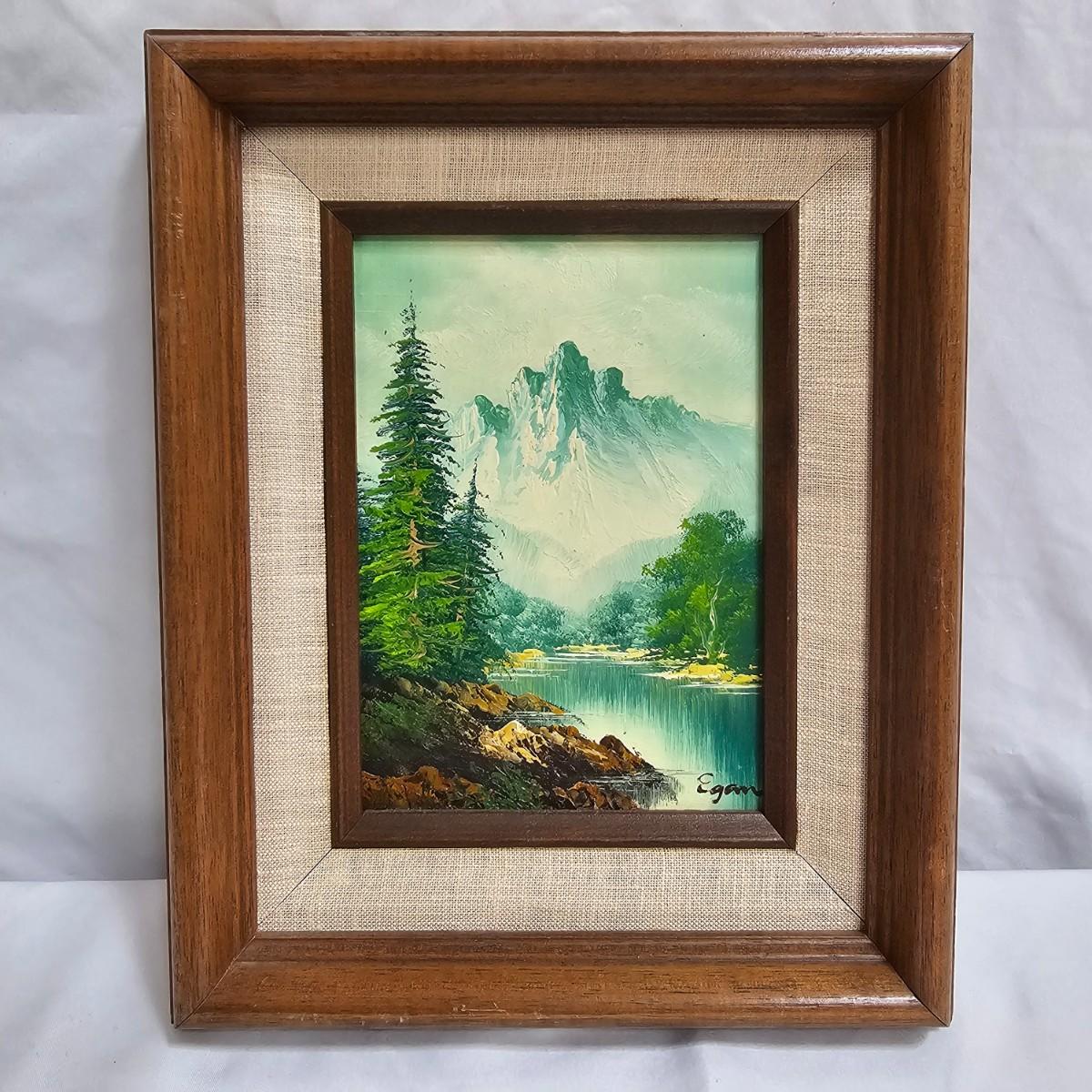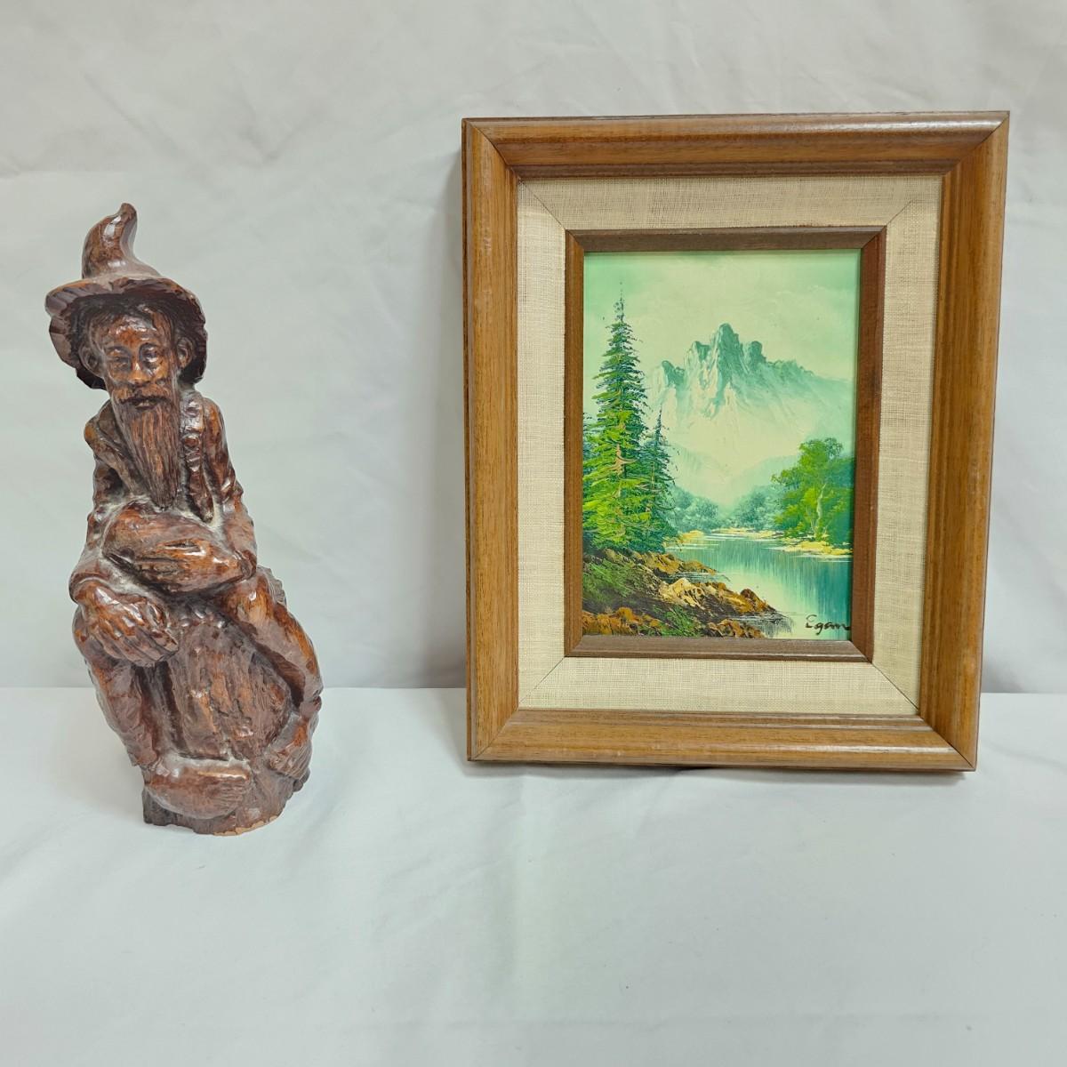 Whimsical mountain man figure in cast resin. This bearded man in overalls sits barefoot a stump, holding a jug. Figure measures 3.5" x 3.5" x 9"H. Oil painting is a mountain landscape on what appears to be a launch plywood back. Signed Egan this piece is 8.25" x 10.5" in wood frame. See photos for details. Shipping available.