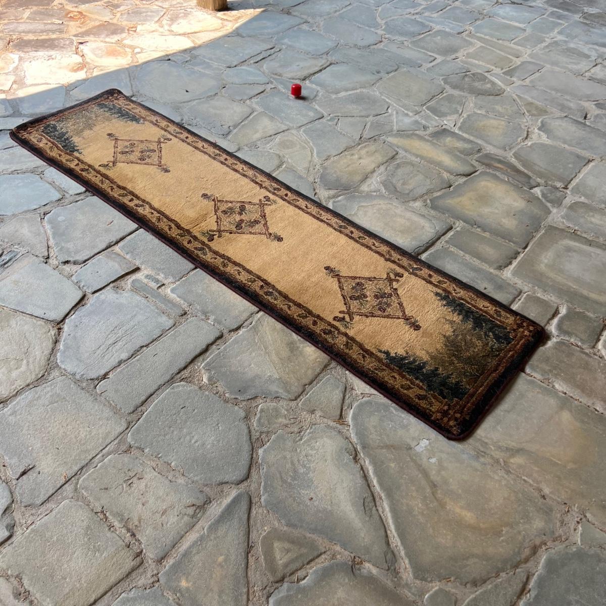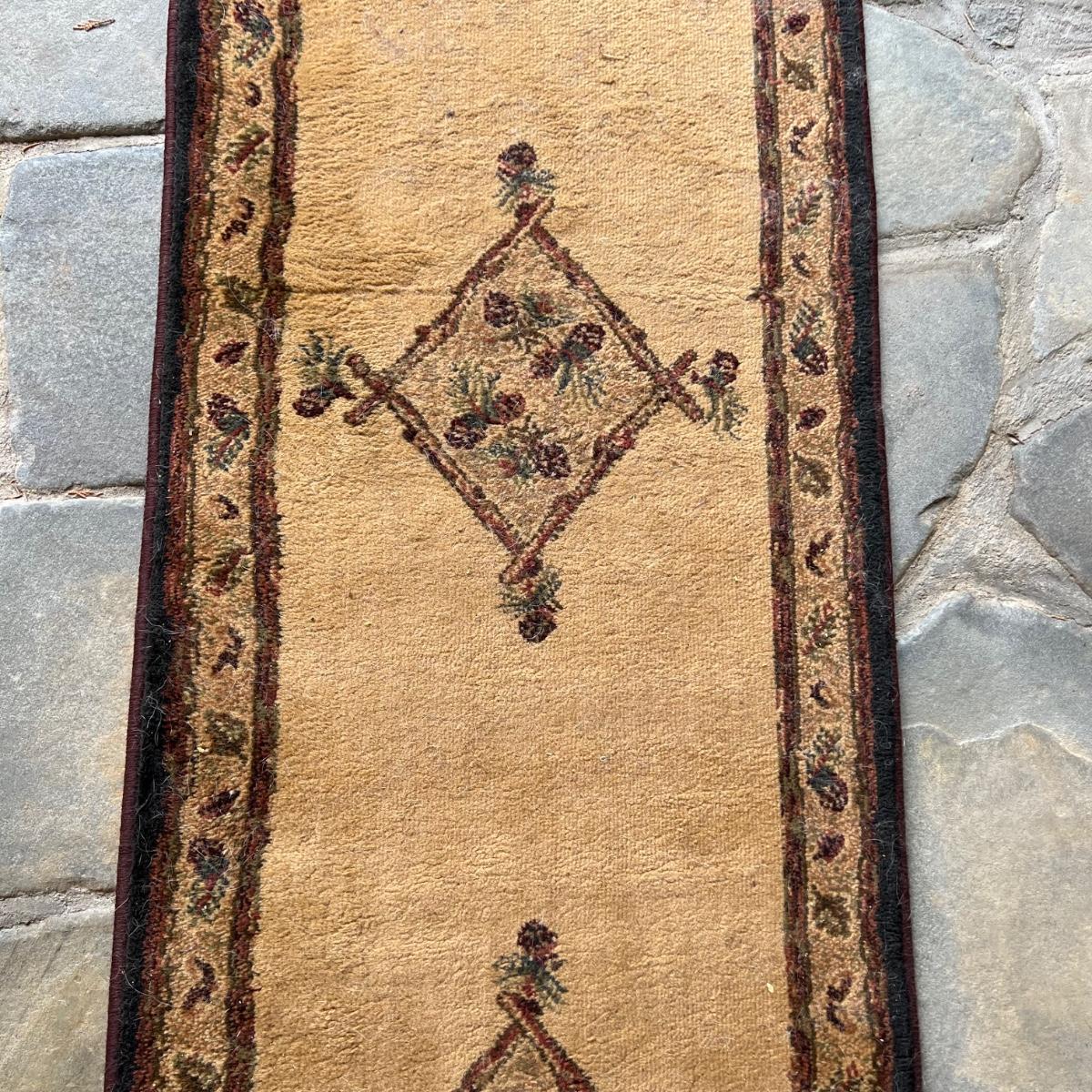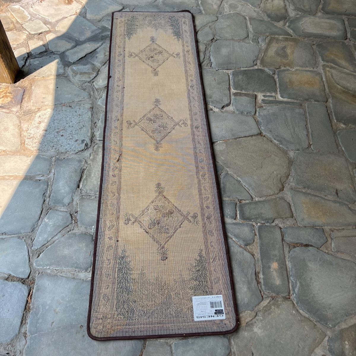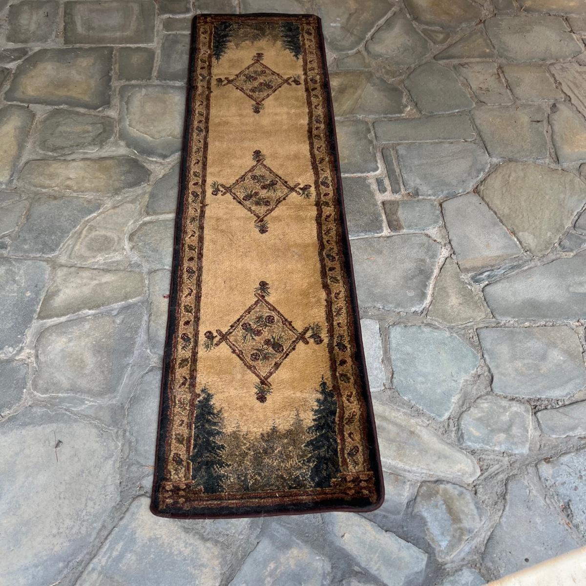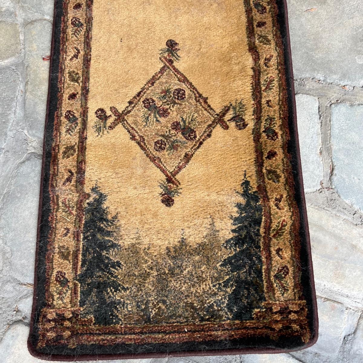 Forest scene acrylic runner is 2’ x 8’. The sage, brown, maroon and tan rug is a soft to the touch runner.