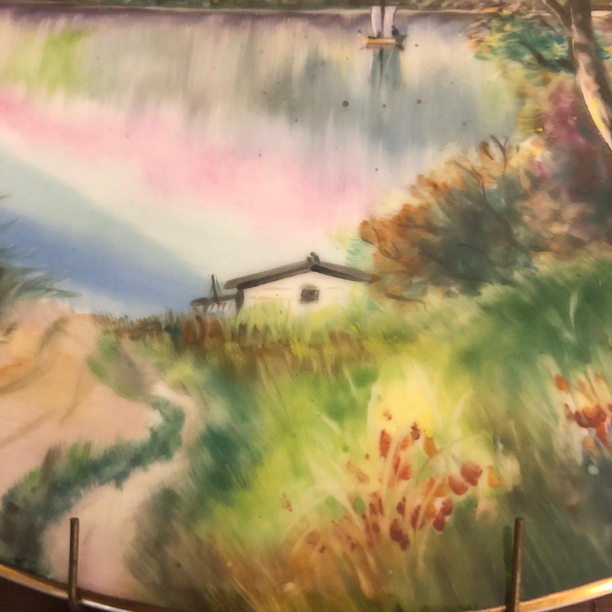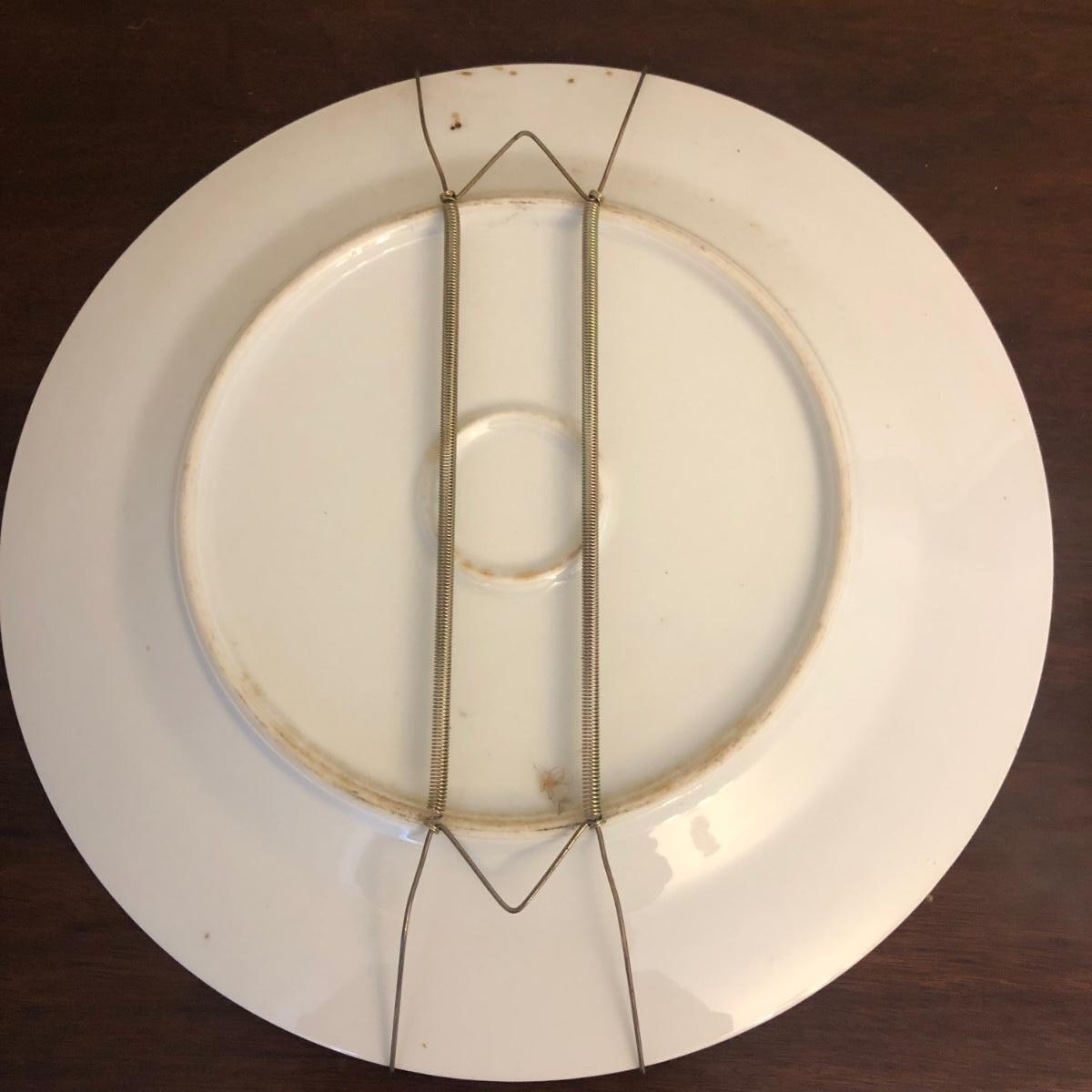 The decorative Plate has an Asian flair, gold rim and measures 12” in diameter. The plate also has a hanger on it. Shipping Available.
