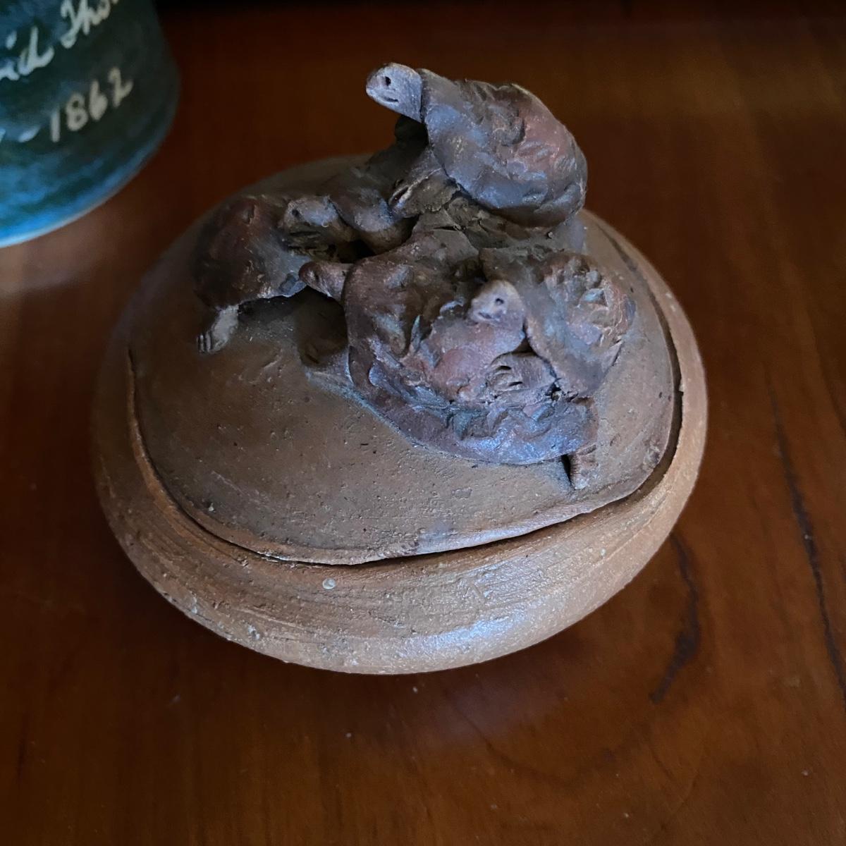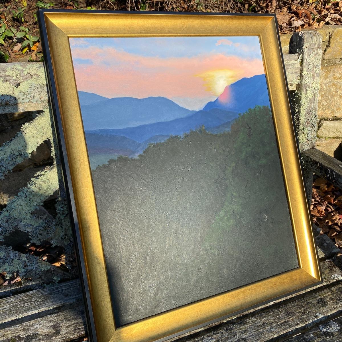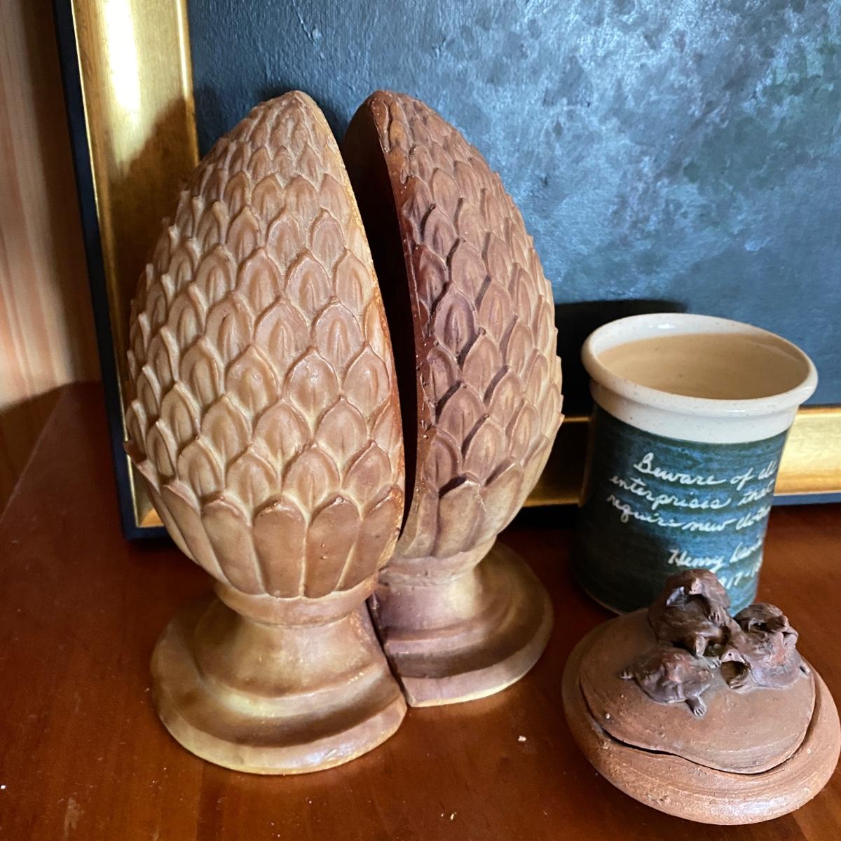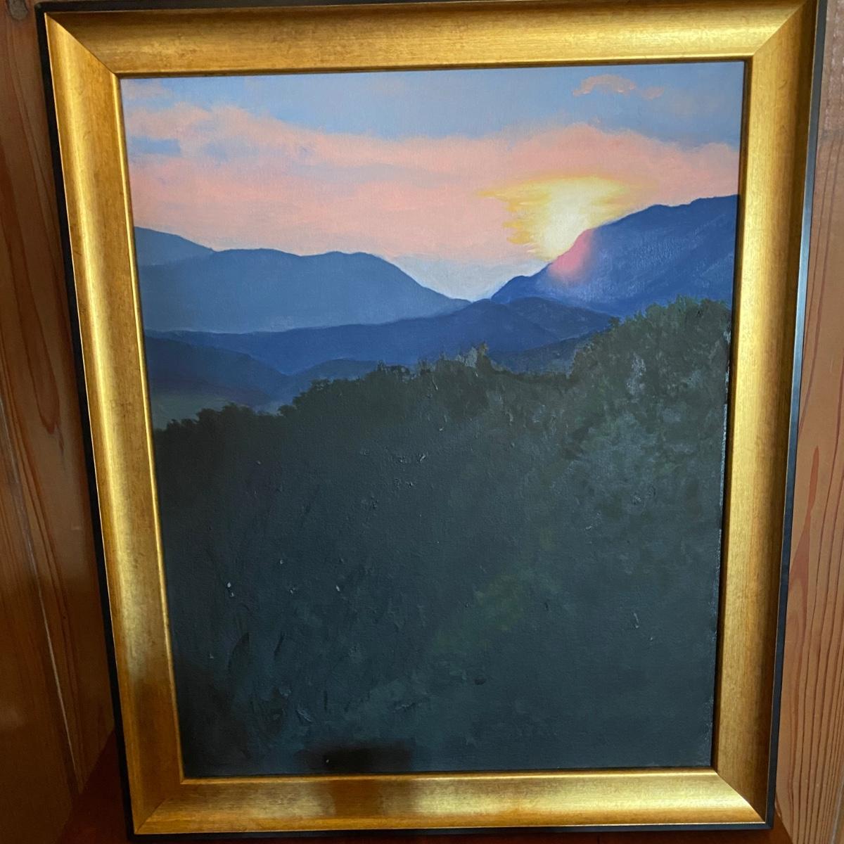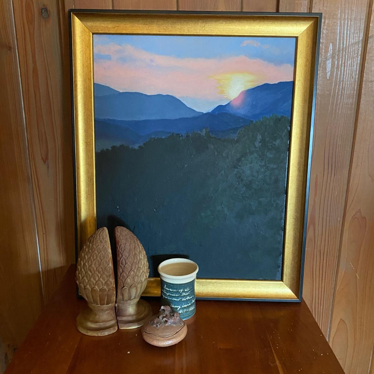 Beautiful oil painting of a blue ridge mountain sunset (or sunrise!). Appears to be an original but does not have a signature. Measures 19” x 23”. Lot also includes acorn book ends, small signed cup with Thoreau quote, and a cute small signed lidded pot with turtles on top. 4”d x 2”h. One turtle appears to have a broken head but it’s hard to tell for certain. Shipping available. Shipping art can be costly. We suggest calling our local UPS with dimensions and getting an estimate before bidding: (828) 252-6930.