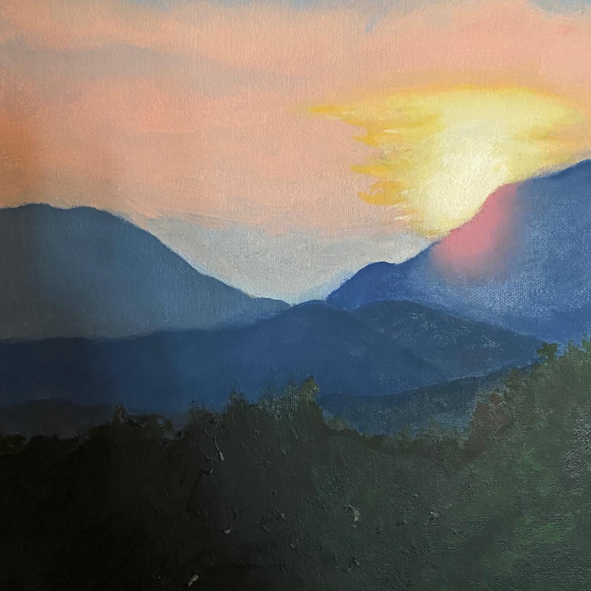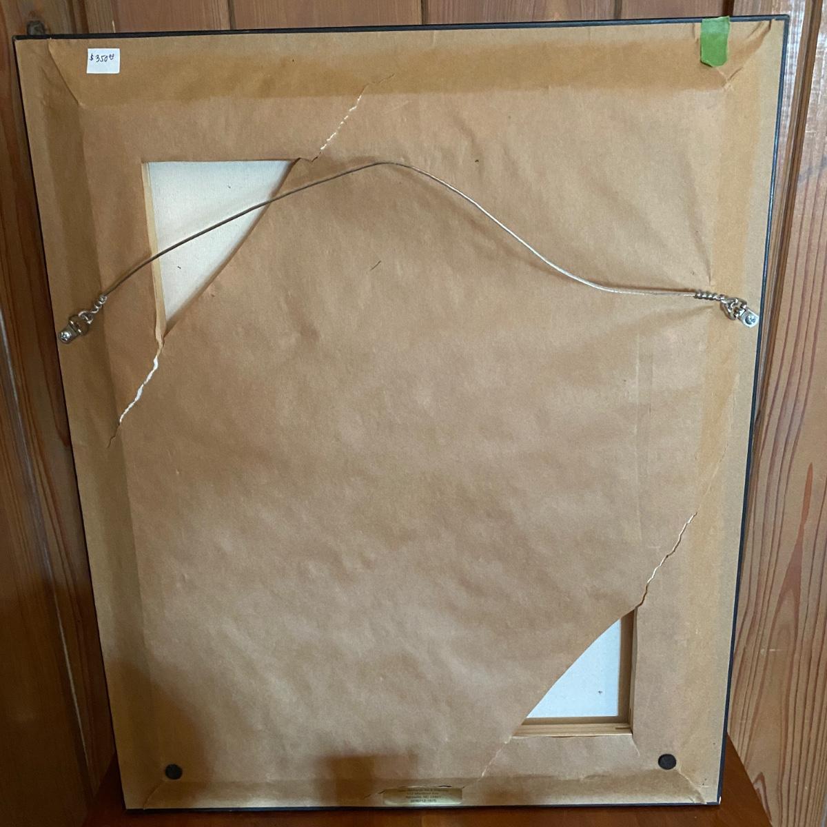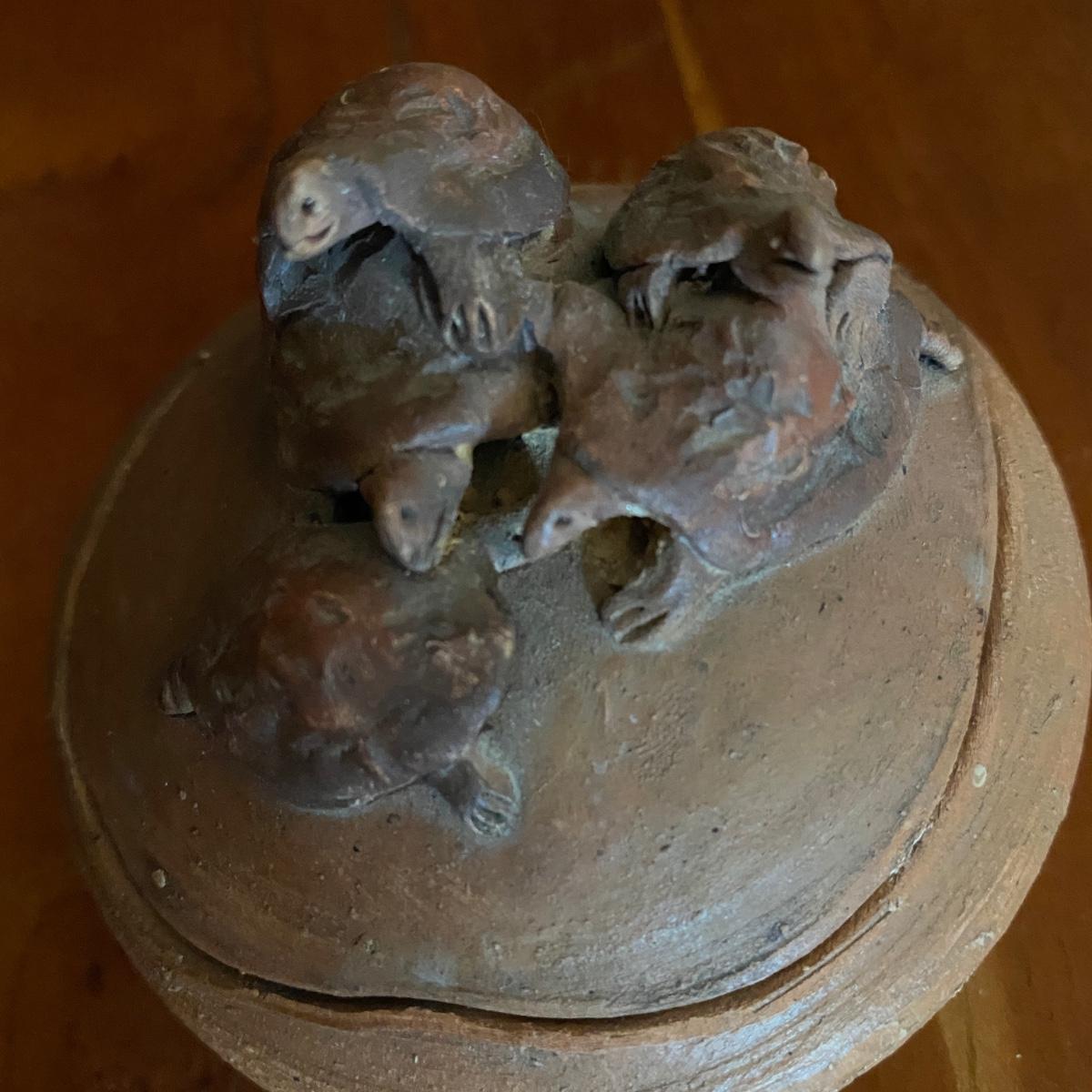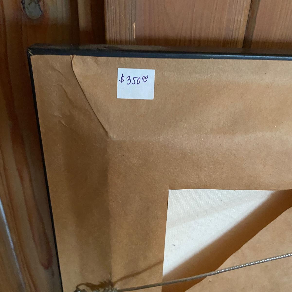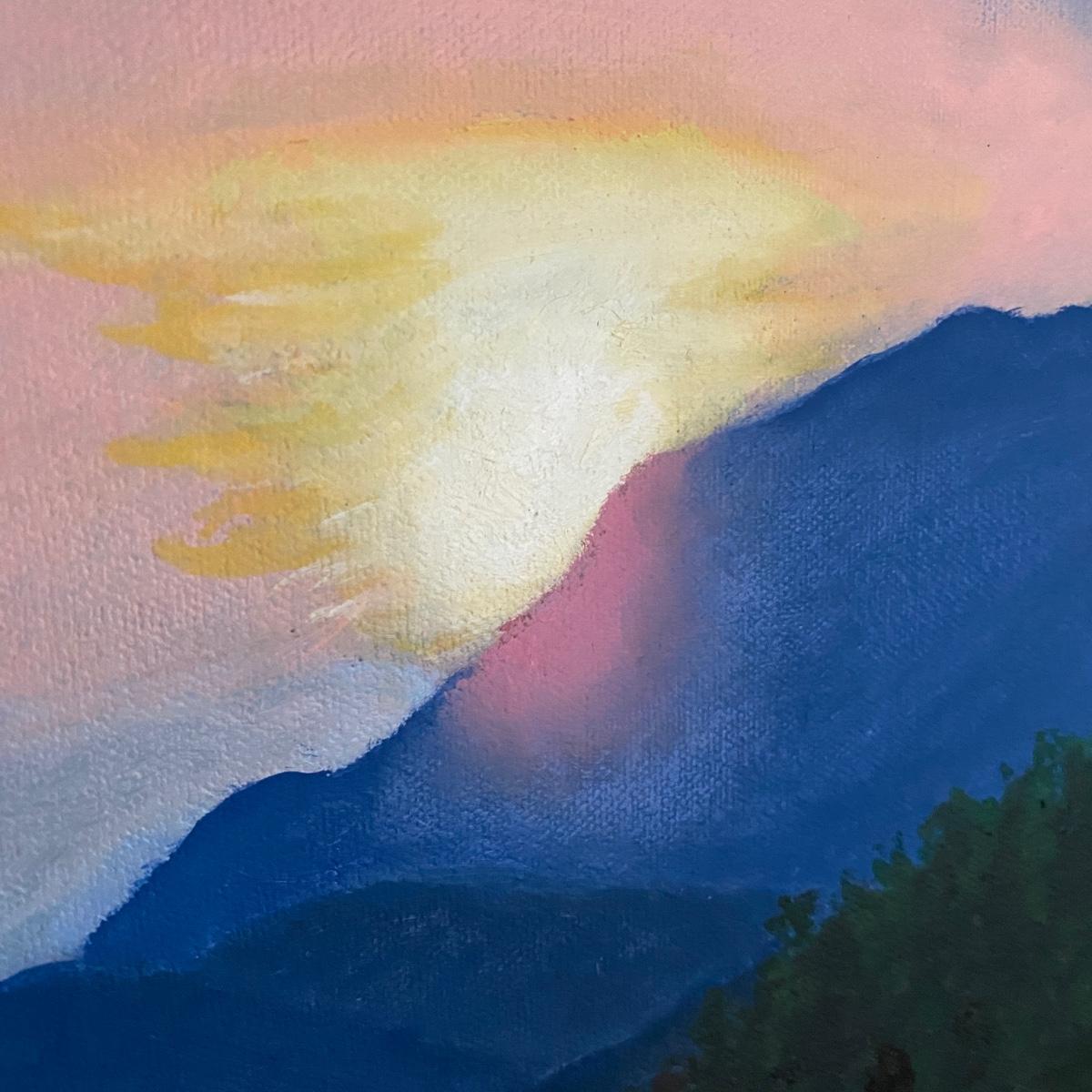 Beautiful oil painting of a blue ridge mountain sunset (or sunrise!). Appears to be an original but does not have a signature. Measures 19” x 23”. Lot also includes acorn book ends, small signed cup with Thoreau quote, and a cute small signed lidded pot with turtles on top. 4”d x 2”h. One turtle appears to have a broken head but it’s hard to tell for certain. Shipping available. Shipping art can be costly. We suggest calling our local UPS with dimensions and getting an estimate before bidding: (828) 252-6930.