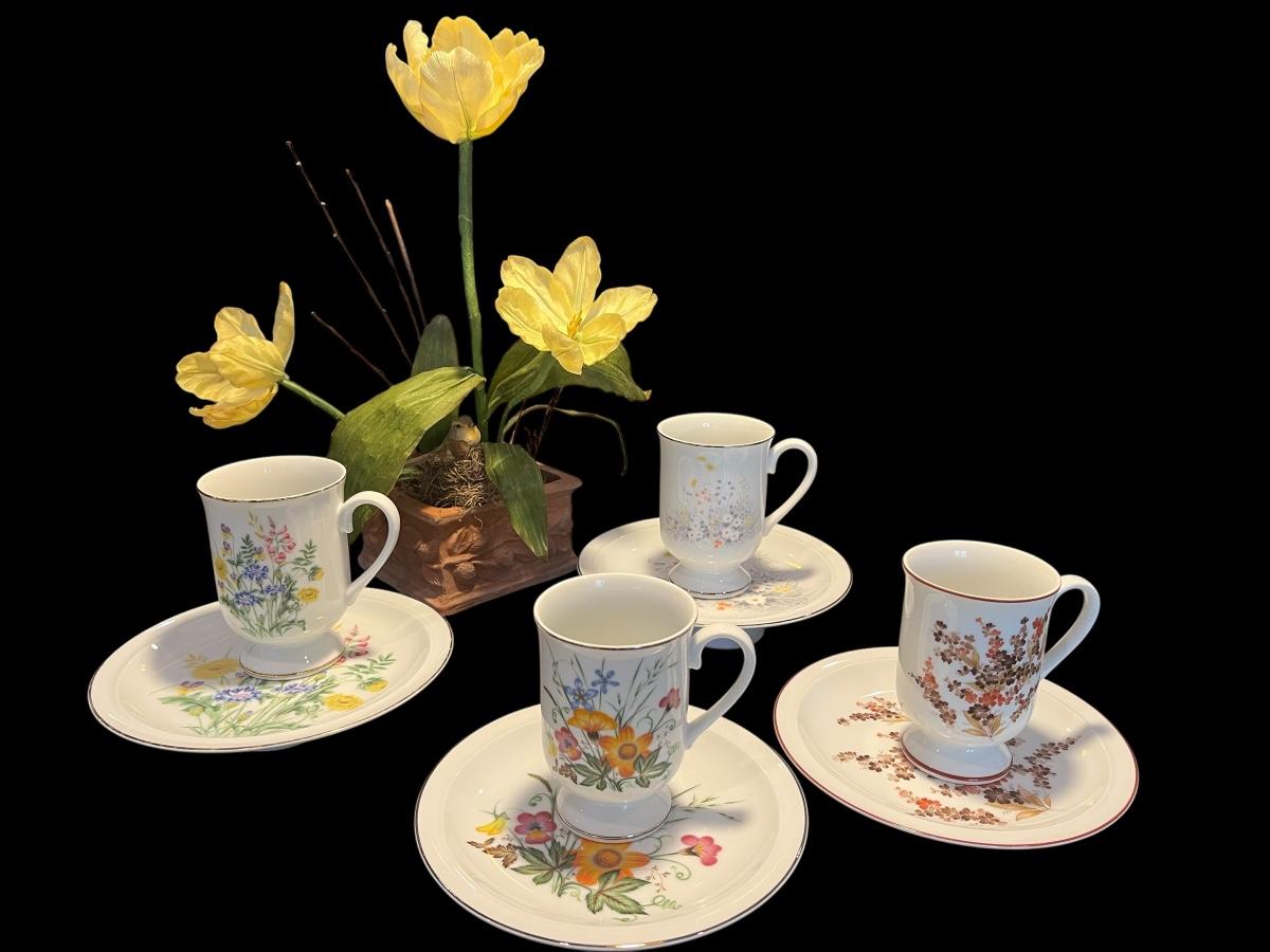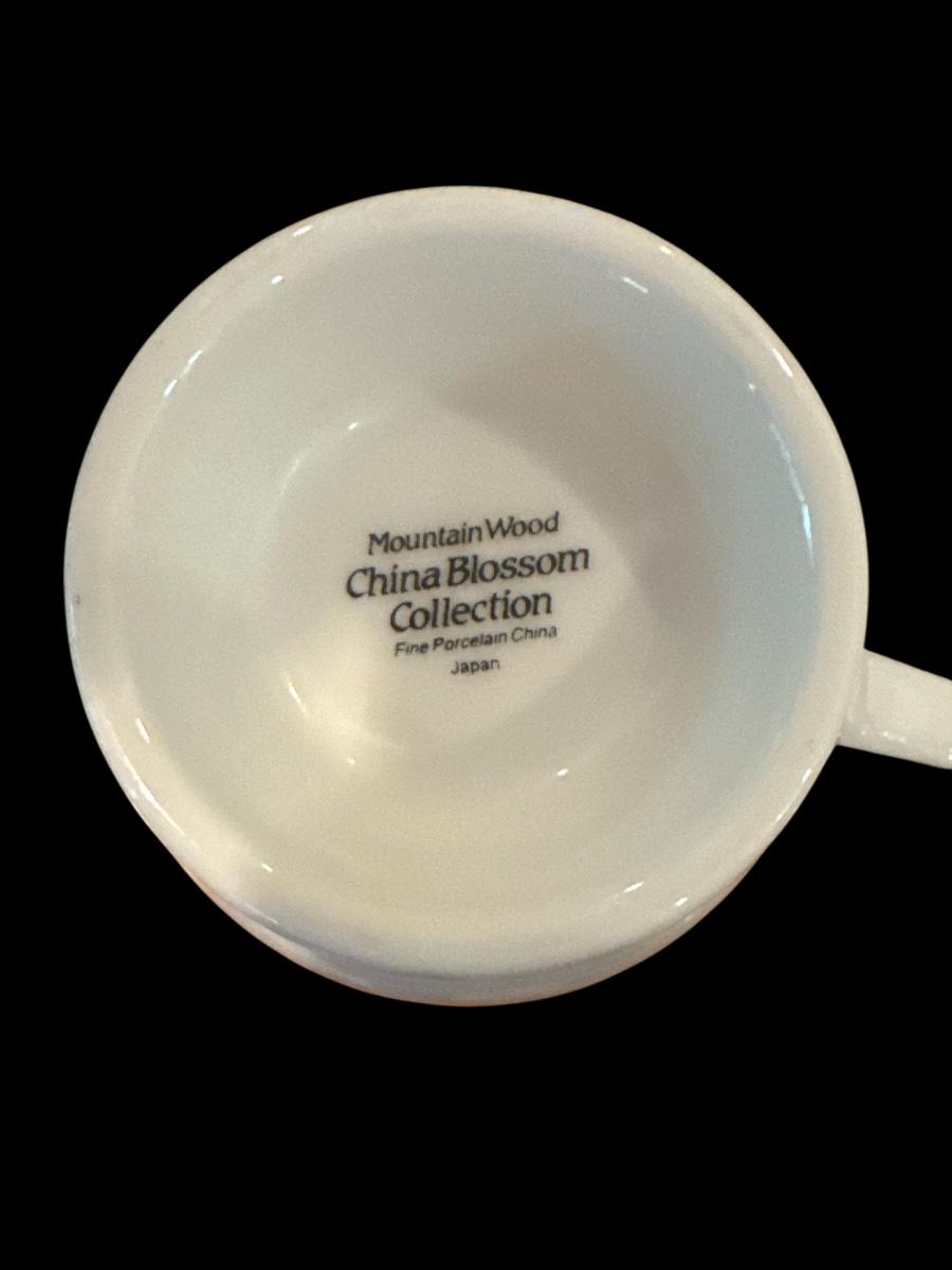 Set of four fine porcelain demitasse cups with matching saucers from the Mountain Wood China Blossom Collection (Japan). Each cup features a unique floral motif