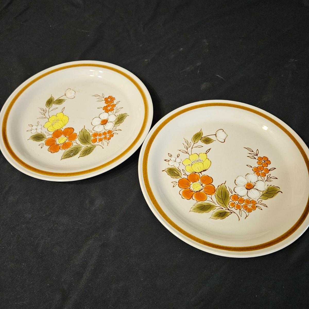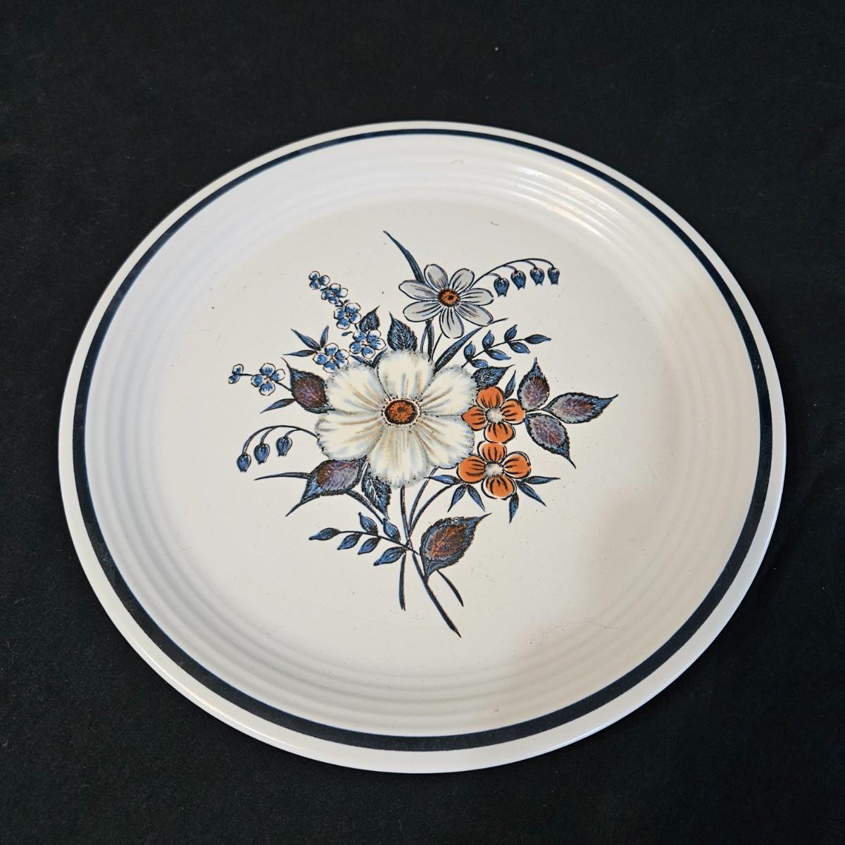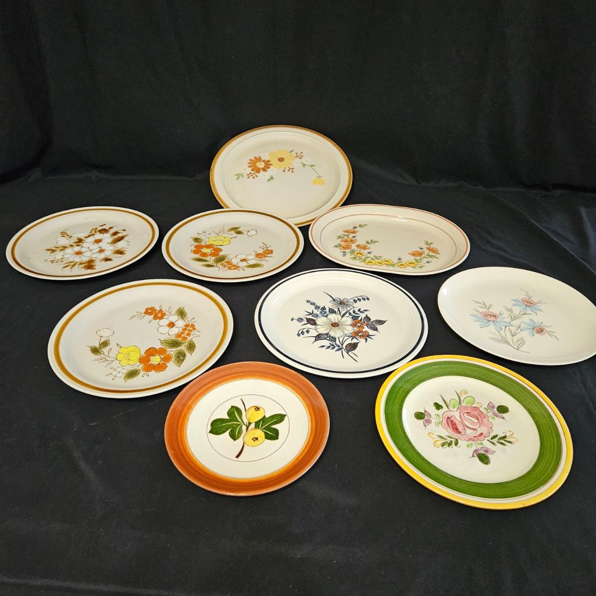 A collection of nine vintage floral plates. Includes multiple plates made by Mountain Wood Collection stoneware, CornerStone, Della-Ware, Town & Country, and more. The largest plate measures approximately 12.5"D. Shipping available