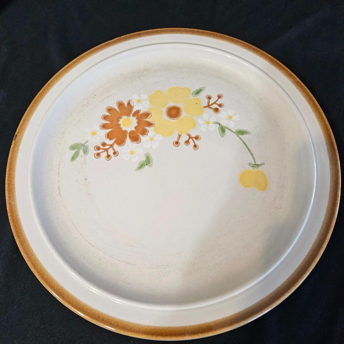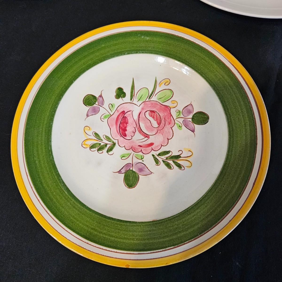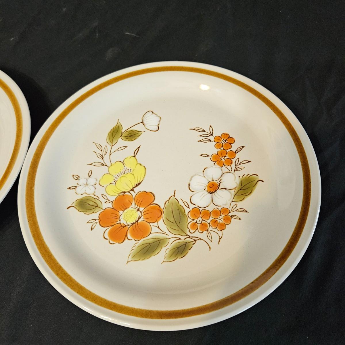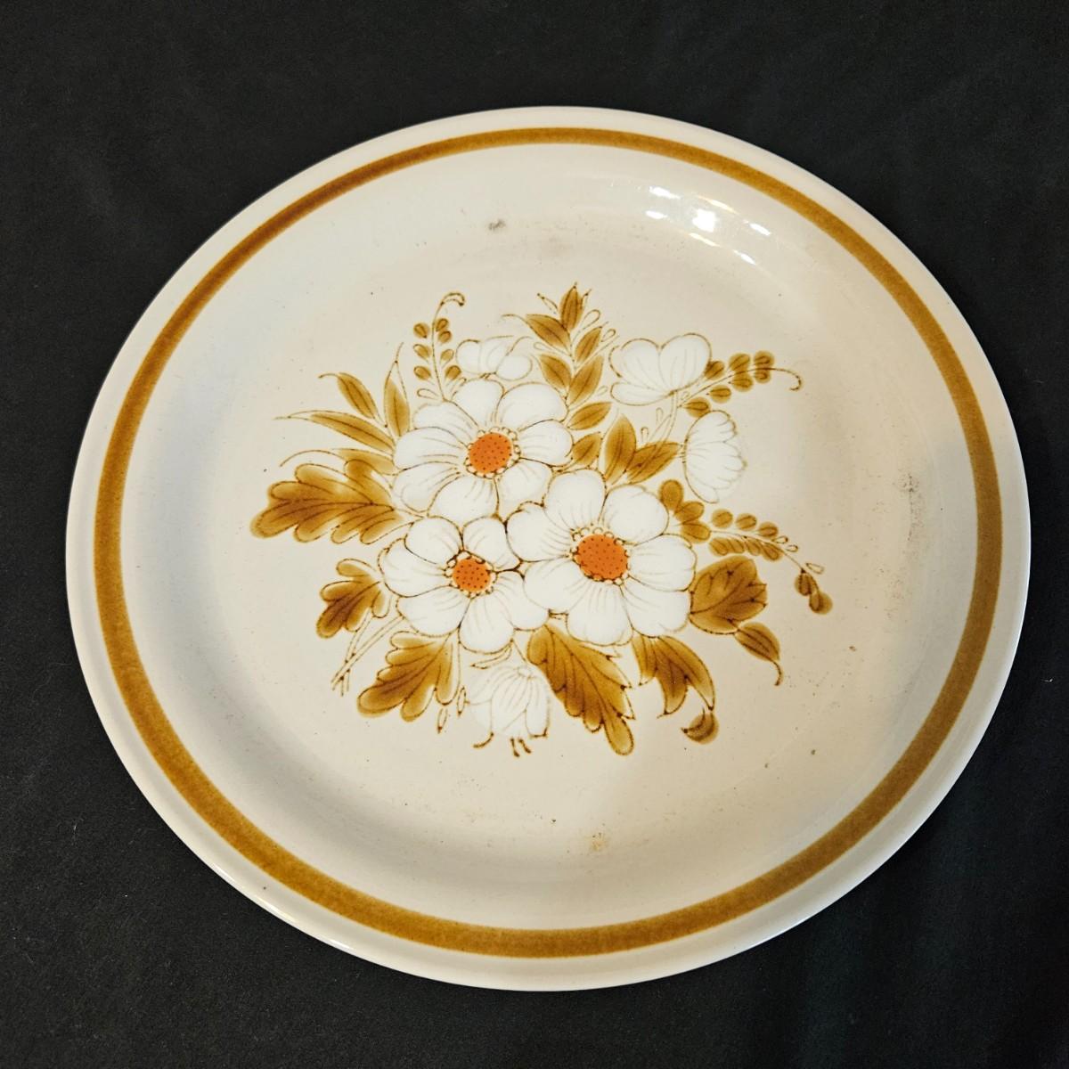 A collection of nine vintage floral plates. Includes multiple plates made by Mountain Wood Collection stoneware, CornerStone, Della-Ware, Town & Country, and more. The largest plate measures approximately 12.5"D. Shipping available