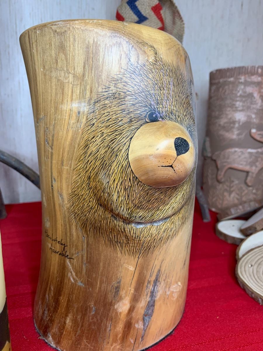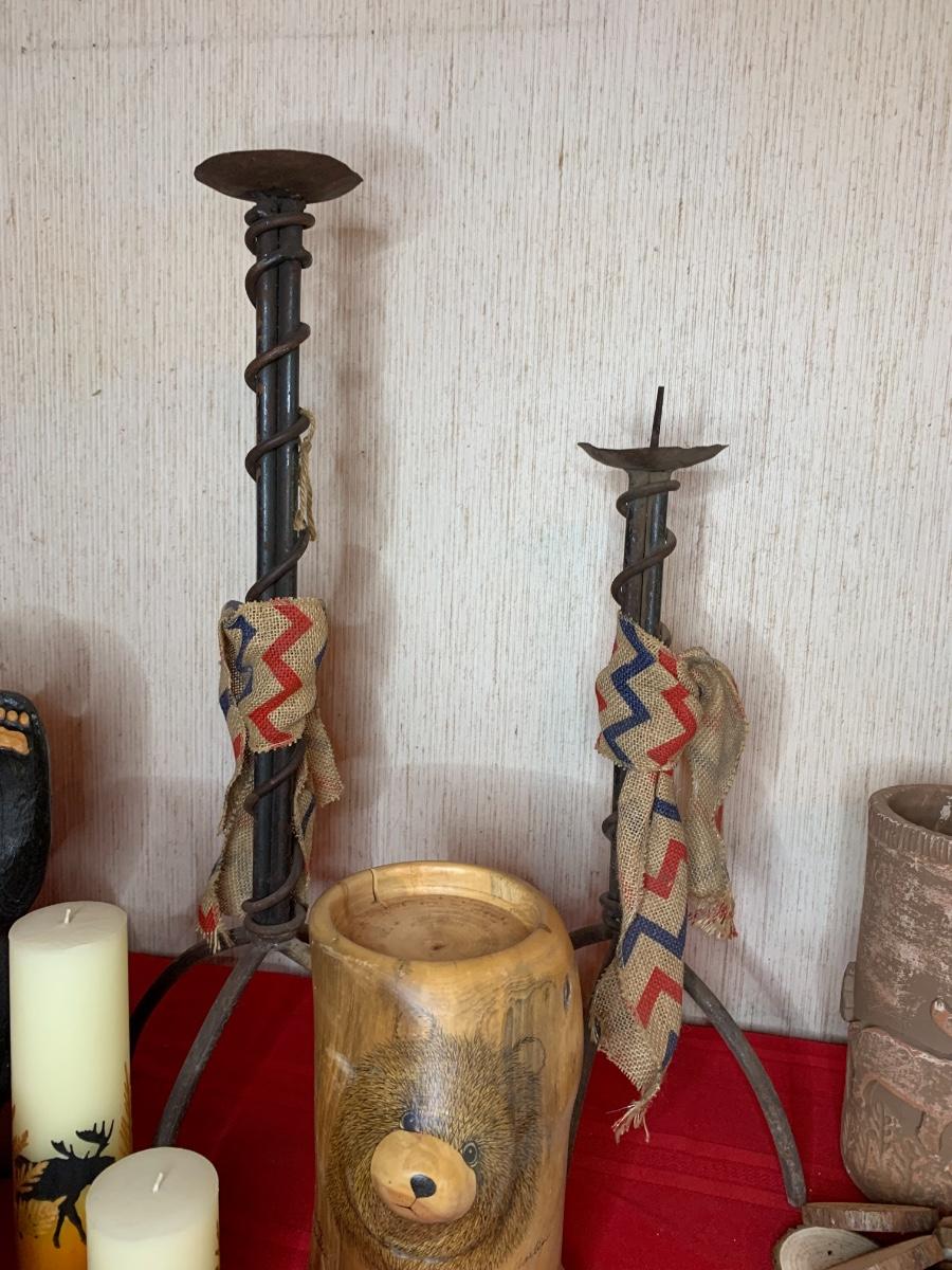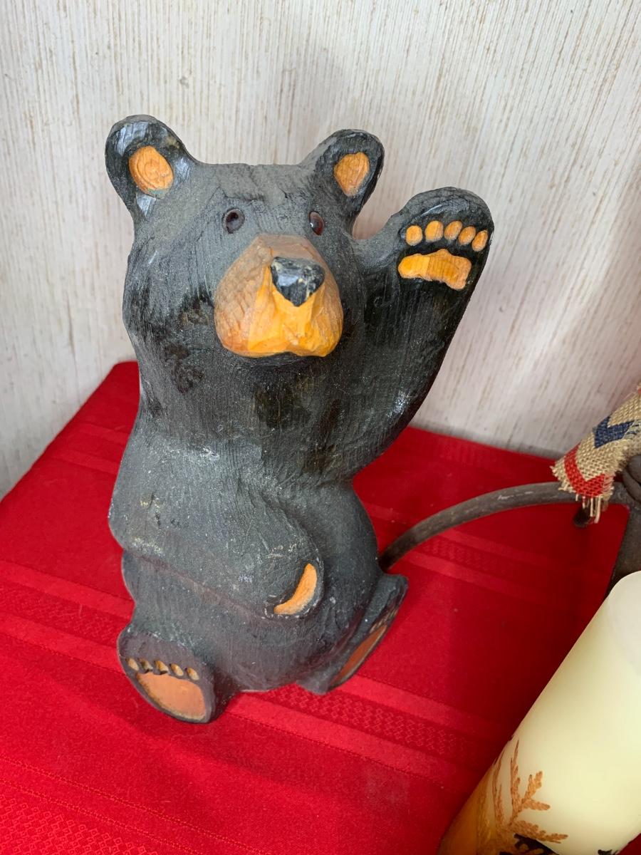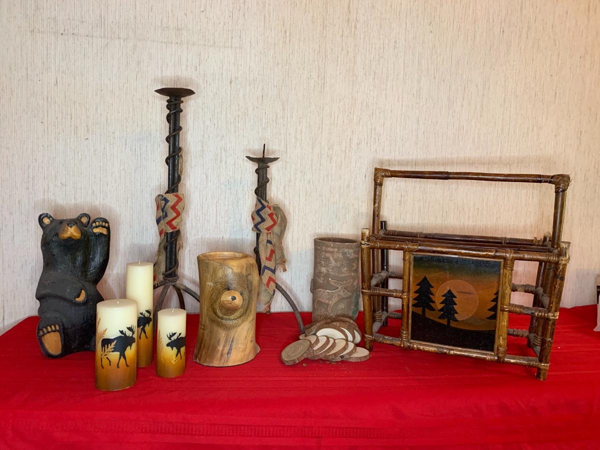 Misc mountain decor including wooden bear statue, two metal candle holders and magazine holder with a lot of chew marks in poor condition