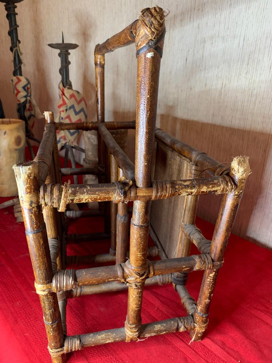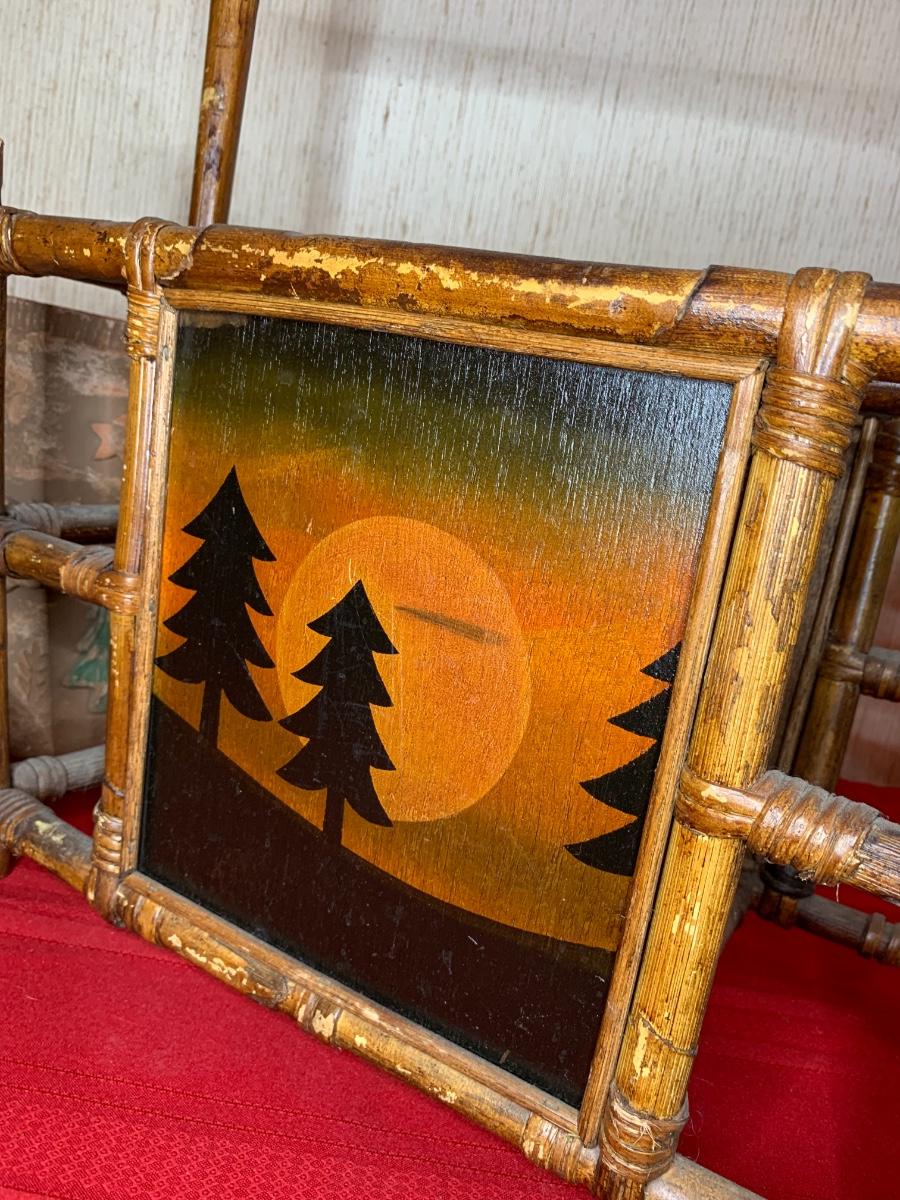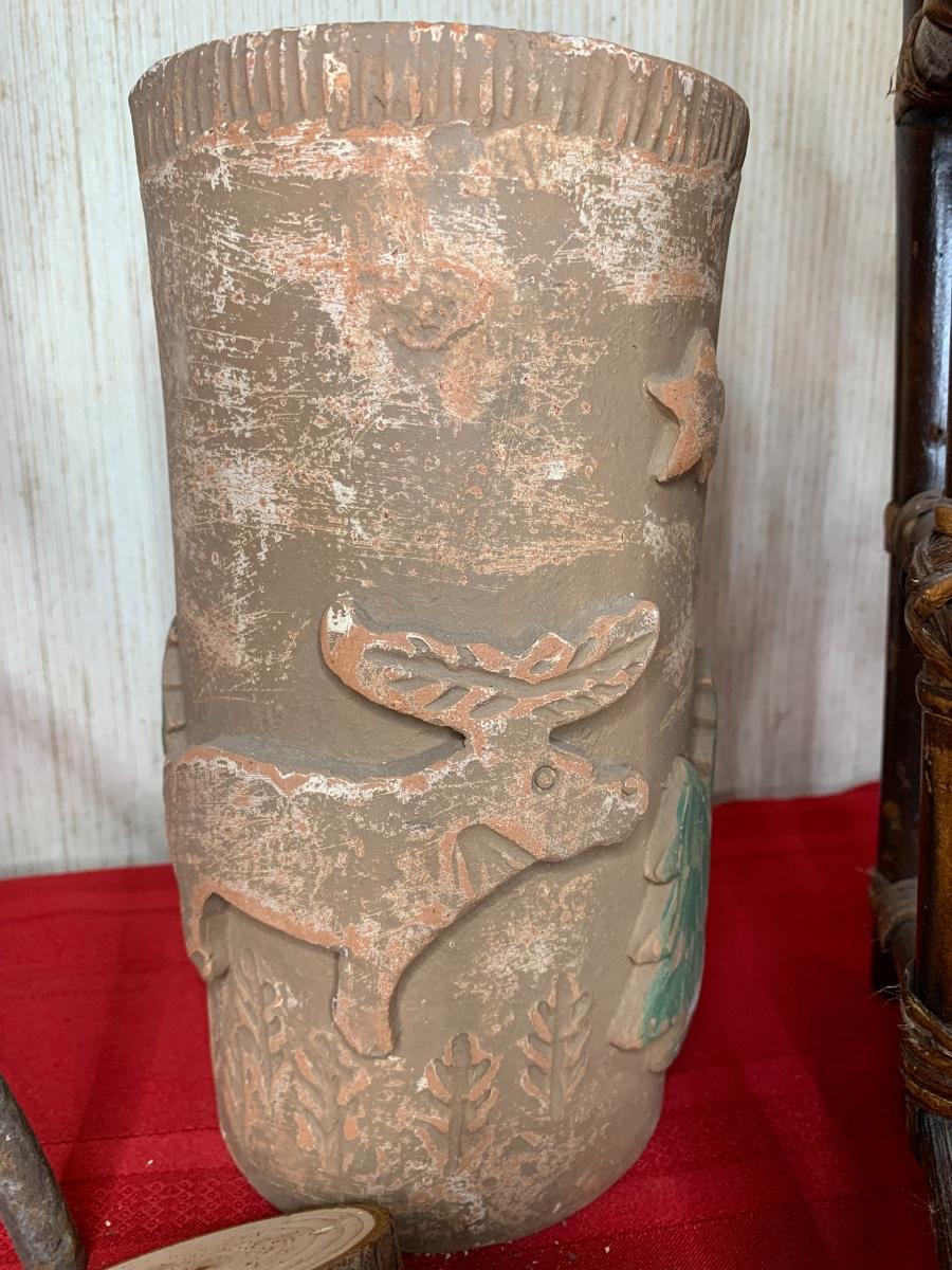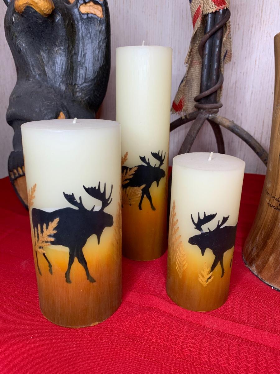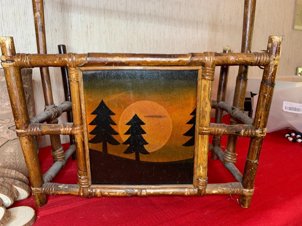 Misc mountain decor including wooden bear statue, two metal candle holders and magazine holder with a lot of chew marks in poor condition