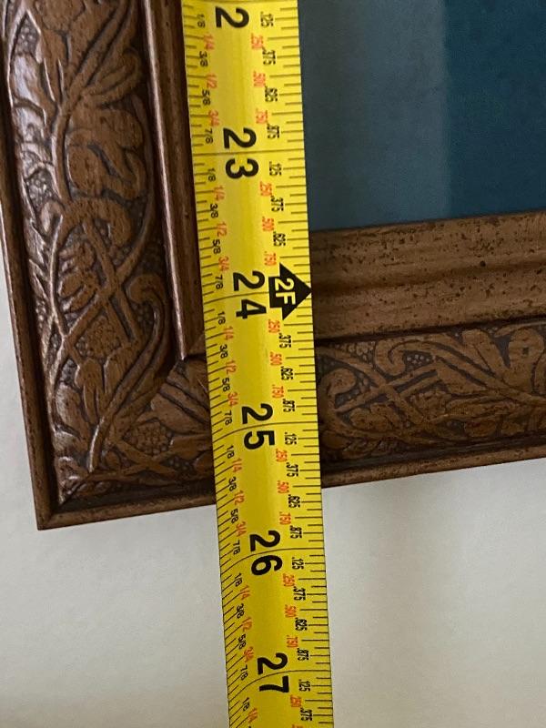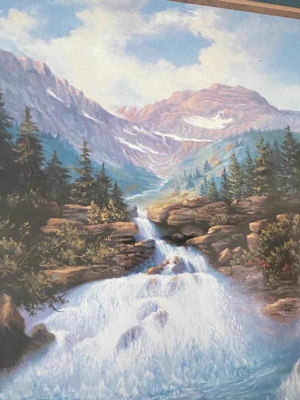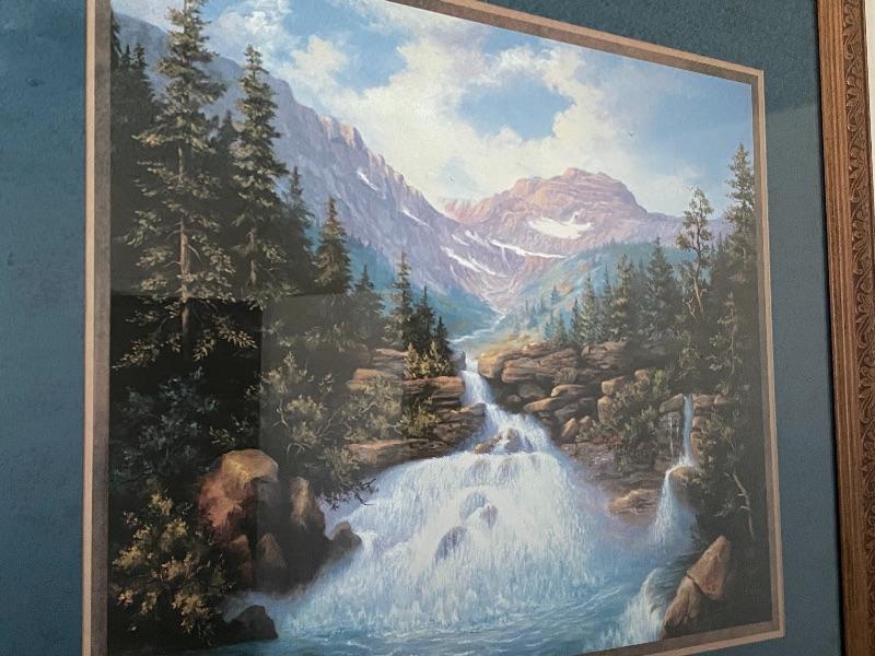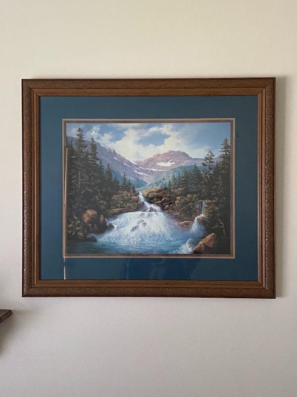 Similar to the mountains and stream print. This is a larger framed print about 30"x26". Nice wood frame.