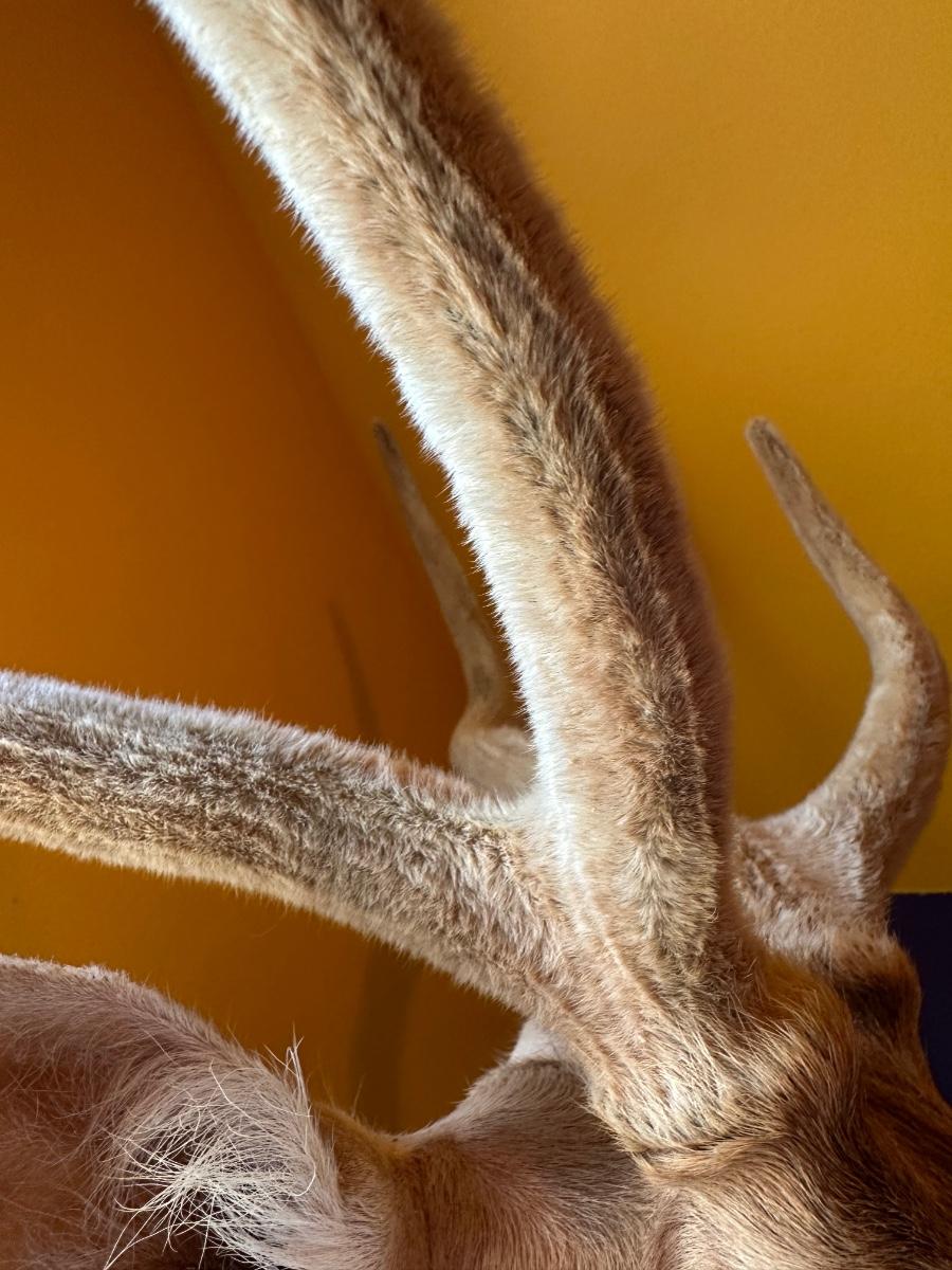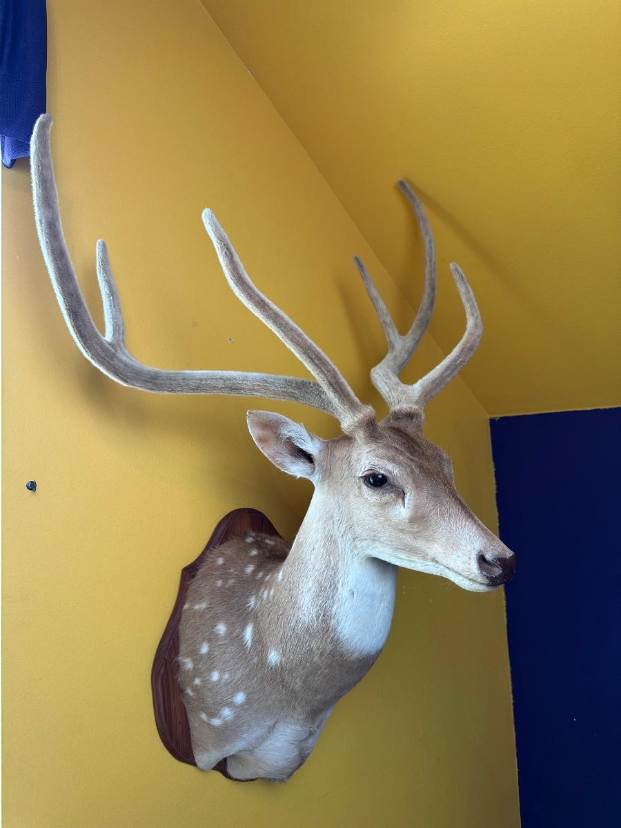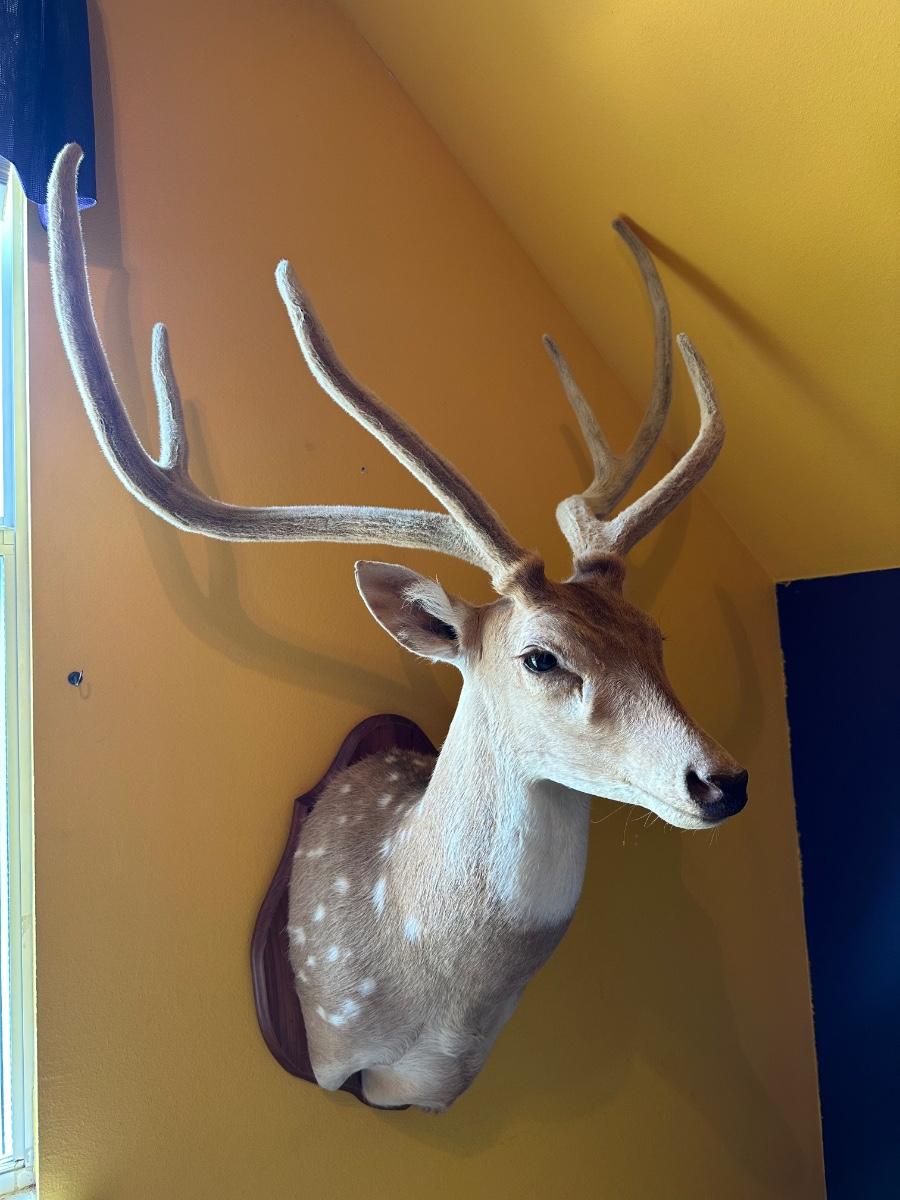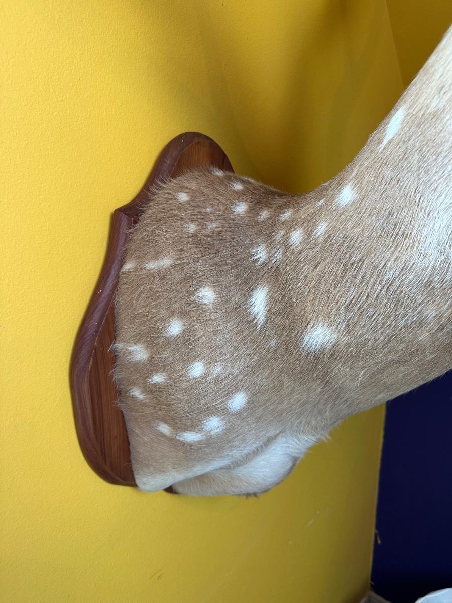 Large mounted fallow deer shoulder mount featuring a wood plaque. The antlers are covered in velvet,