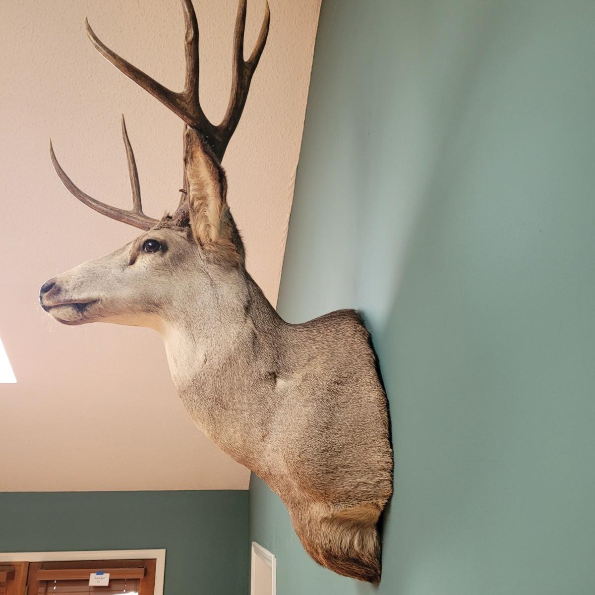 This mule deer (non native NC species) measures approximately 31” from tip of snout to bottom of front. Local pick up only. Winning bidder must bring assistance to remove mount from wall.