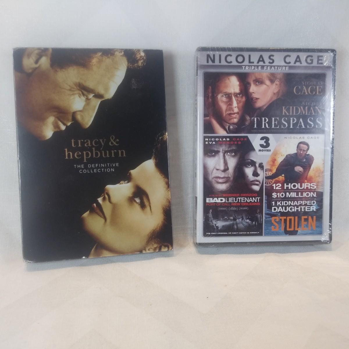 This auction lot is an offering of Movie Night Classics with 2 boxed sets of multiple movies. Tracy and Hepburn and Nicolas Cage. They are unopened and still in shrink wrap.