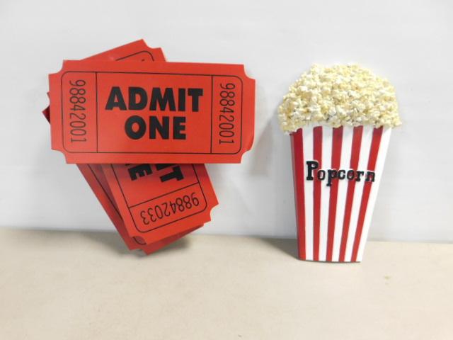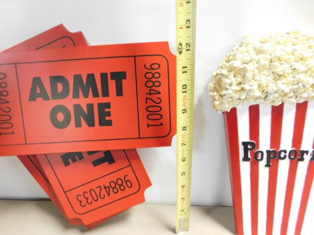 Movie Time Wall Art Metal Ticket Stubs and Resin Popcorn Bucket 13" ticket stubs have some minor bends on the corners