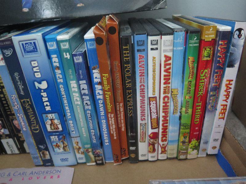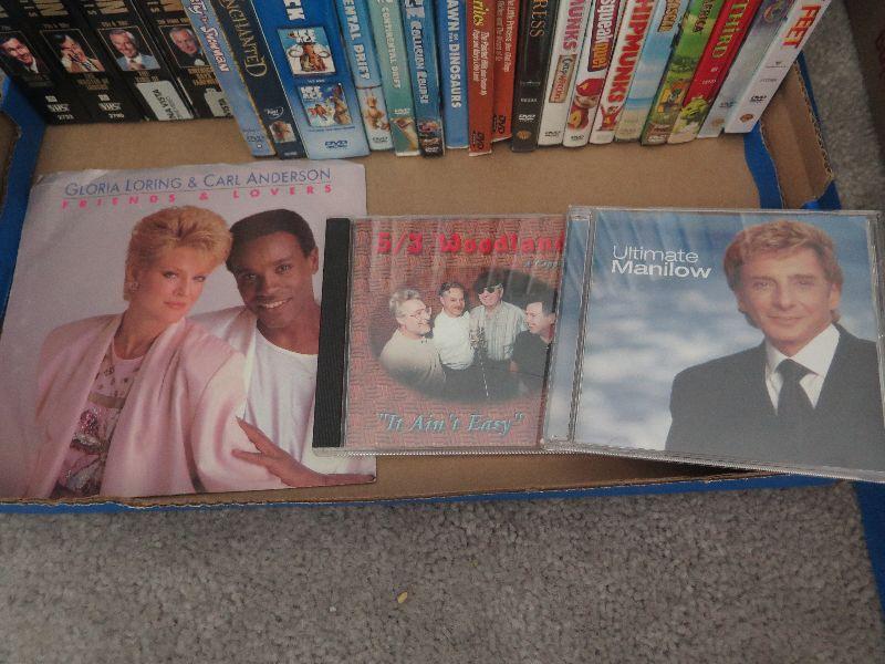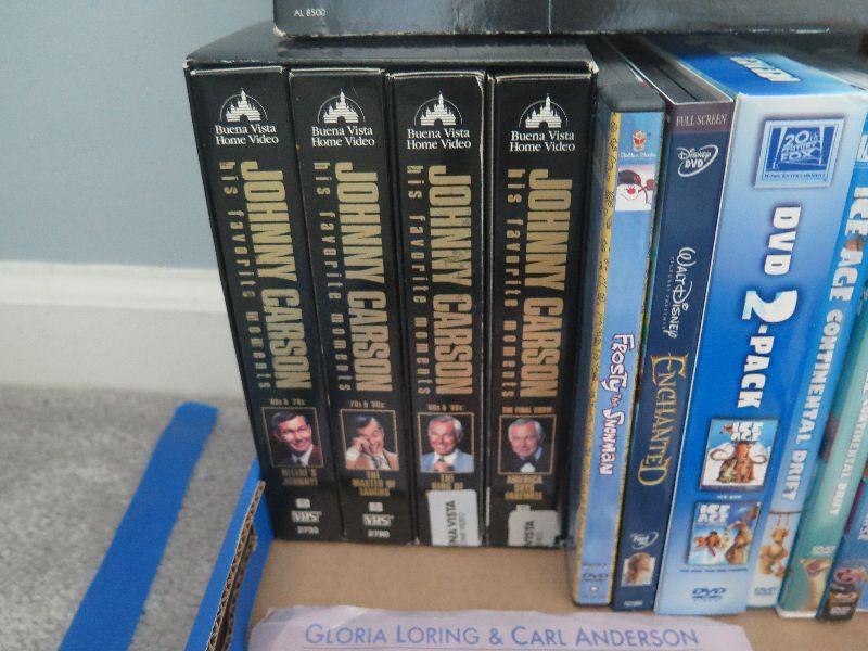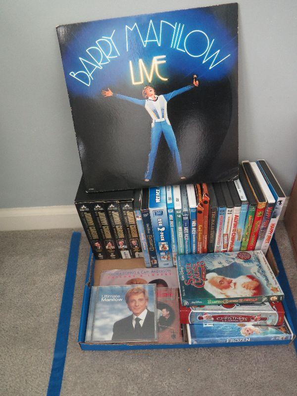 Barry Manilow vinyl and cd, Johnny Carson on VHS, and children's movies on DVD. Bring box to move. **Please read Terms and Conditions before placing a bid. Pick up is Wednesday July 31st, from 2 pm to 7pm in Sicklerville. All sales are final. All sales are as is, where is. Please review all photos. Any props included in photos are not included in listing. All measurements are approximate.