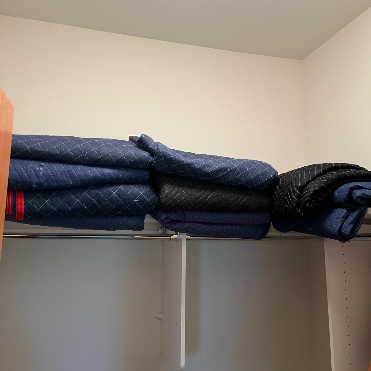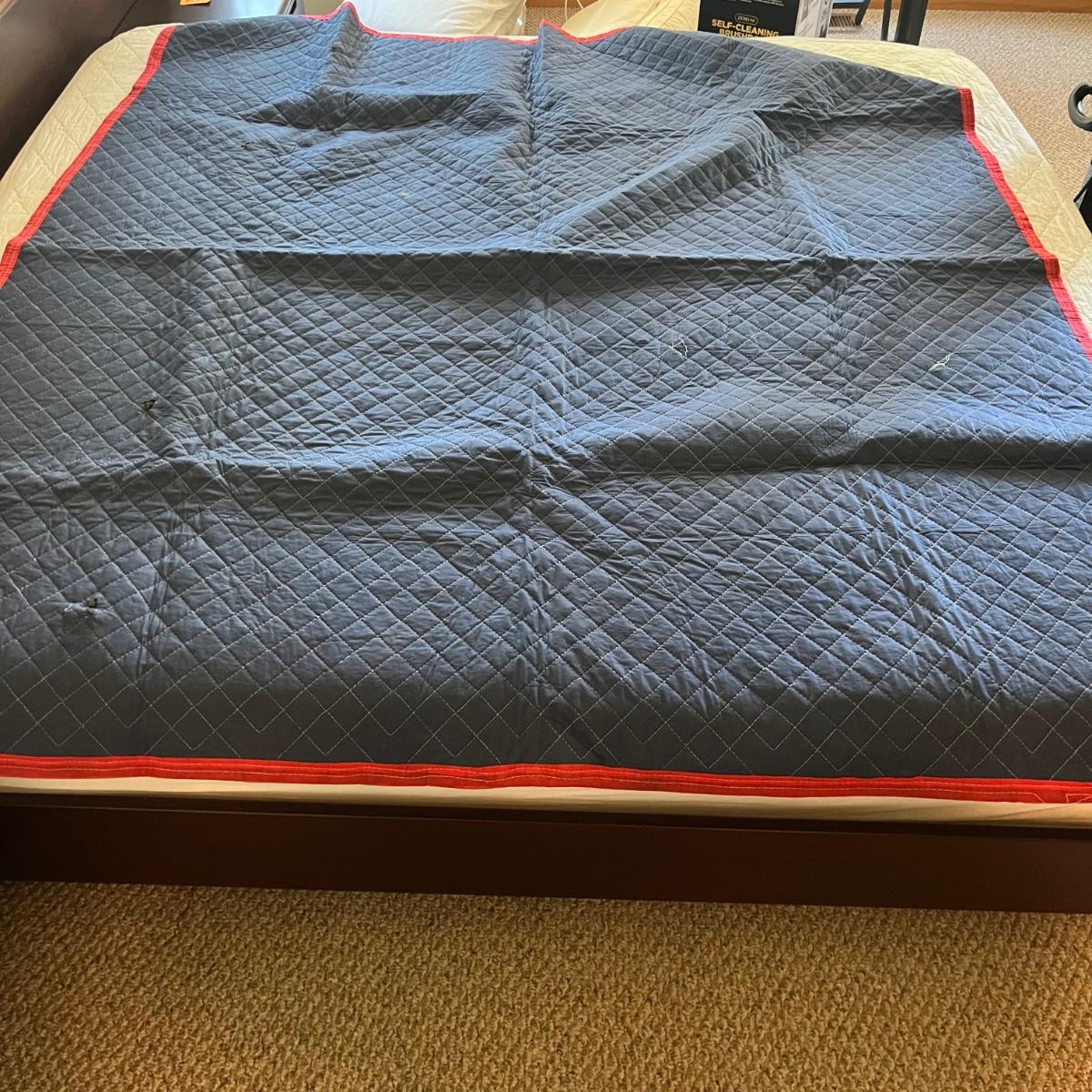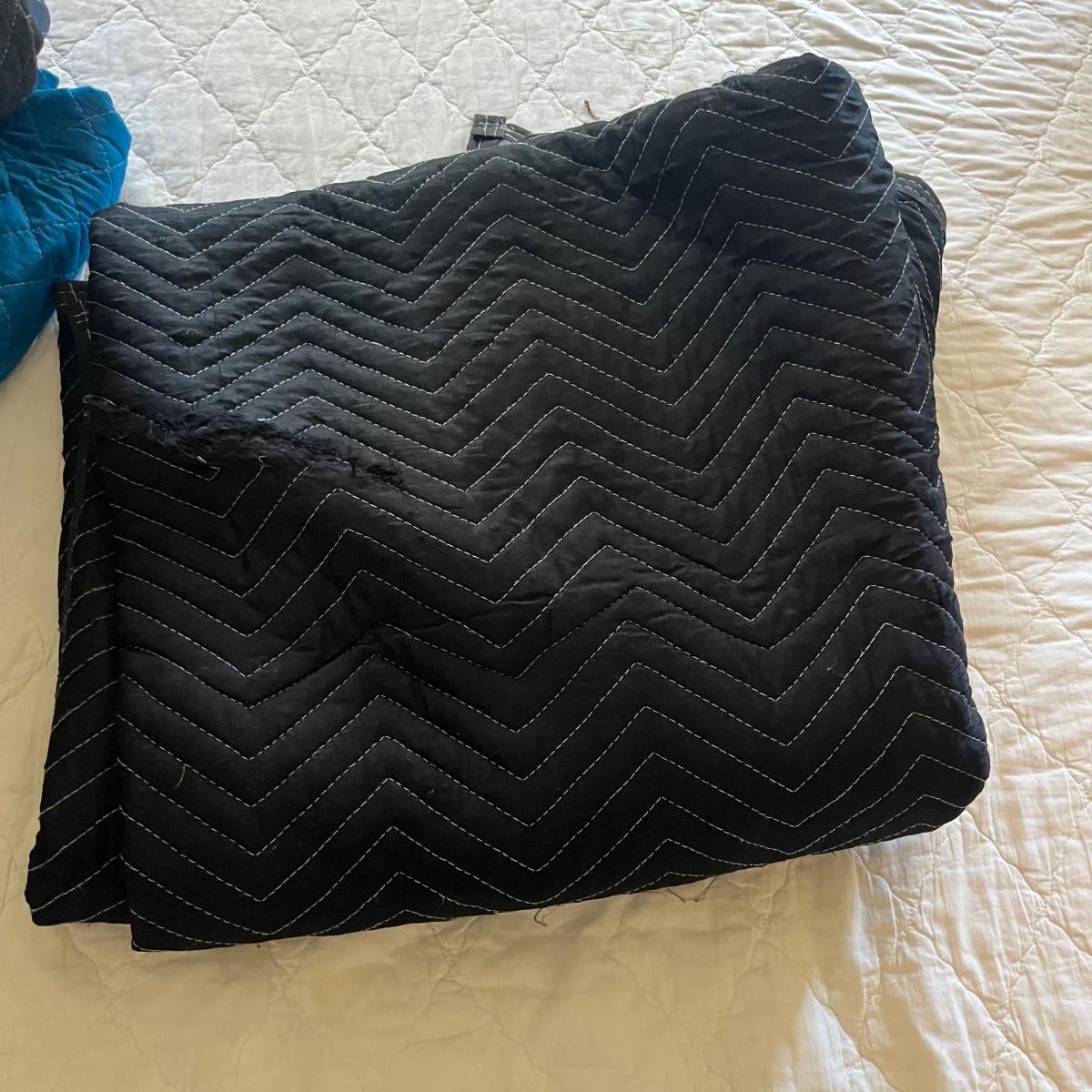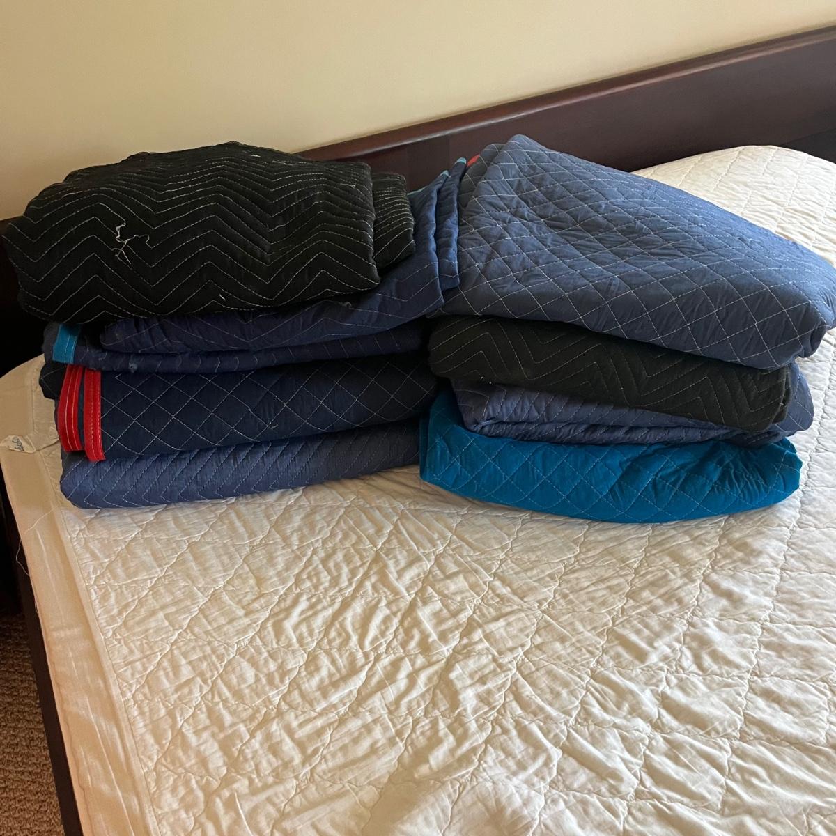 Lot includes nine move blankets with average size being 72” x 78”. Blankets have some holes and loose threads.