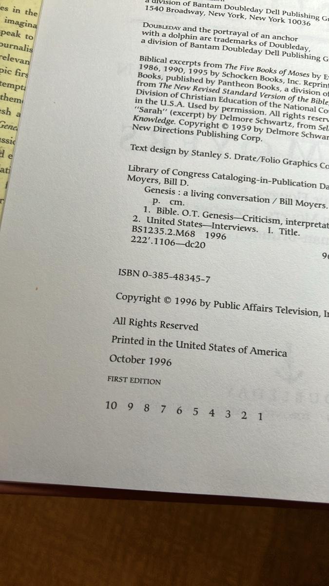 “Genesis: A Living Conversation" by Bill Moyers, a signed 1st edition book. This companion to the public television series features a striking cover with abstract artwork and insightful discussions. Perfect for collectors and fans. Condition and additional details available upon request.