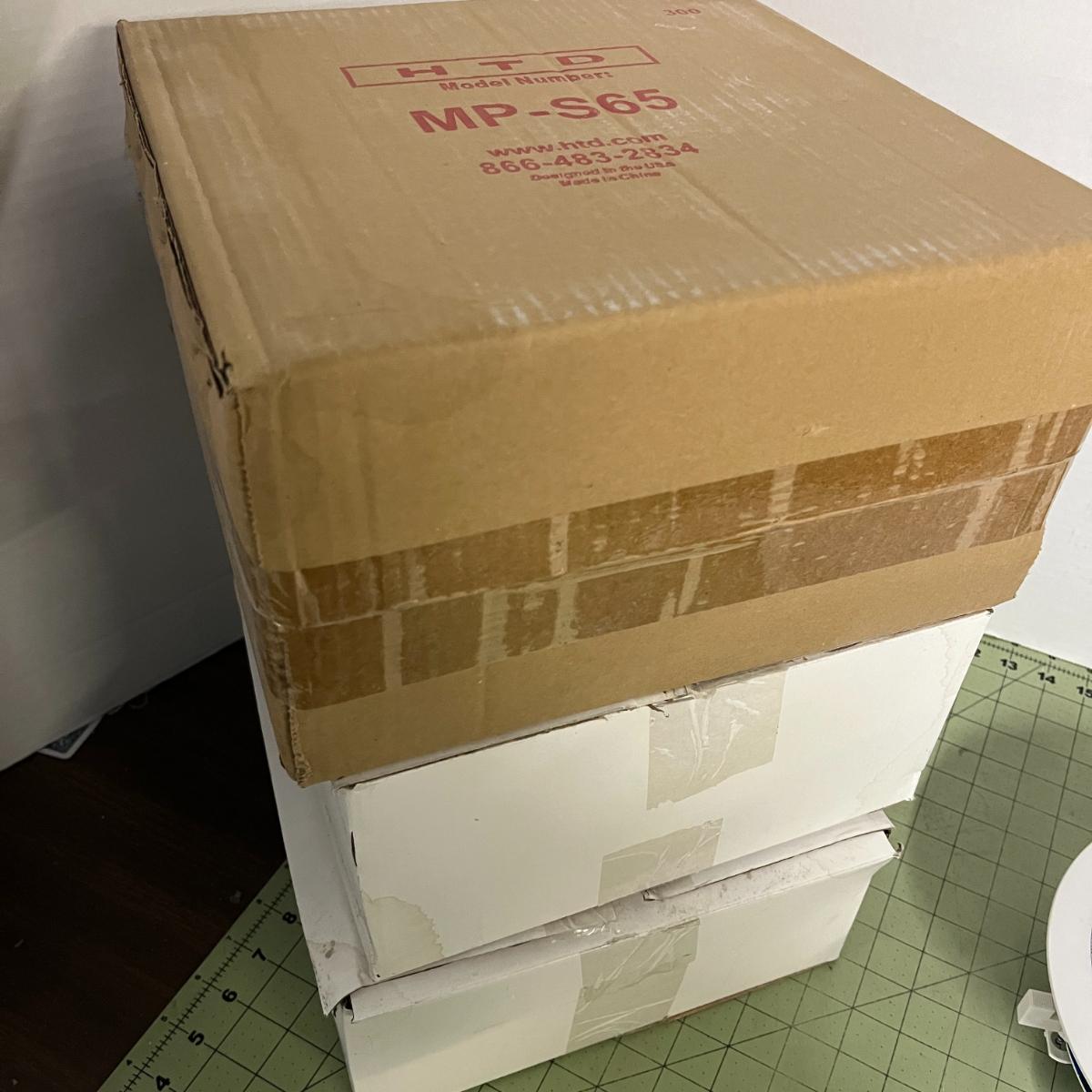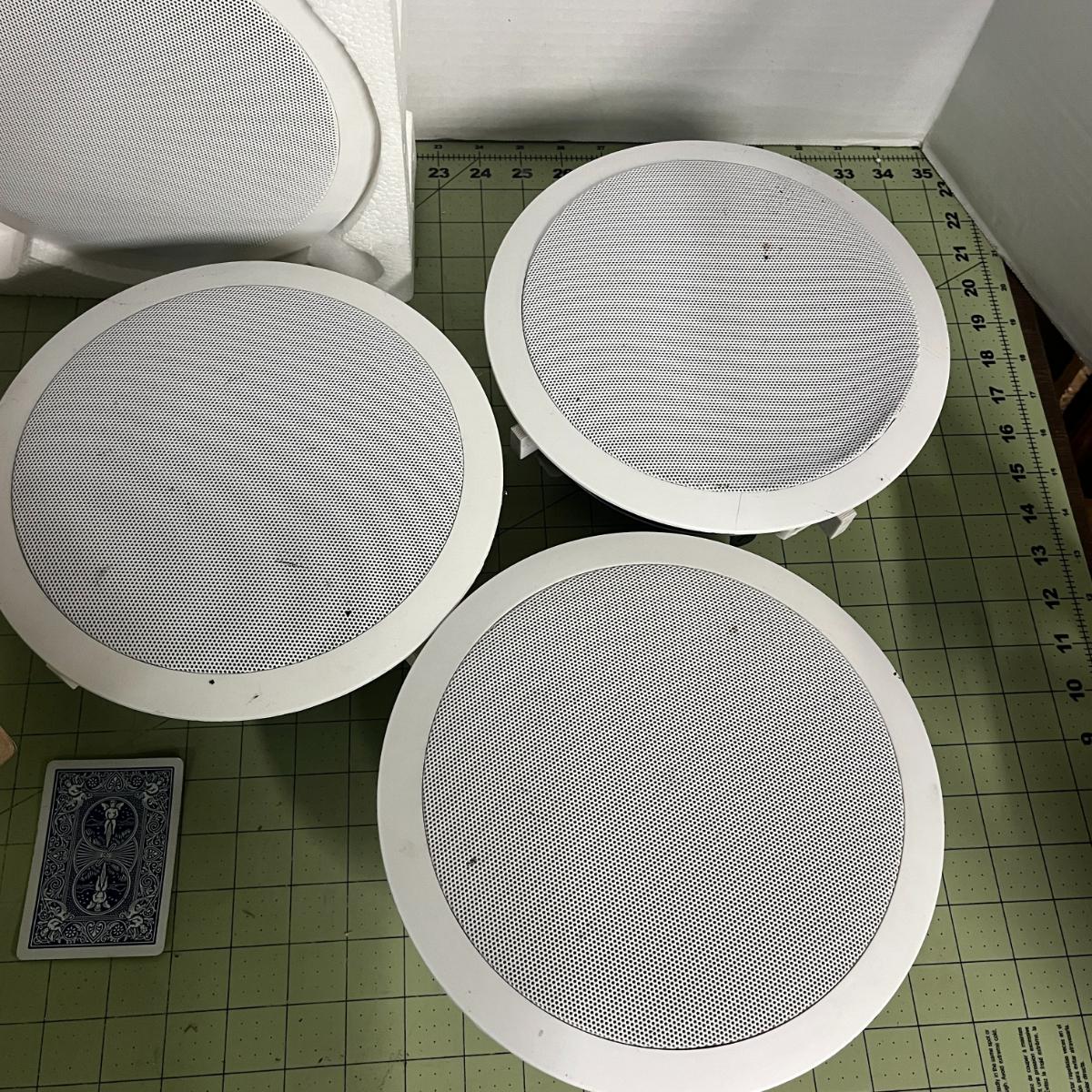 Includes 3 boxed, 3 loose speakers; round white grille design.